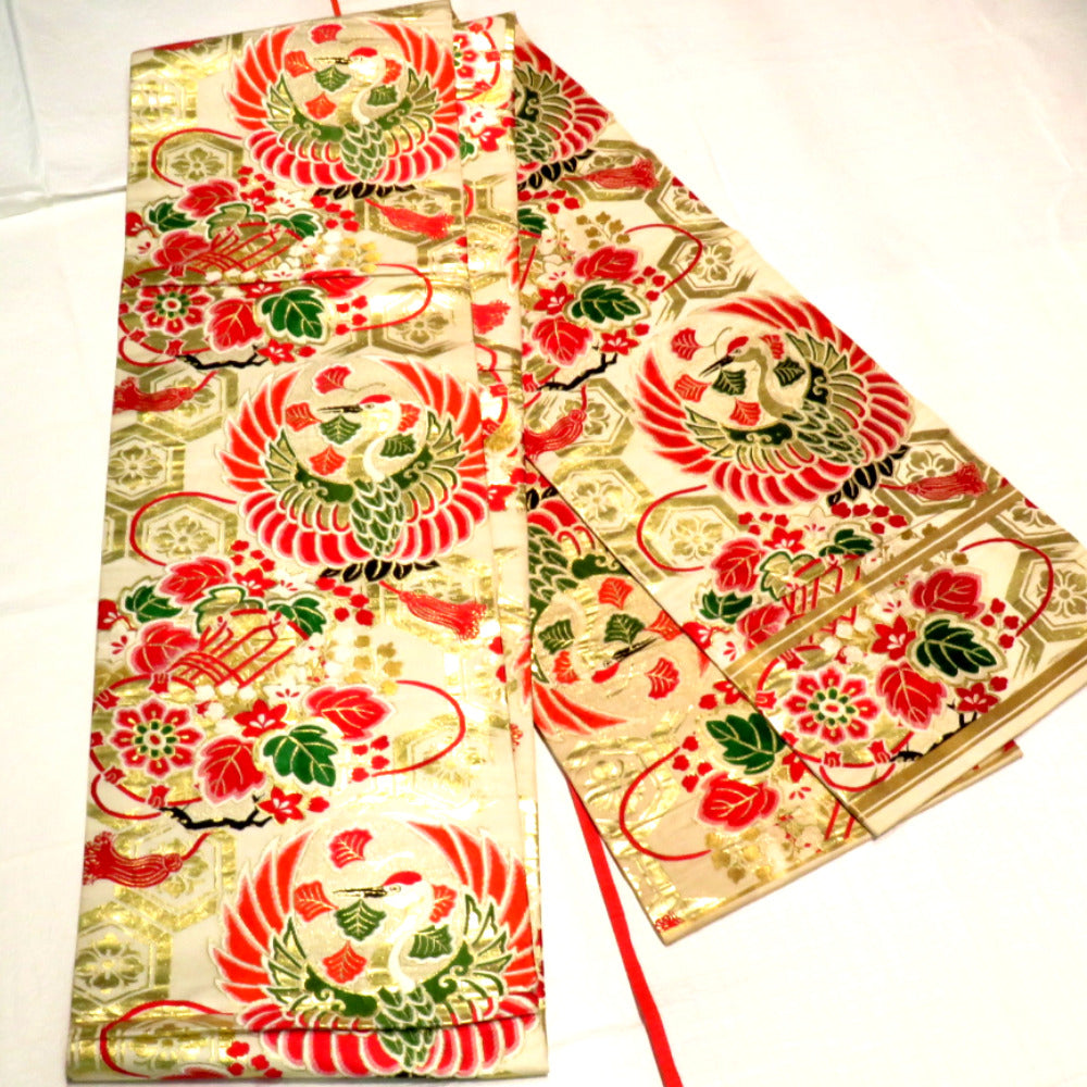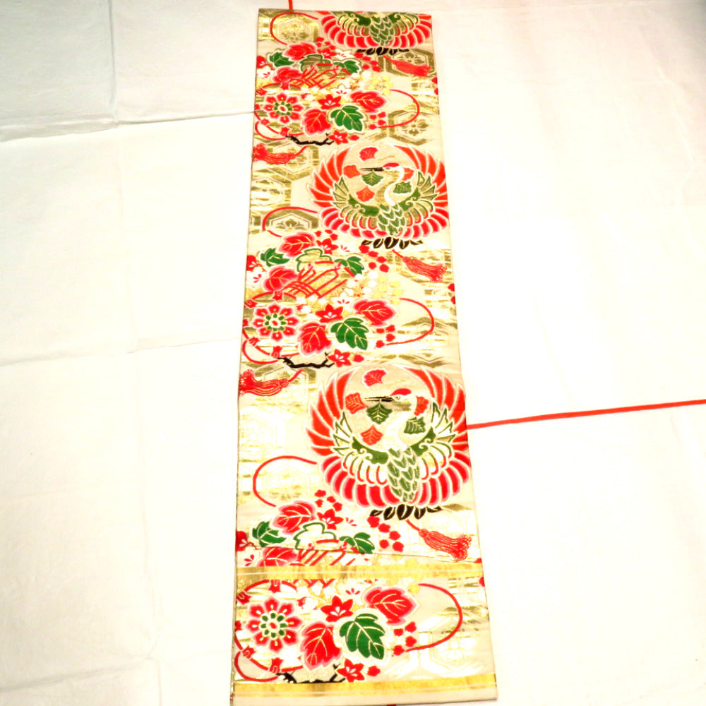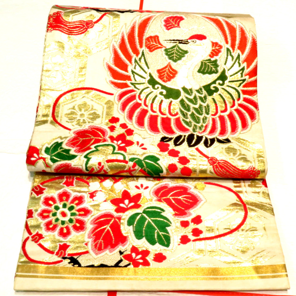 Title Antique Kimono Maru Obi Silk crane floral pattern Beige 162.8inch Women's