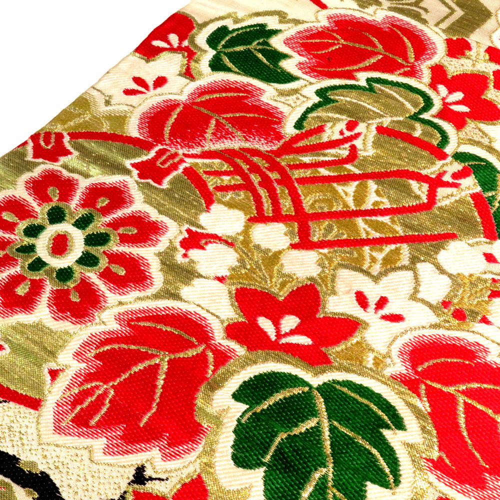 人気の昔帯(丸帯)です!御所車 鶴 松 花の華やかなデザイン。