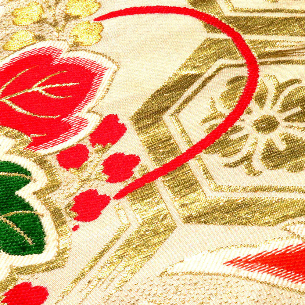 丸帯 アンティーク帯 昔丸帯 絹 薄ベージュ×多色 鼓 鶴 花文様 全通柄 昔帯 レトロモダン 明治・大正ロマン 長さ413.5cm