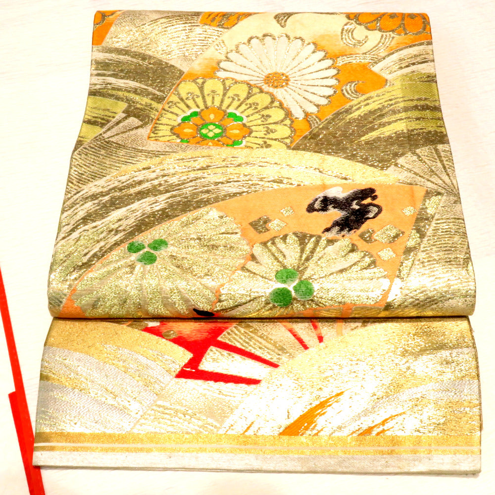 人気の昔帯(丸帯)です!大きな扇 花々の華やかなデザイン。
