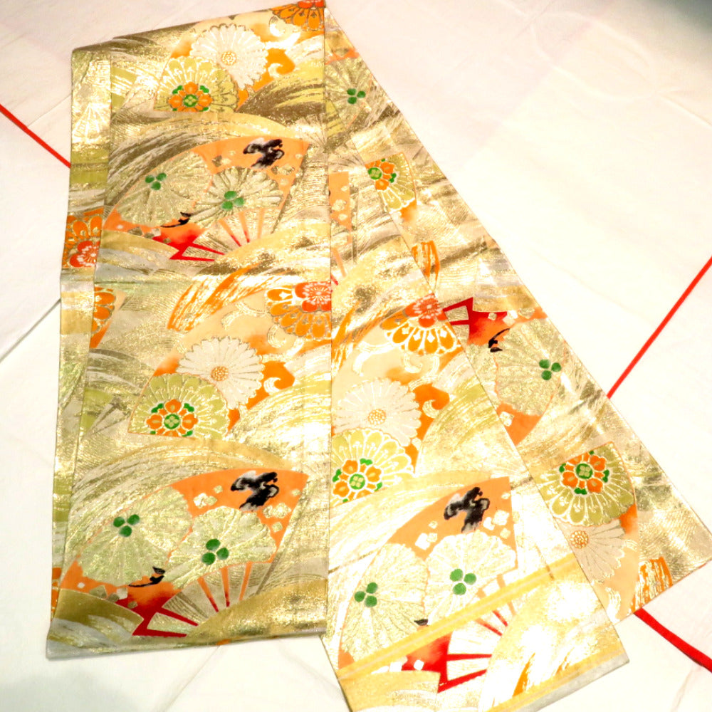 Title Antique Kimono Maru Obi Silk Fan with floral pattern Gold 155.1inch Women's