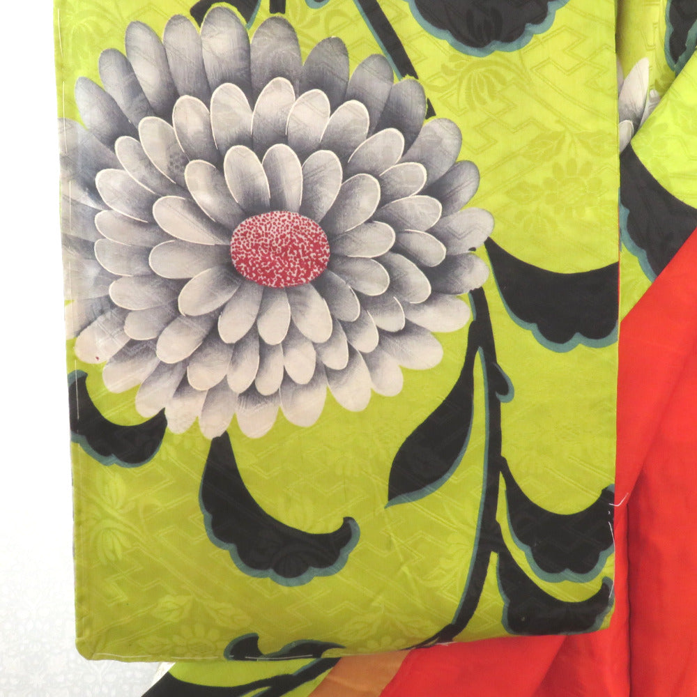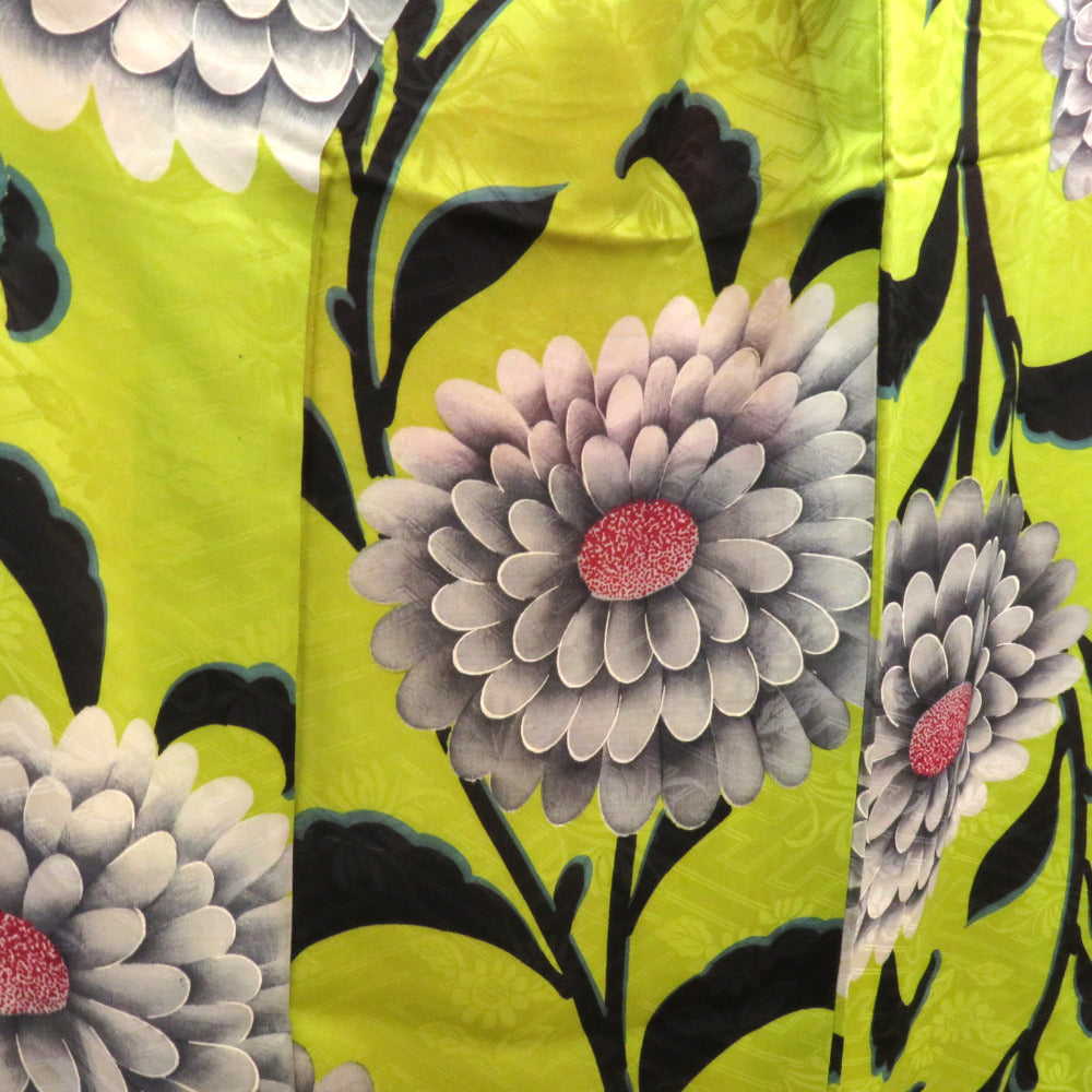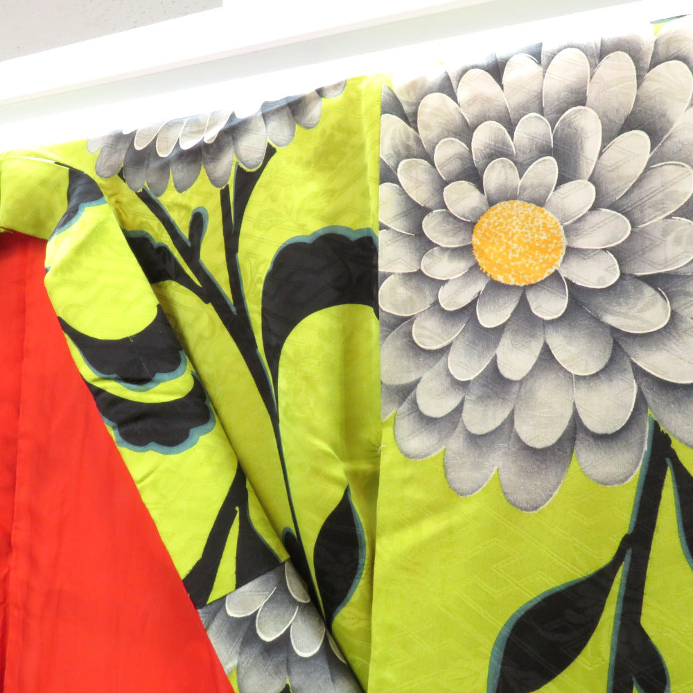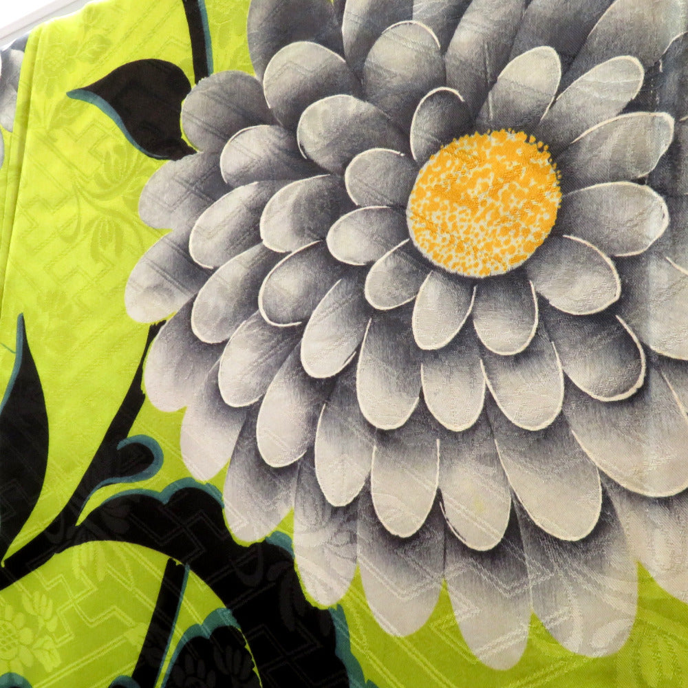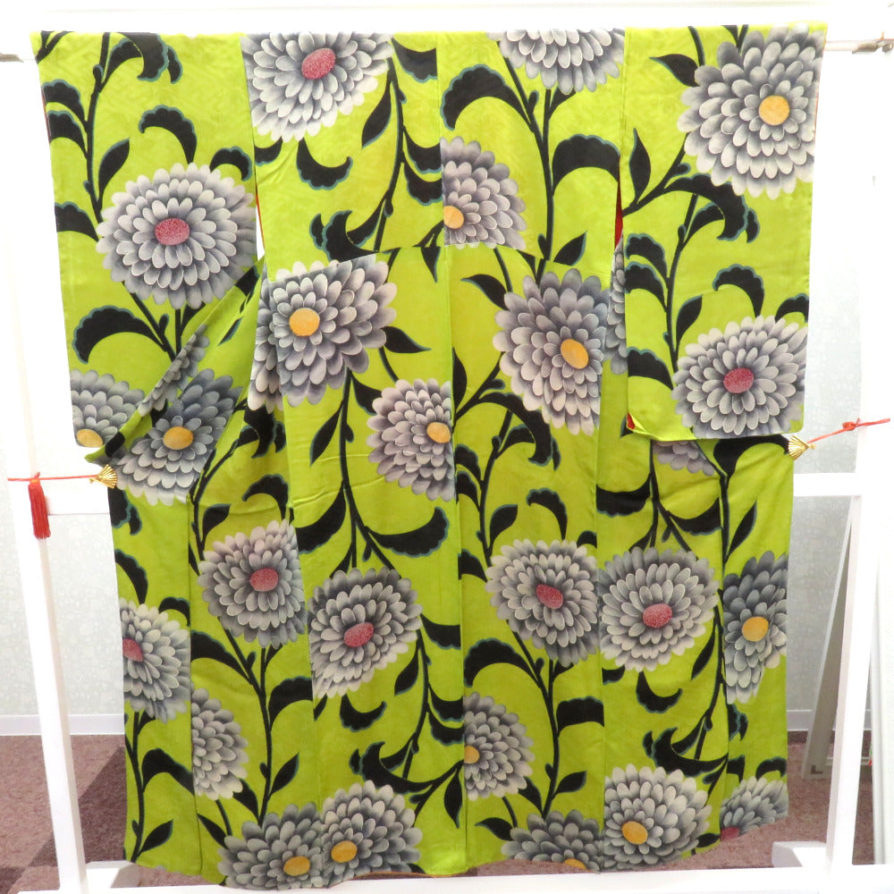 鮮やかな黄緑地に目を引く大花デザインのアンティーク着物でございます。