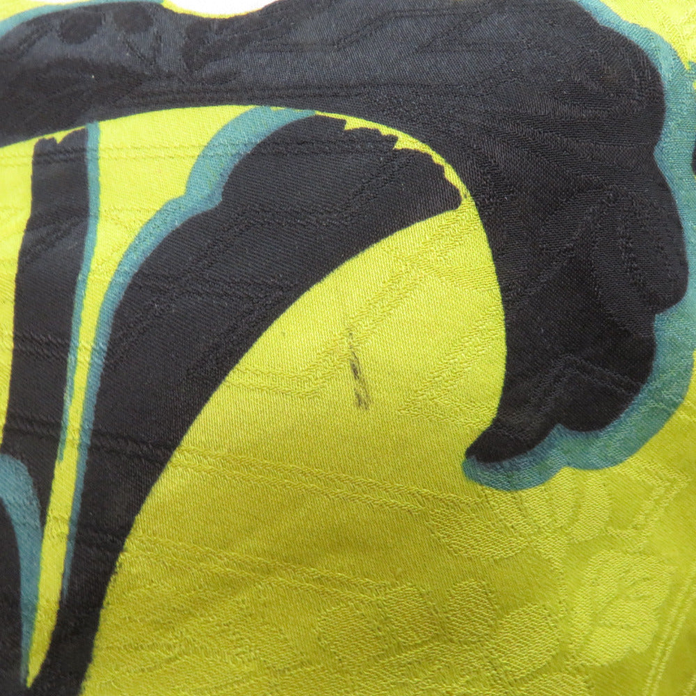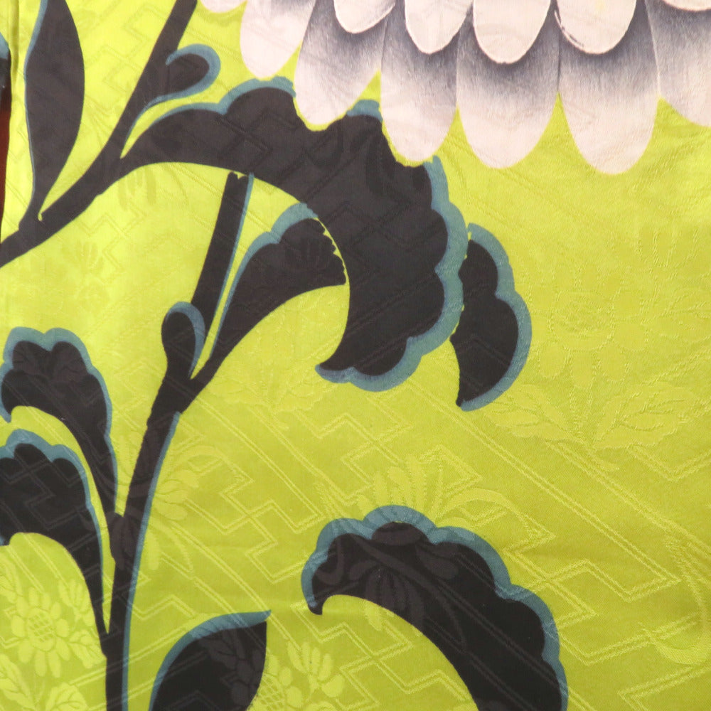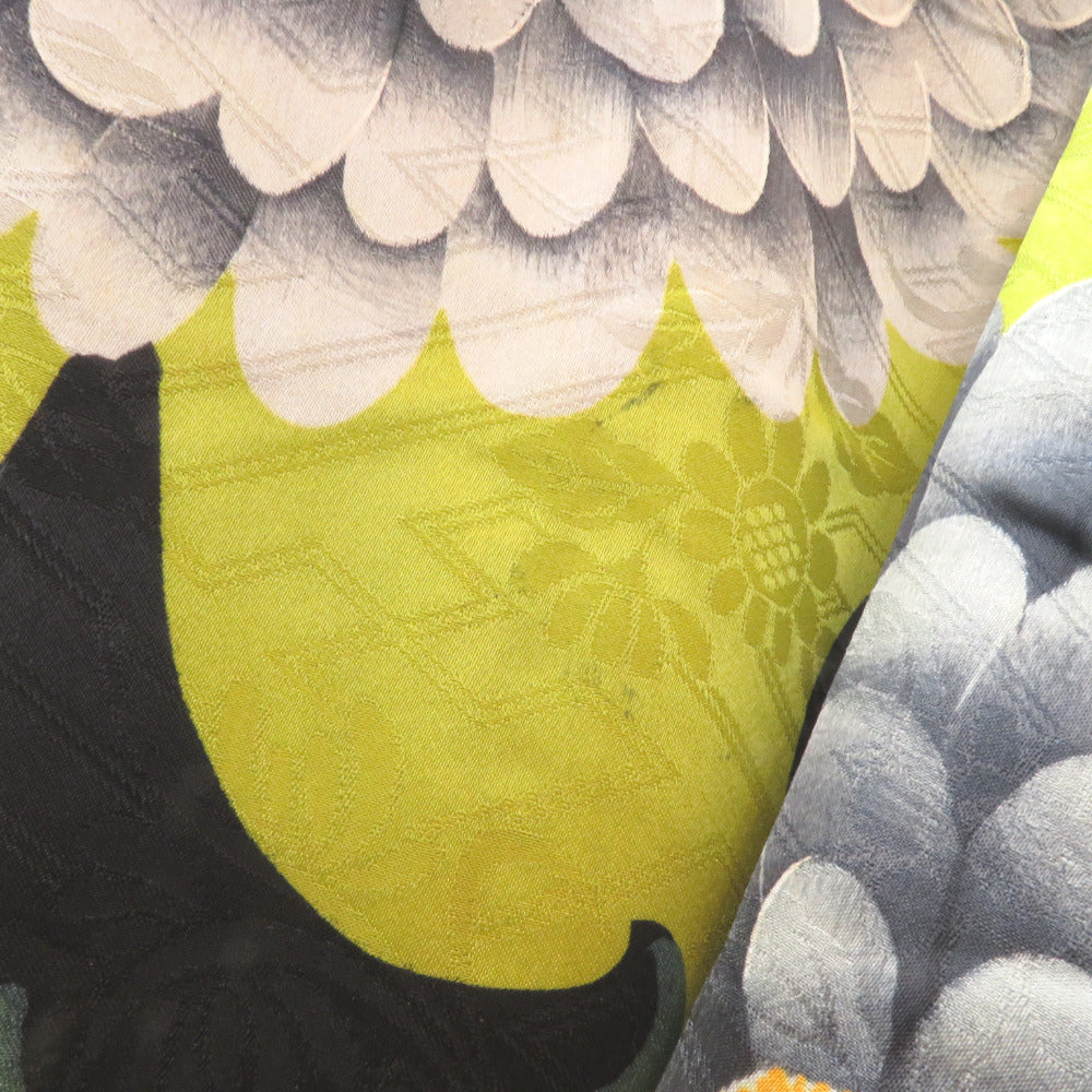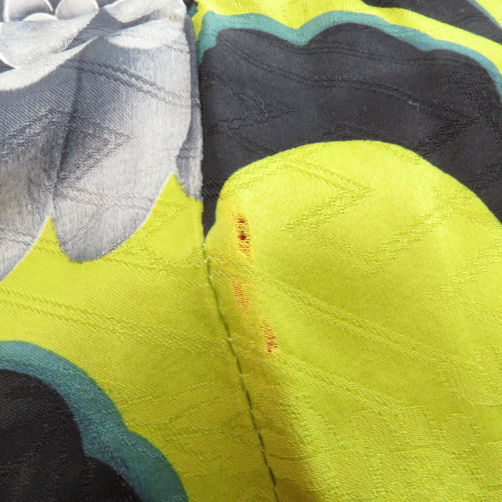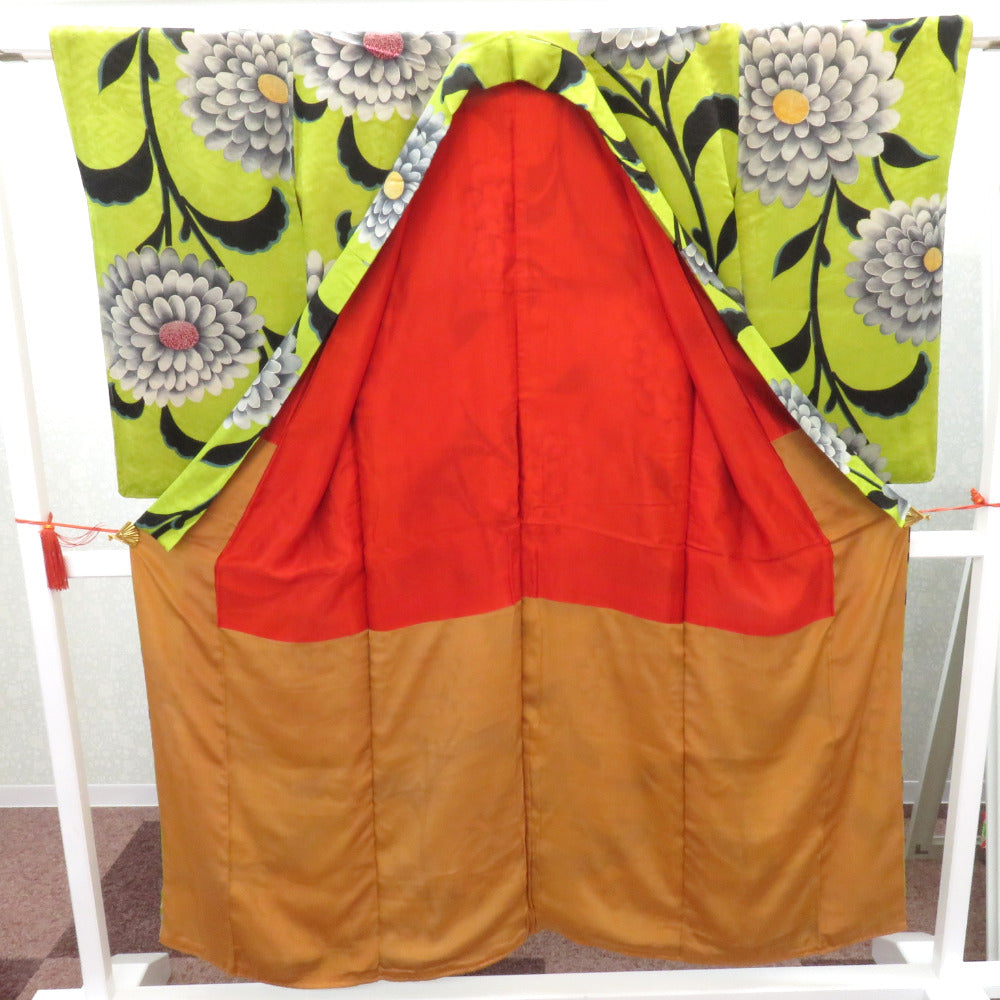 鮮やかな黄緑地に目を引く大花デザインのアンティーク着物でございます。