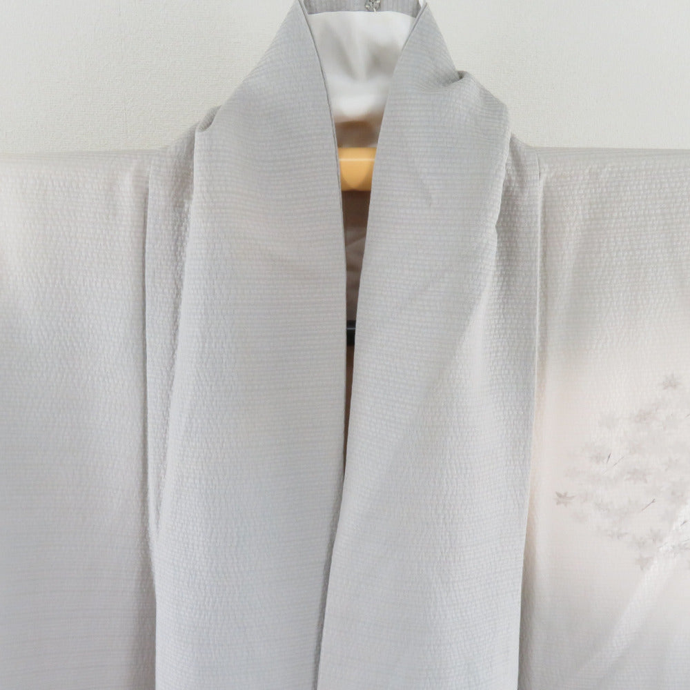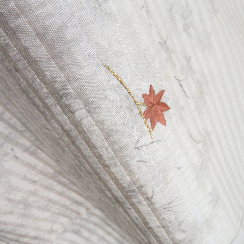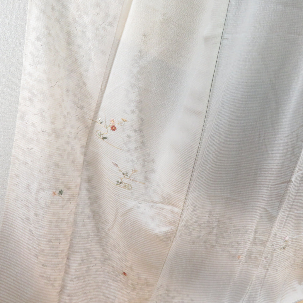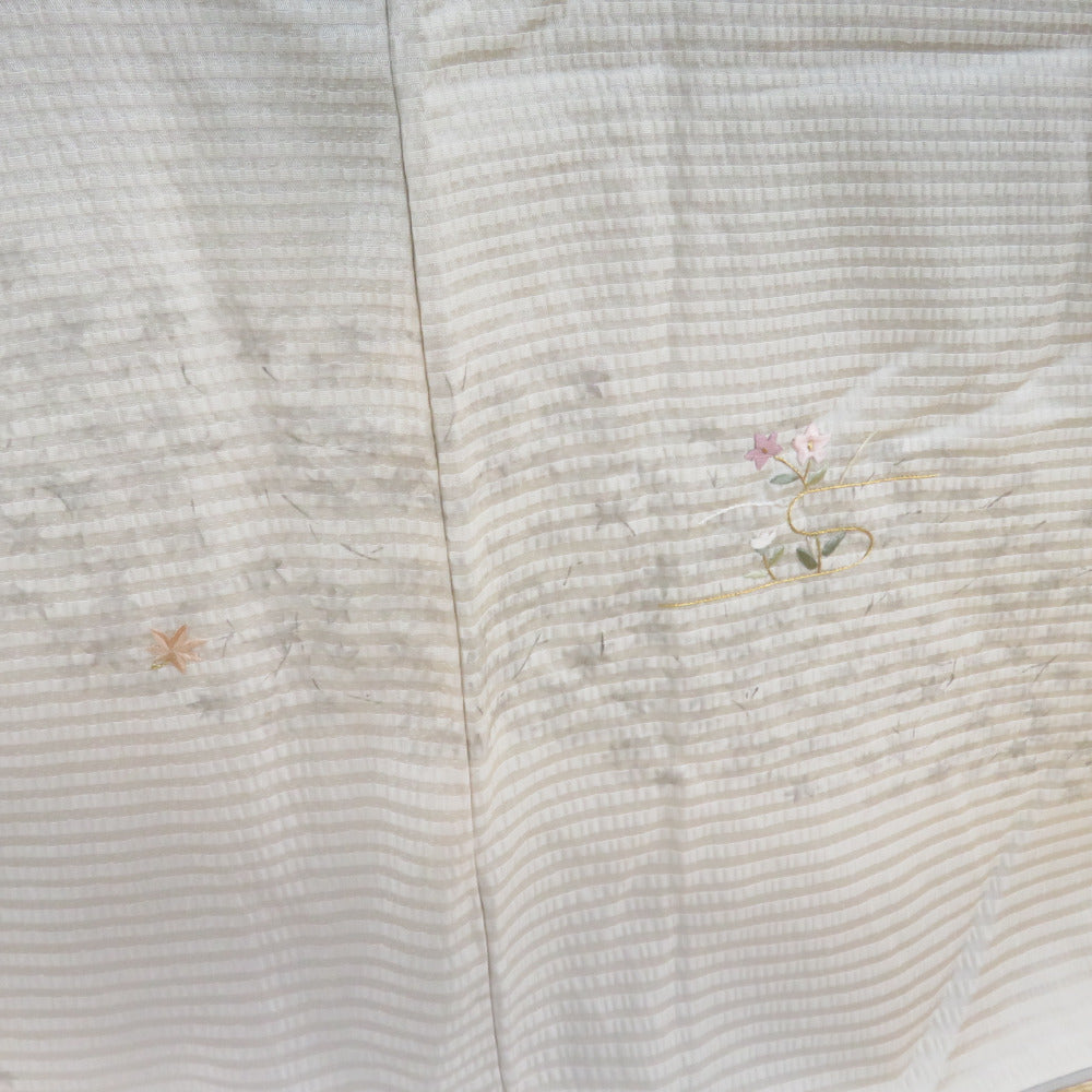 訪問着 刺繍 暈し 紅葉に秋草文様 灰ベージュ色 袷 広衿 正絹 一つ紋 木瓜紋 仕立て上がり着物 身丈159cm
