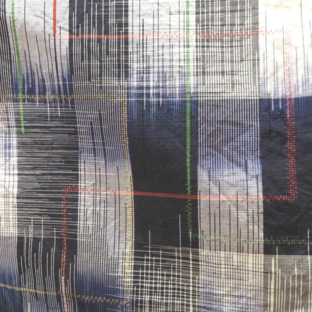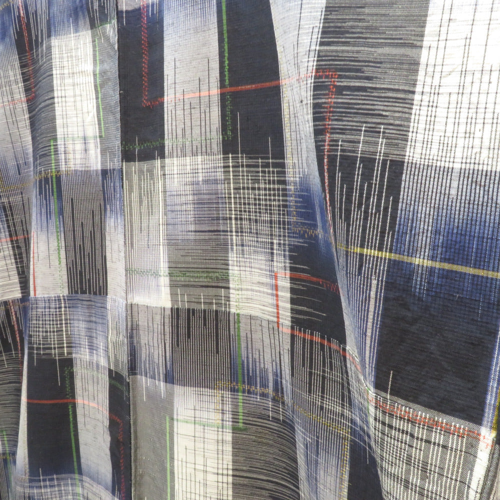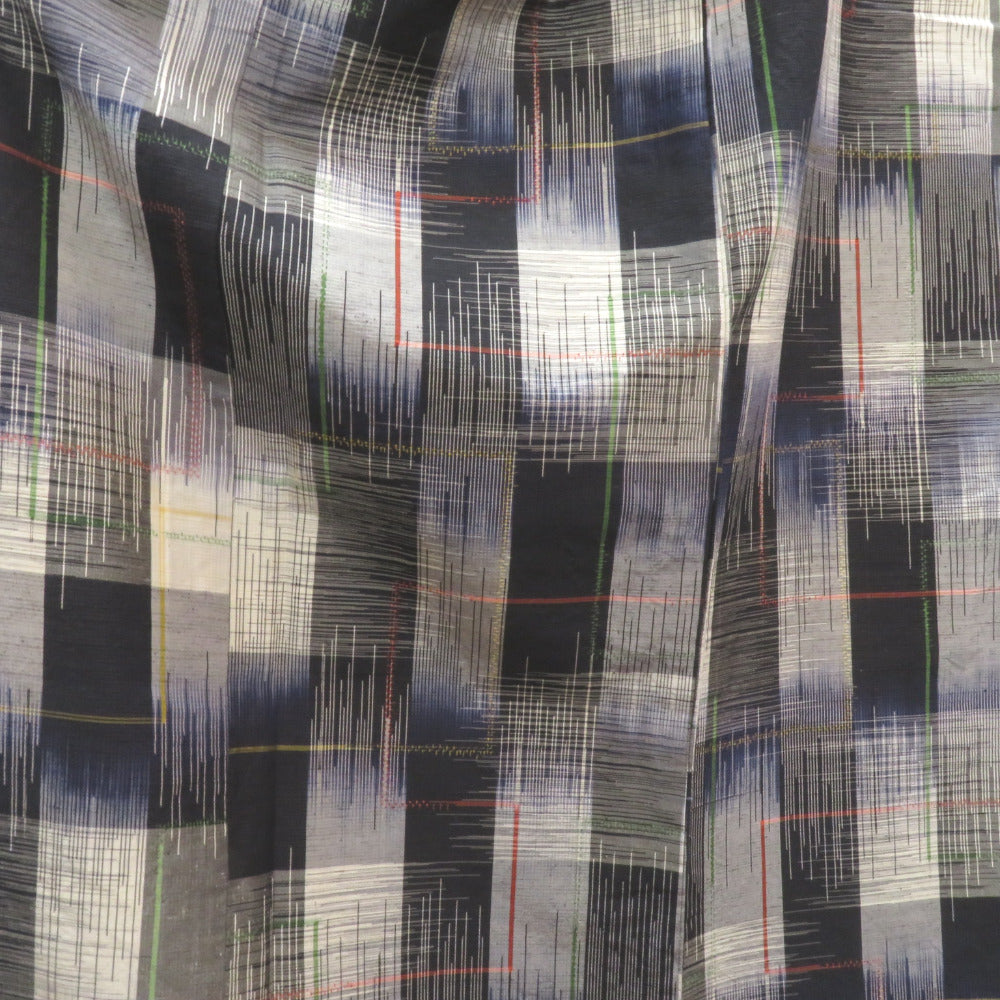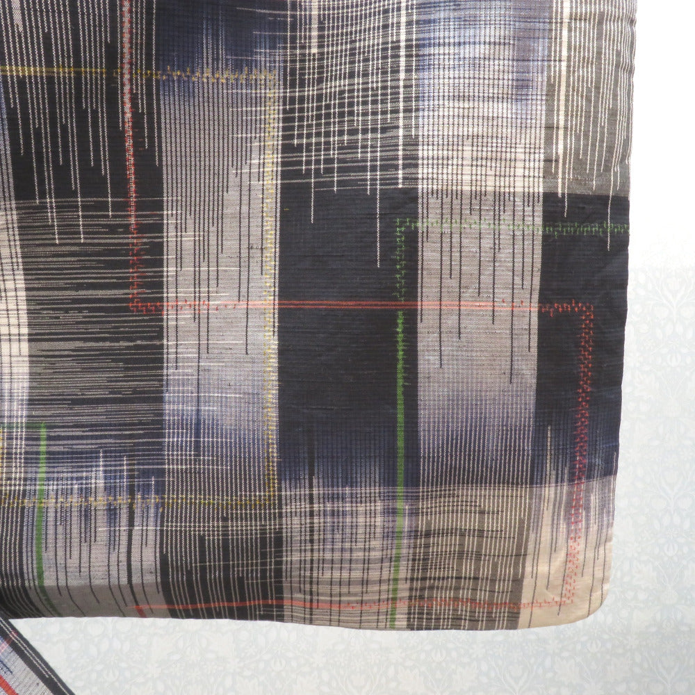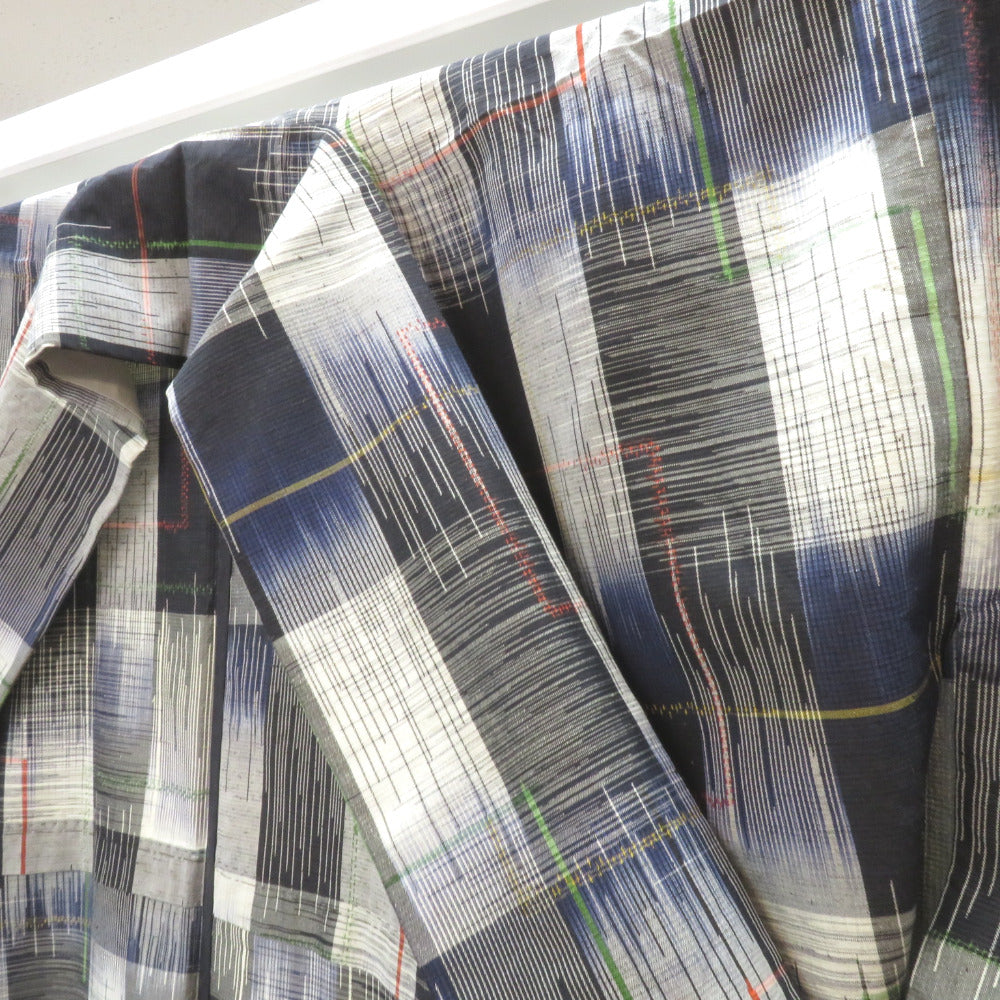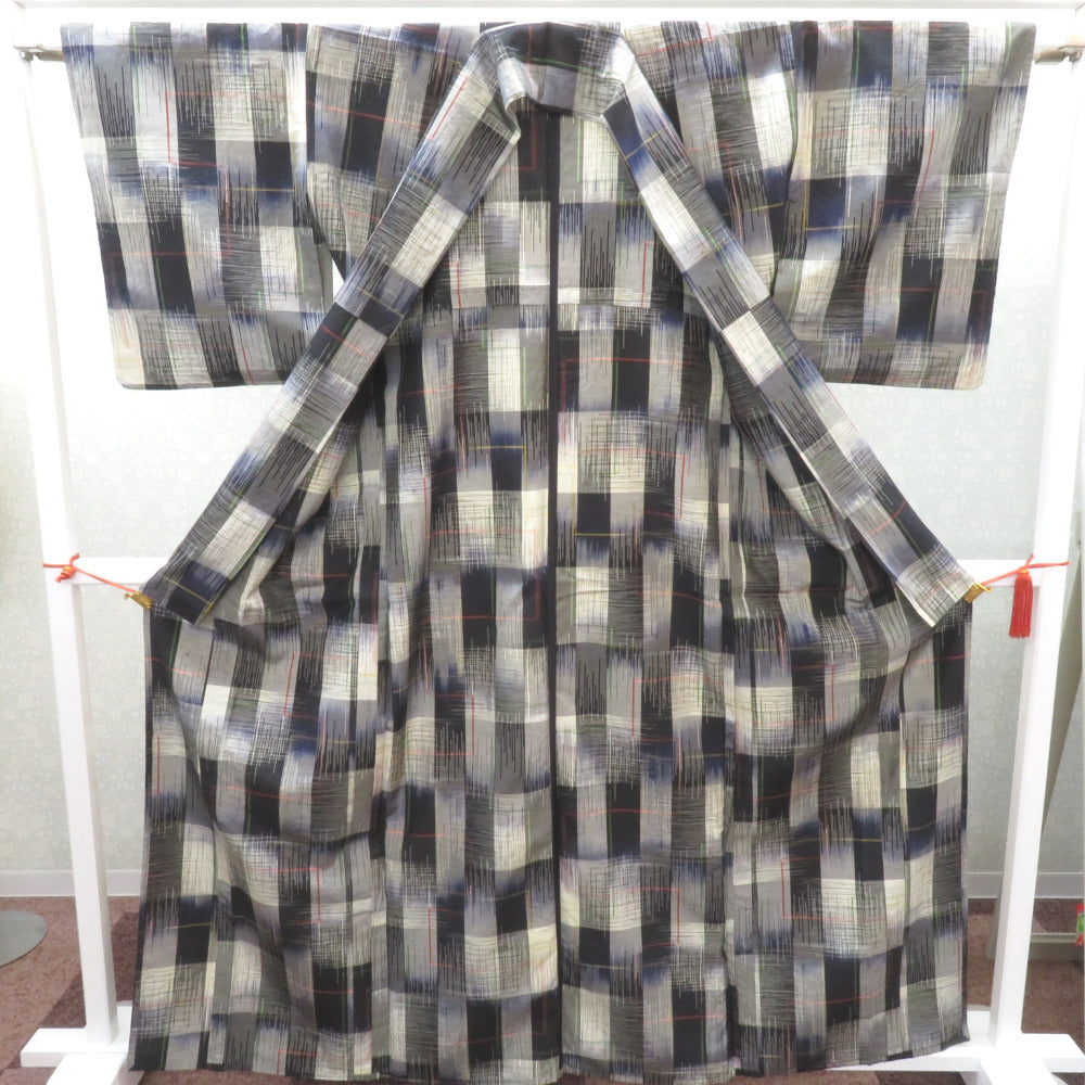 紬 着物 単衣 黒×白×紺 赤×黄×緑 格子柄 広衿 正絹 仕立て上がり着物 チェック 身丈162.5cm