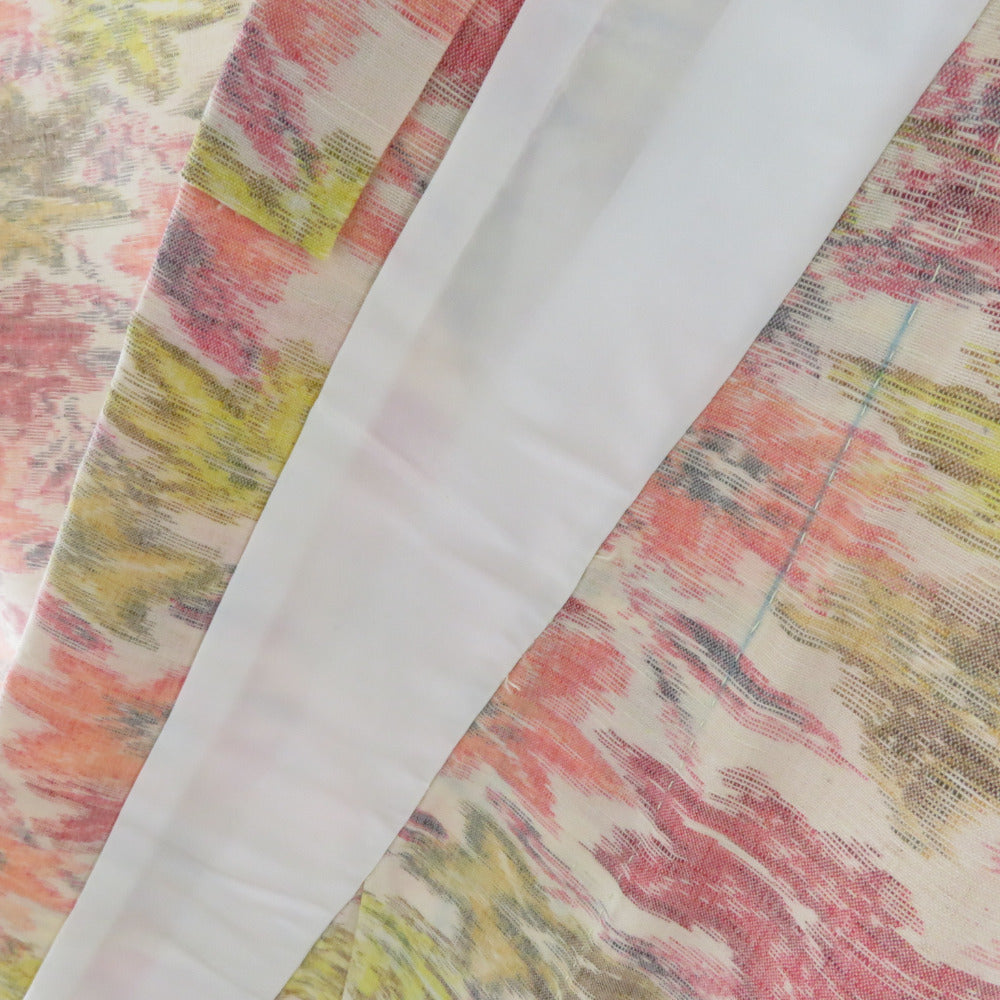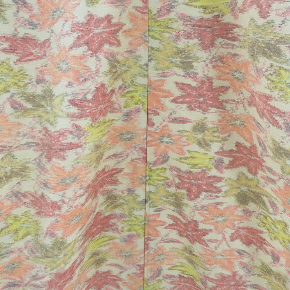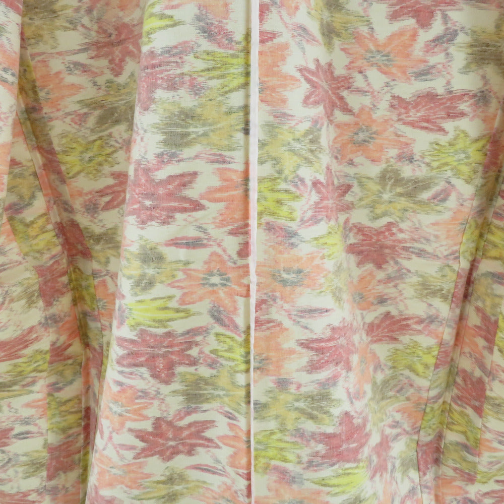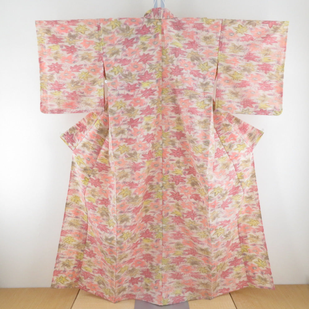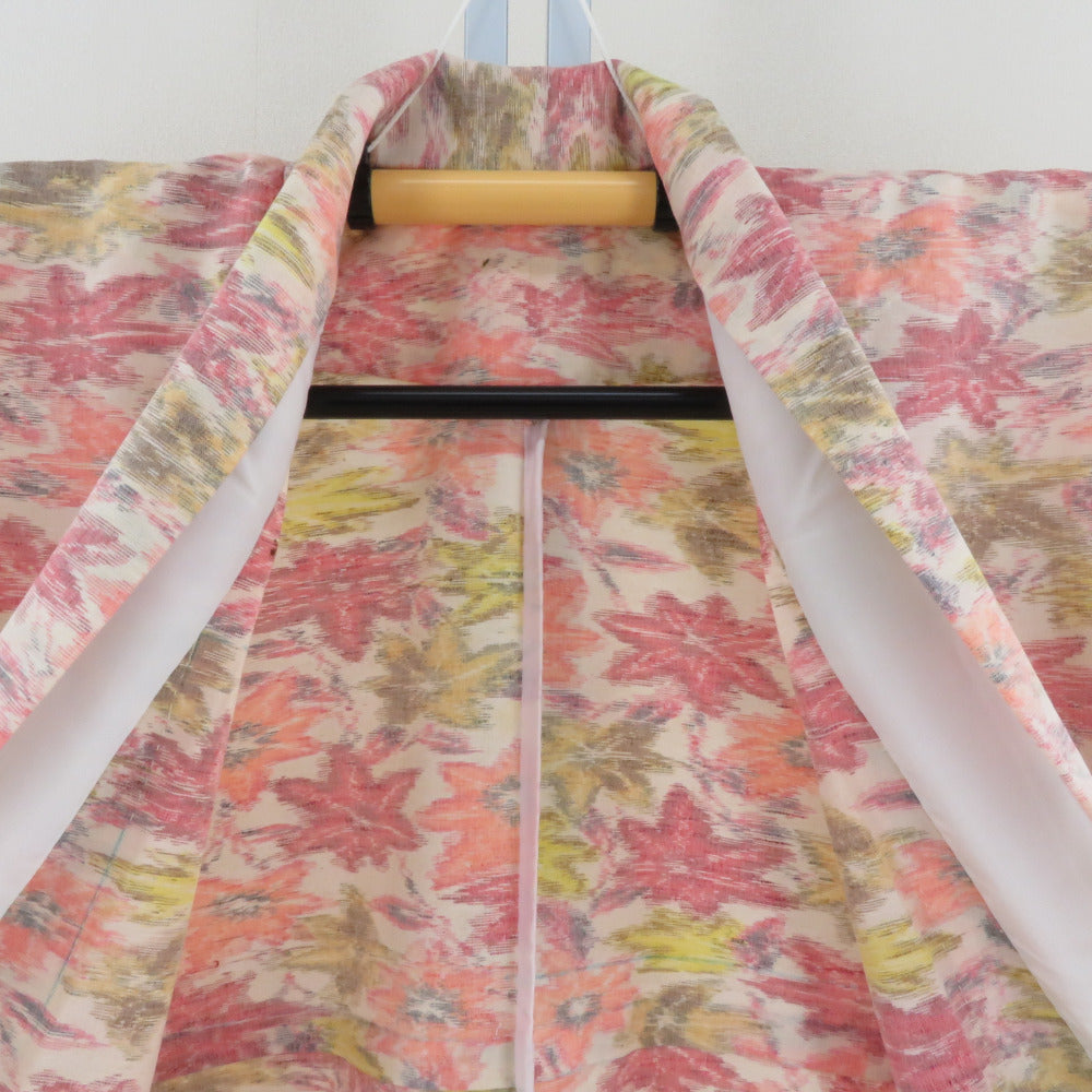 ウール着物 ウール 単衣 ベージュ色x黄色x赤オレンジ色 紅葉模様 広衿 カジュアルきもの 普段着物 仕立て上がり 身丈158cm