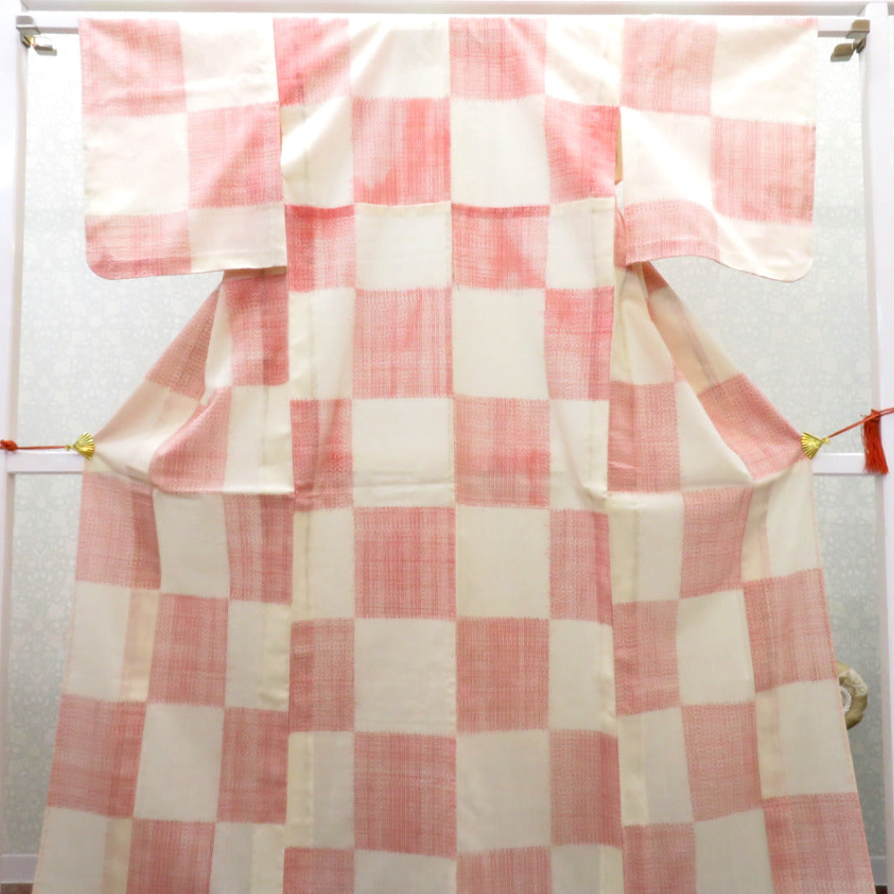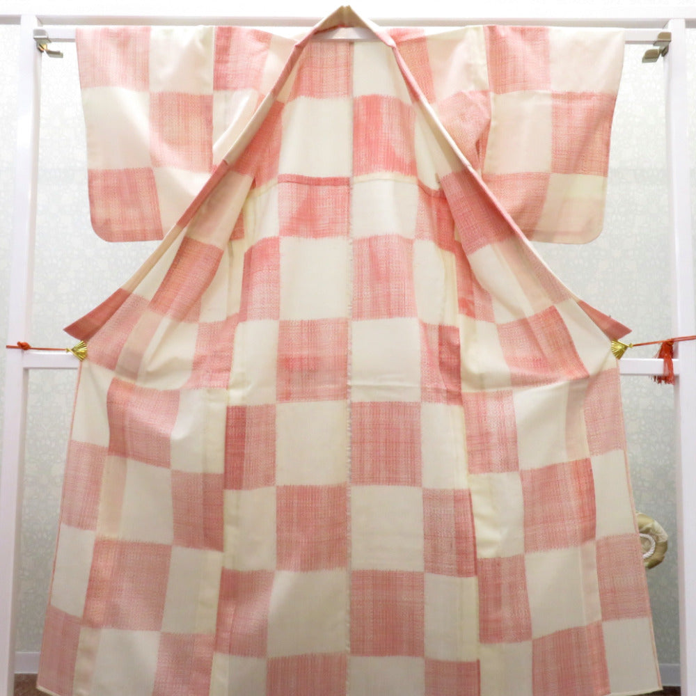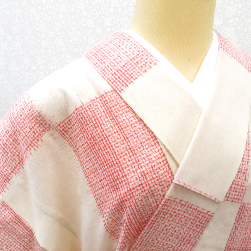 ウール着物 単衣 オフホワイト×赤 格子市松柄 バチ衿 カジュアルきもの 普段着物 仕立て上がり ウールきもの 身丈156.2cm