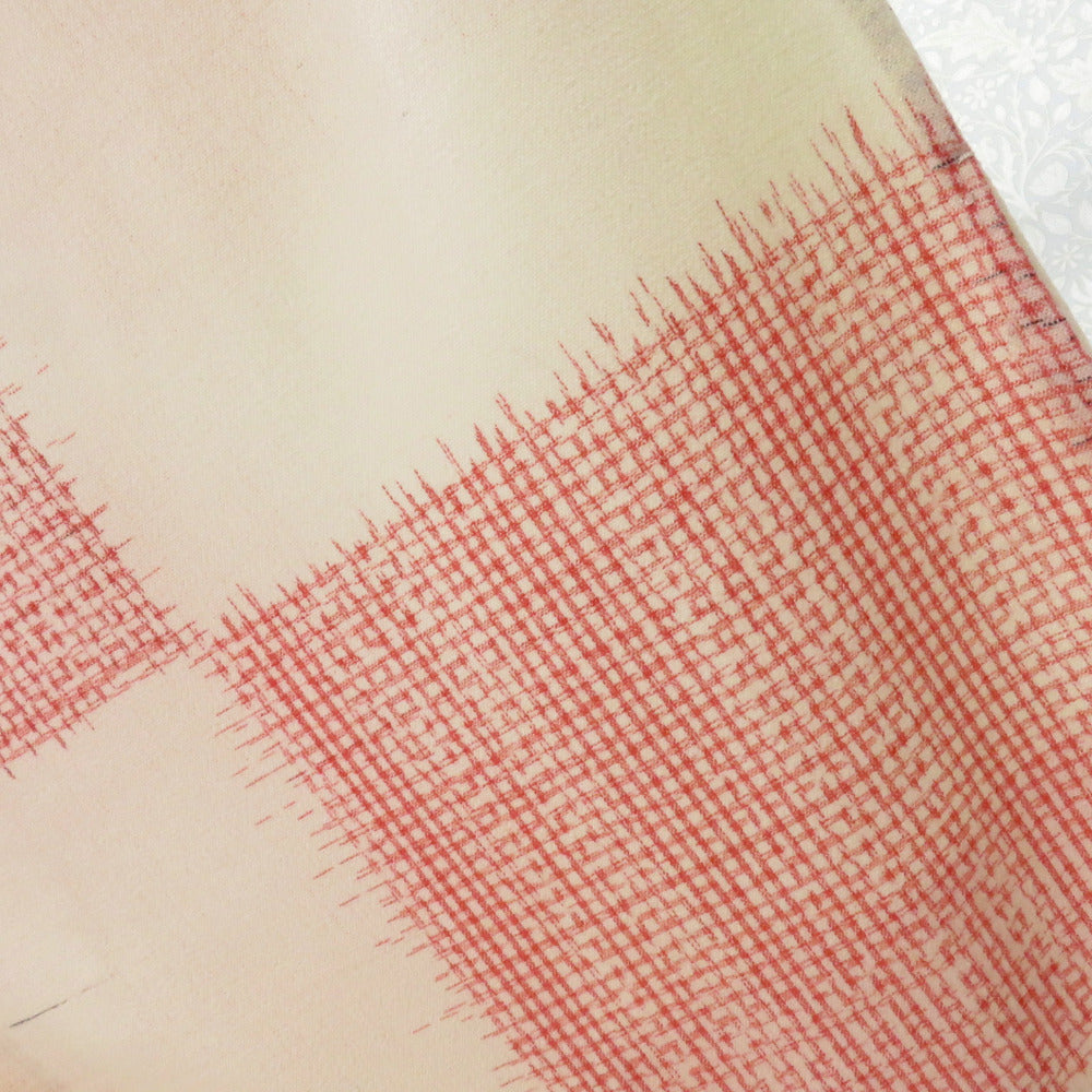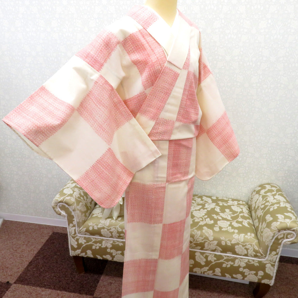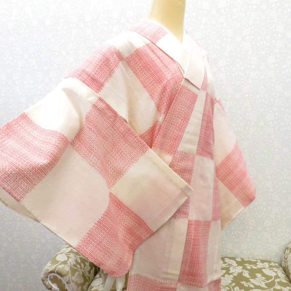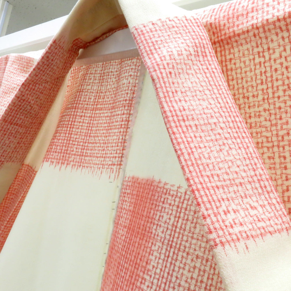 ウール着物 単衣 オフホワイト×赤 格子市松柄 バチ衿 カジュアルきもの 普段着物 仕立て上がり ウールきもの 身丈156.2cm