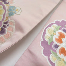 名古屋帯 華紋文様 ベージュピンクx紫色x多色 金糸銀糸 正絹 お太鼓柄 仕立て上がり 着物帯 長さ360cm