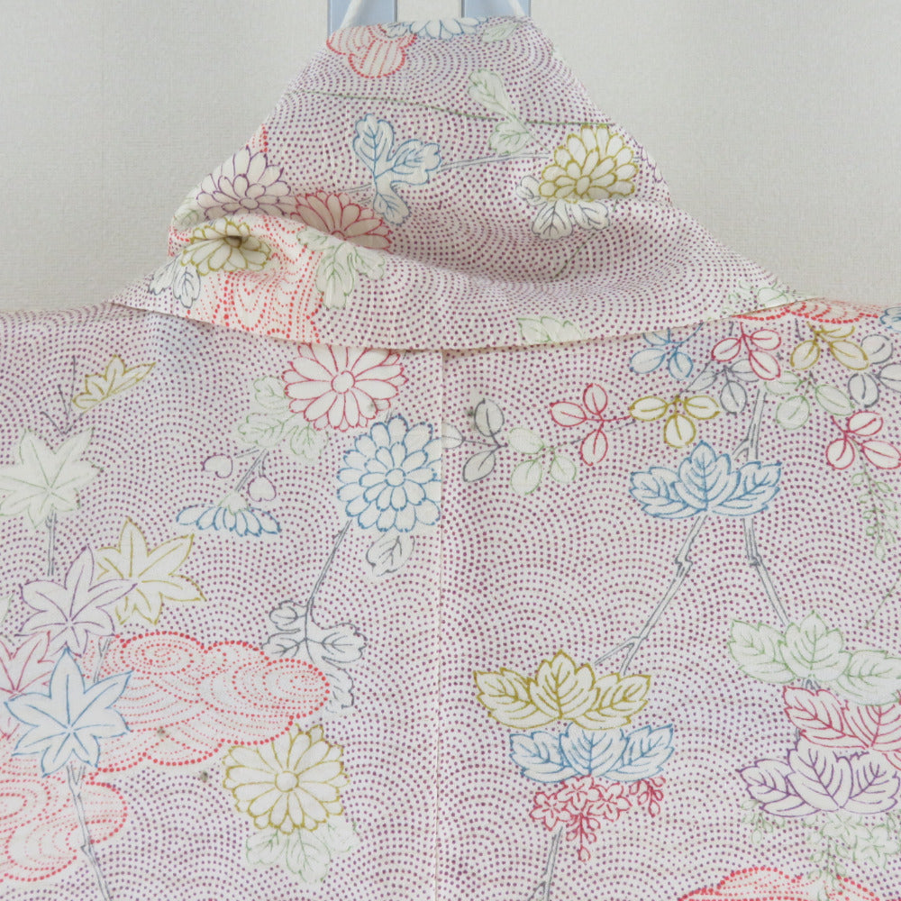 小紋 菊に桐文様 単衣 広衿 ベージュ色 正絹 仕立て上がり カジュアル着物 身丈163cm