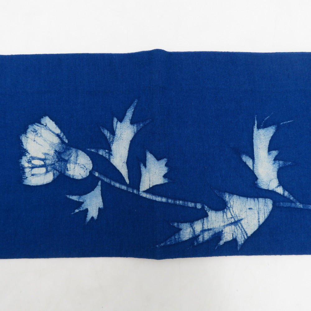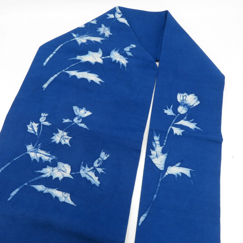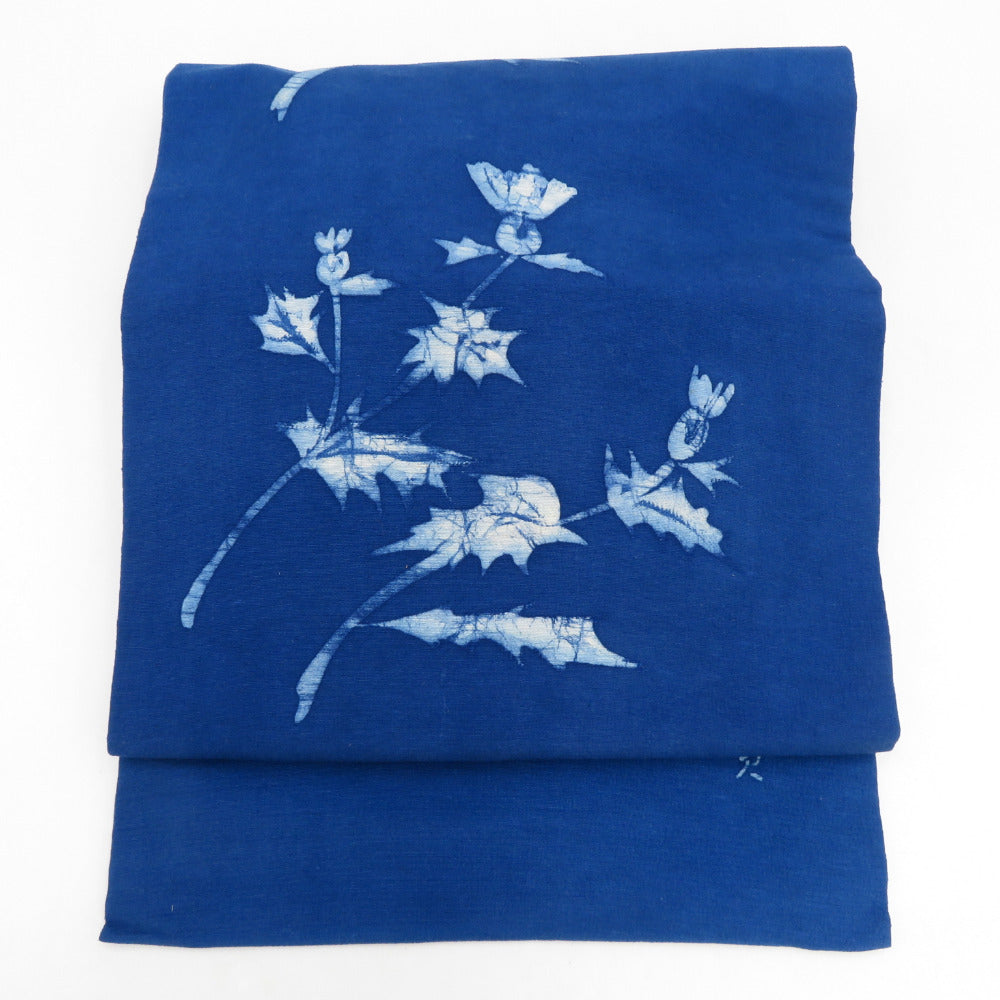 名古屋帯 青色x白色 ろうけつ染め 花文様 お太鼓柄 正絹 落款入り カジュアル 仕立て上がり 着物帯 長さ318cm