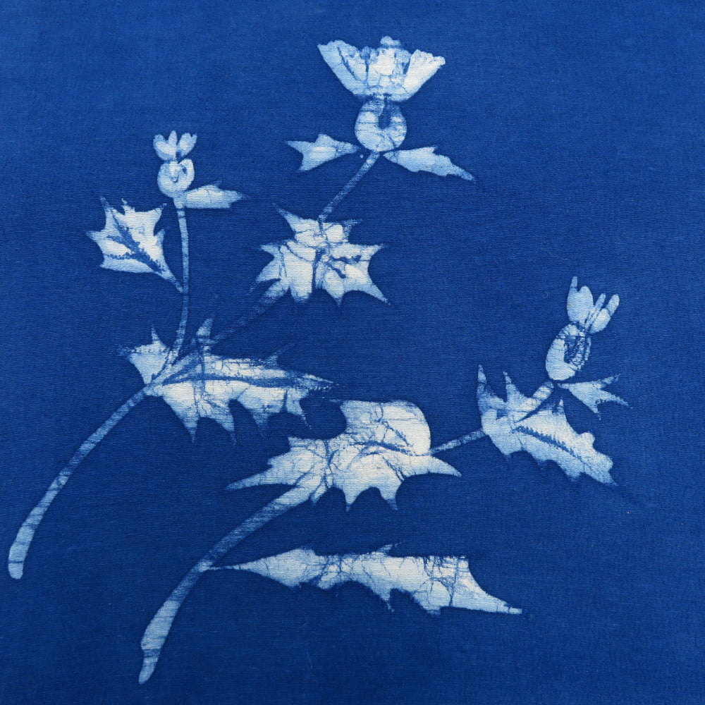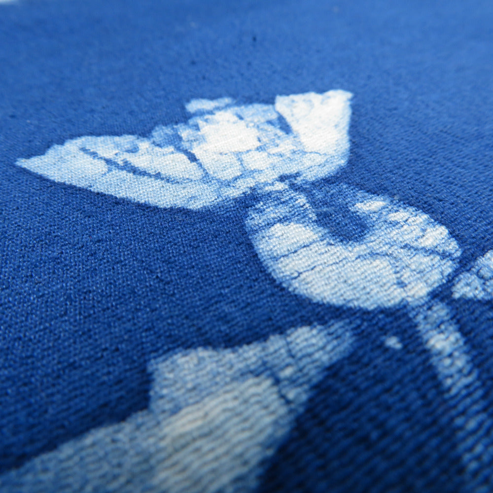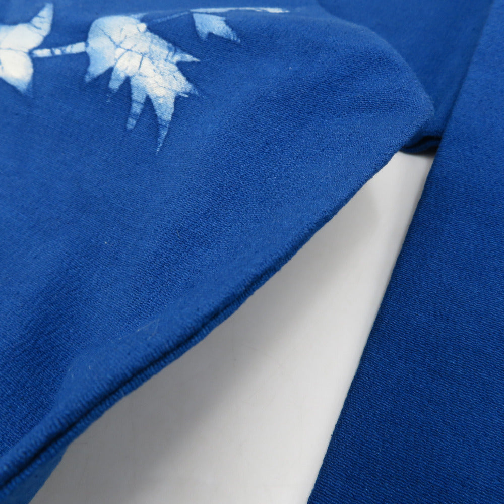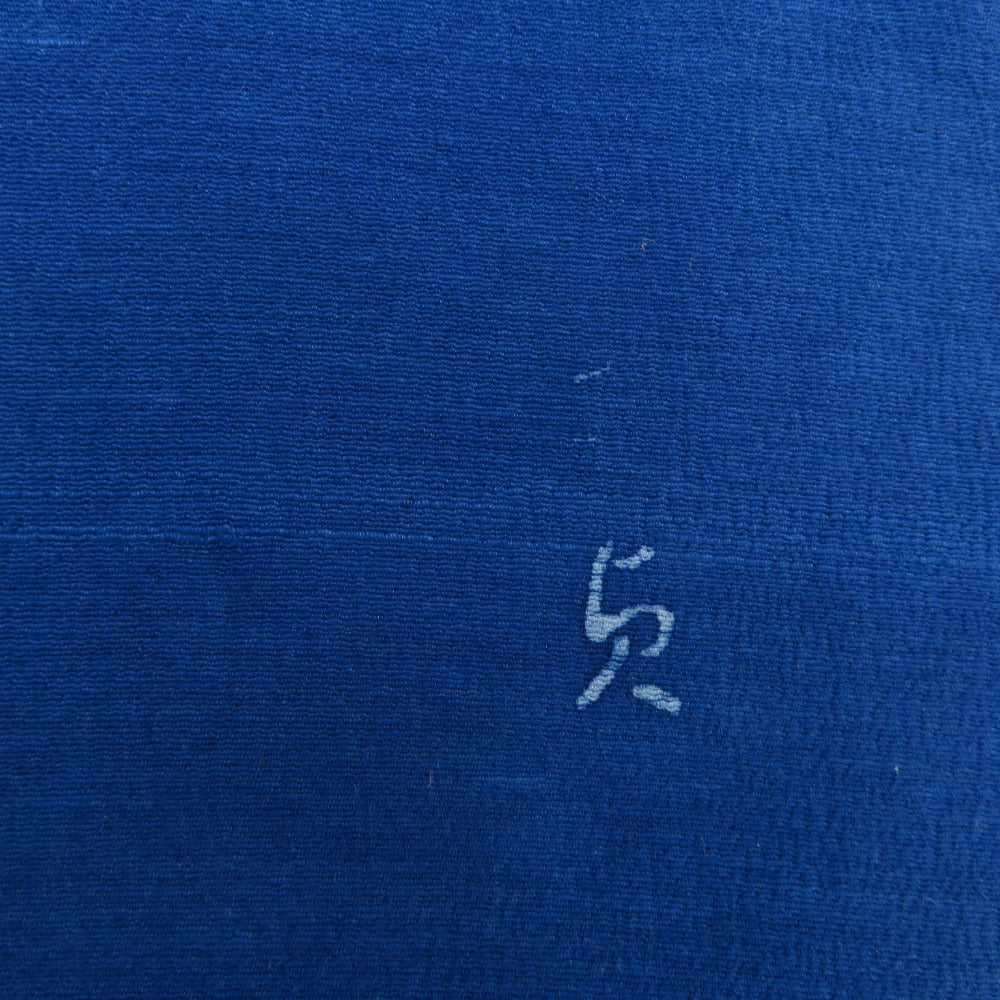名古屋帯 青色x白色 ろうけつ染め 花文様 お太鼓柄 正絹 落款入り カジュアル 仕立て上がり 着物帯 長さ318cm