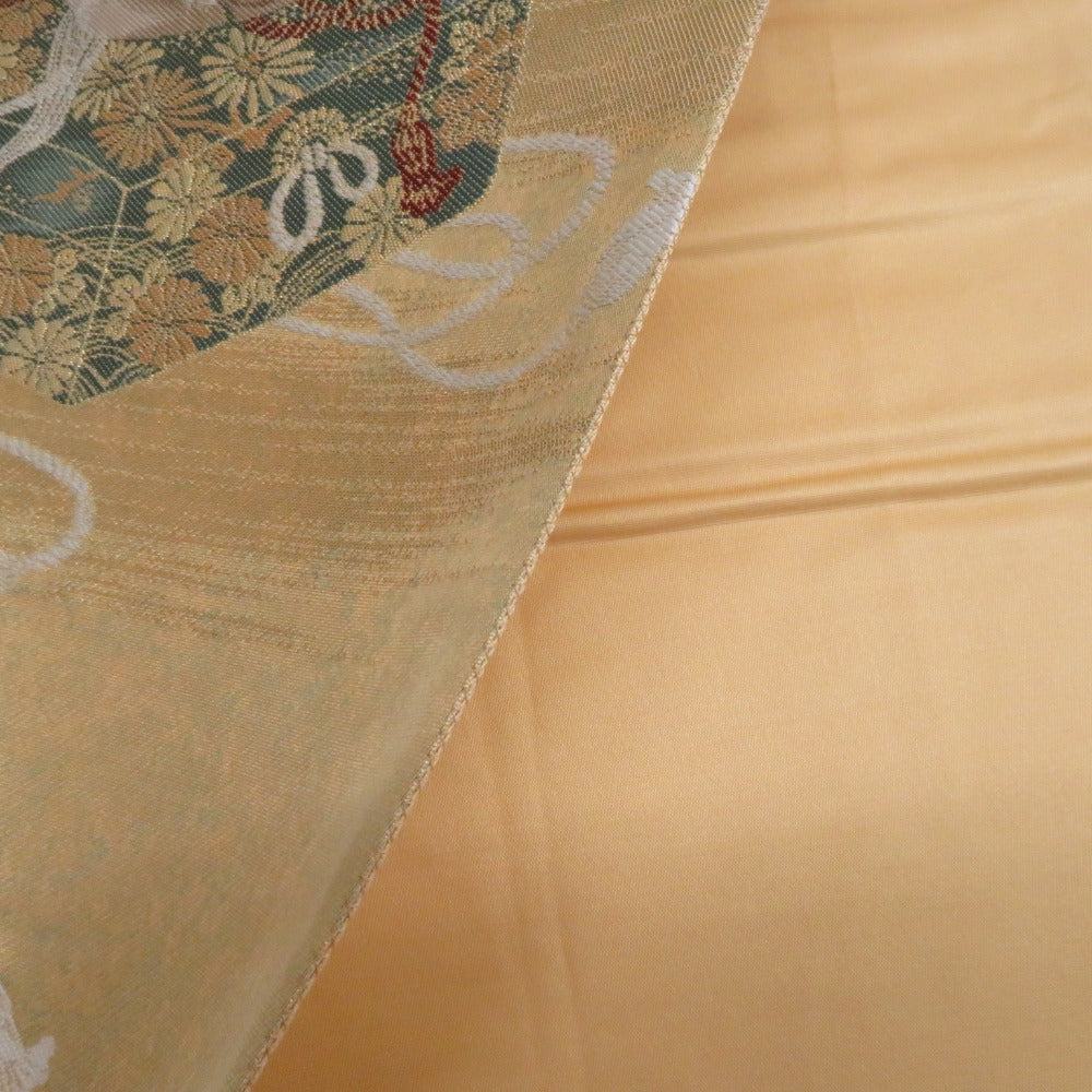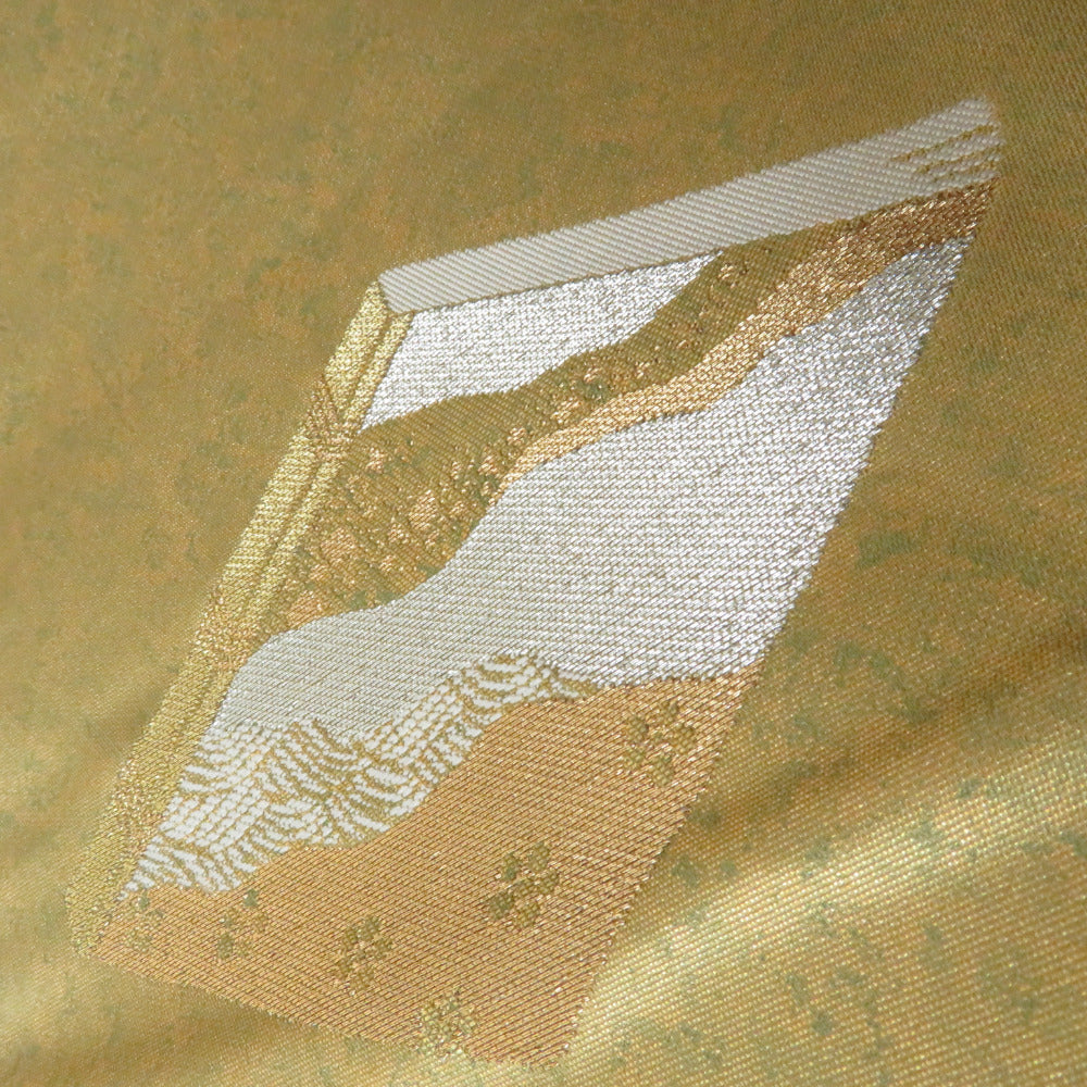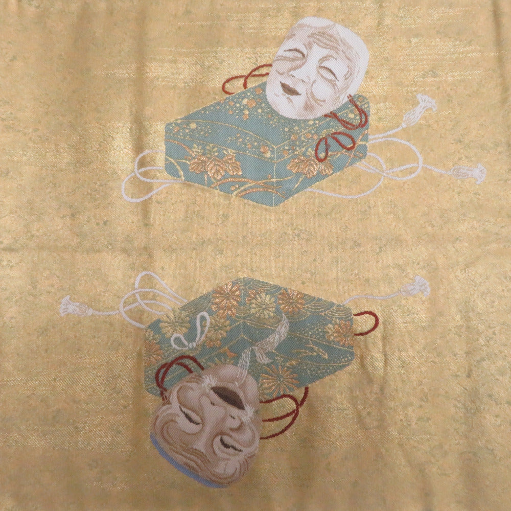 袋帯 正絹 塗金引箔 金糸 ゴールド系 翁面紋様 お太鼓柄 金色x緑色 仕立て上がり 着物帯 長さ424cm