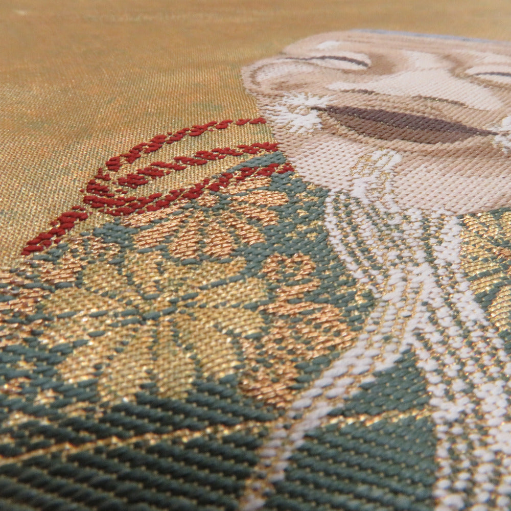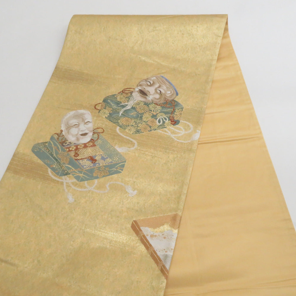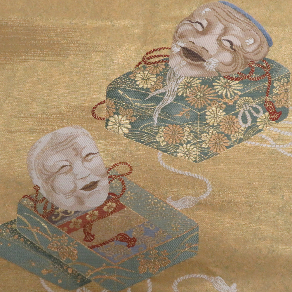 A very special style fukuro obi with okina noh mask motif. For formal occasions.