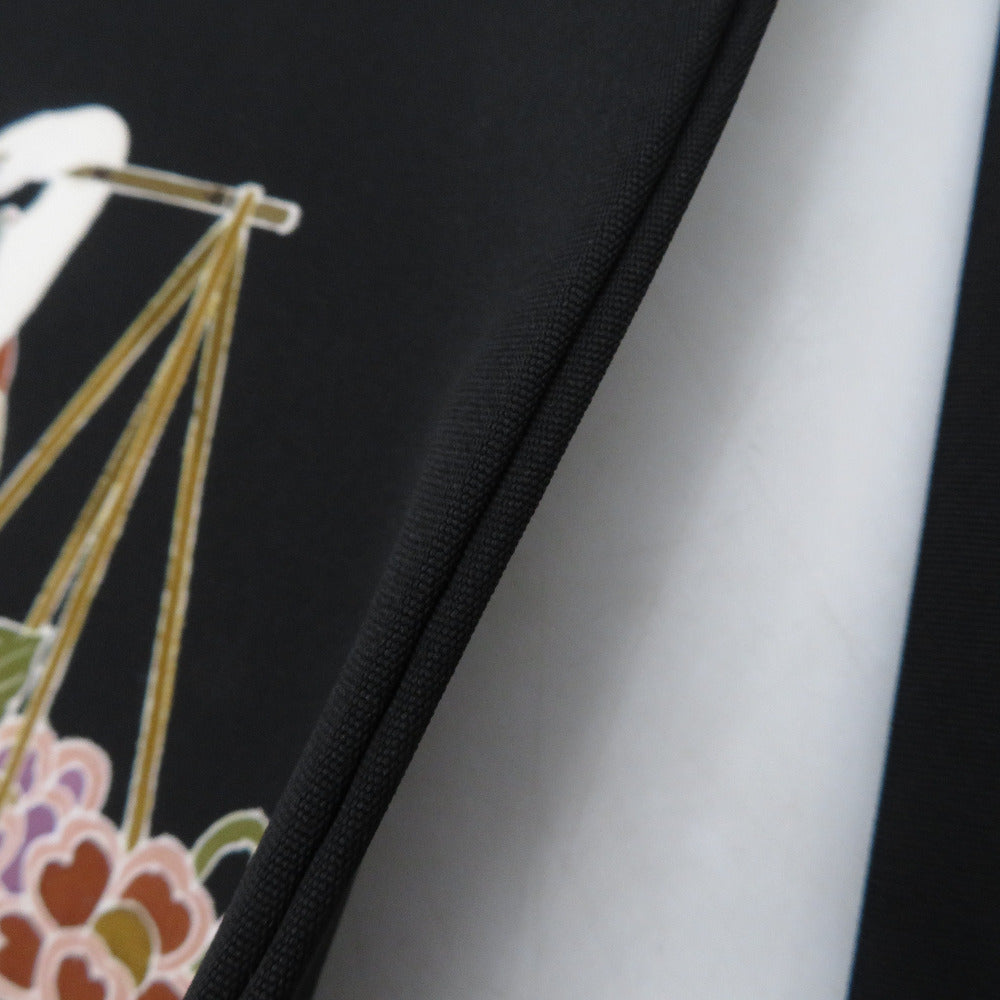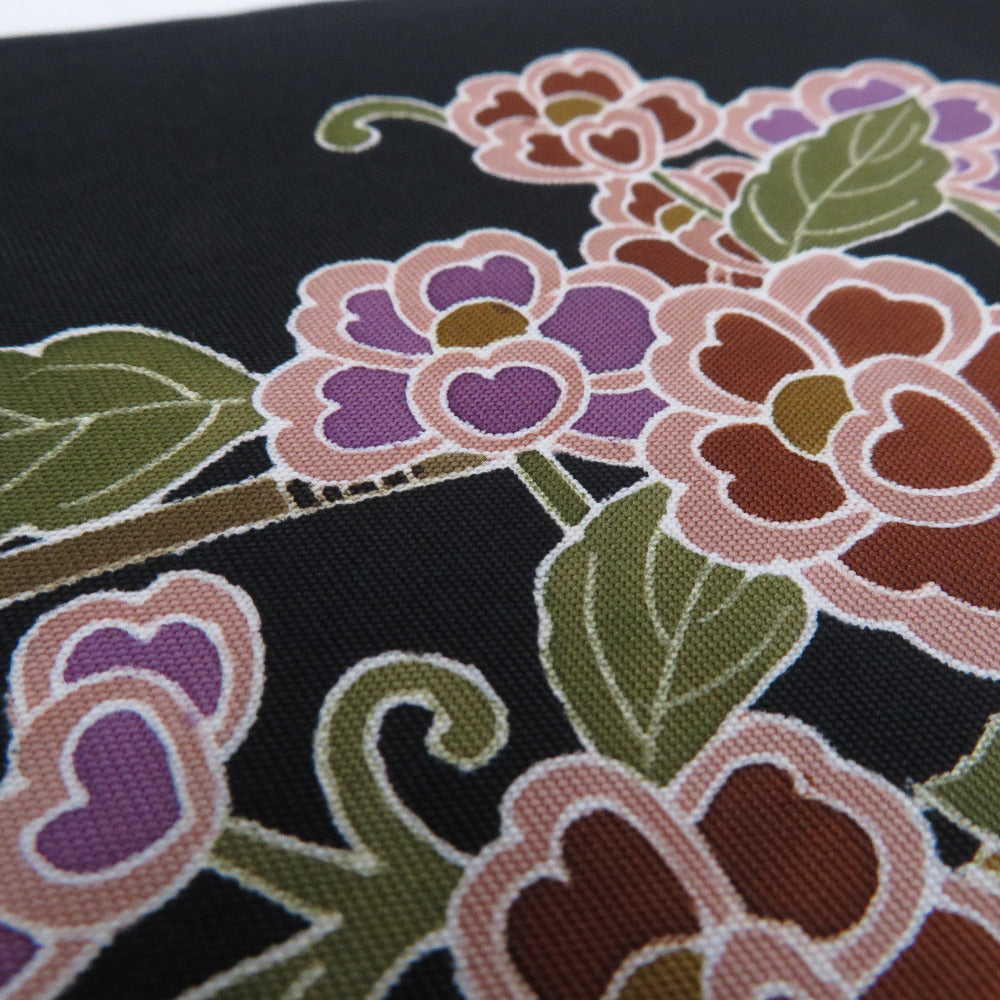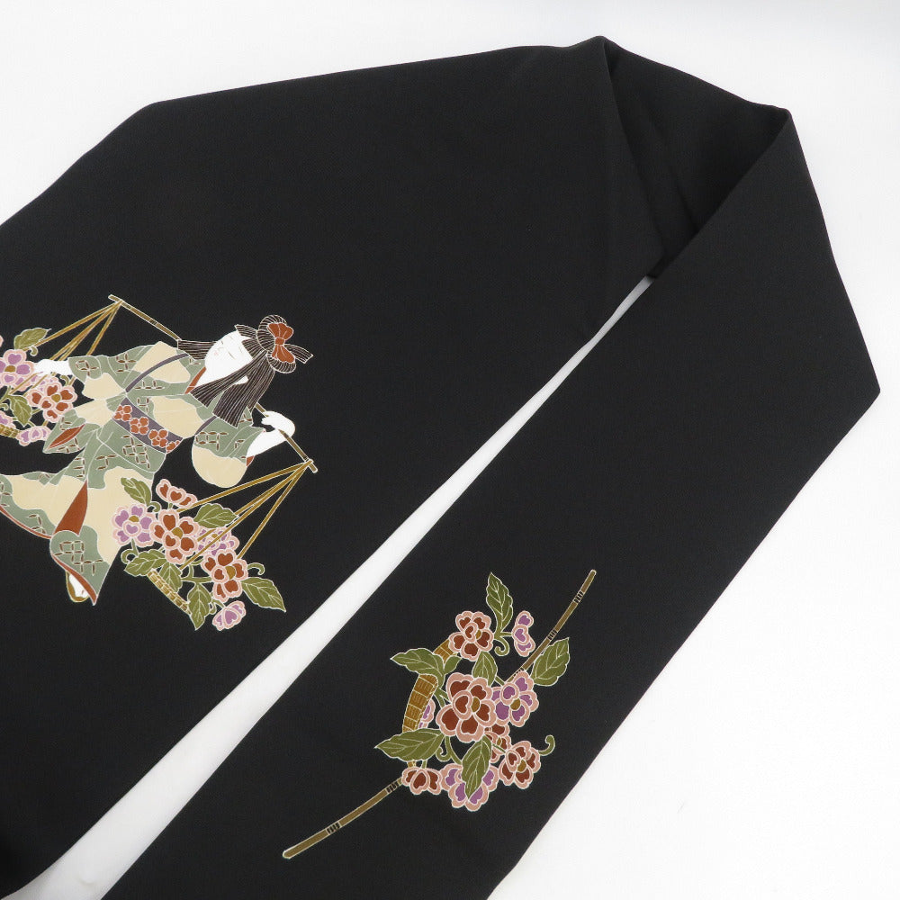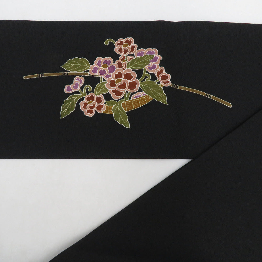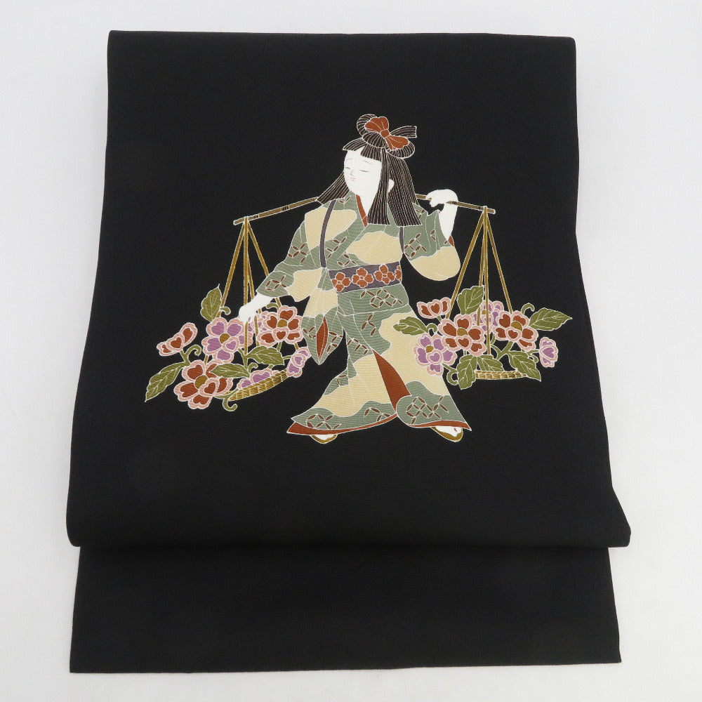 名古屋帯 塩瀬 黒色x多色 花売り童子文様 お太鼓柄 正絹 カジュアル 着物帯 長さ367cm