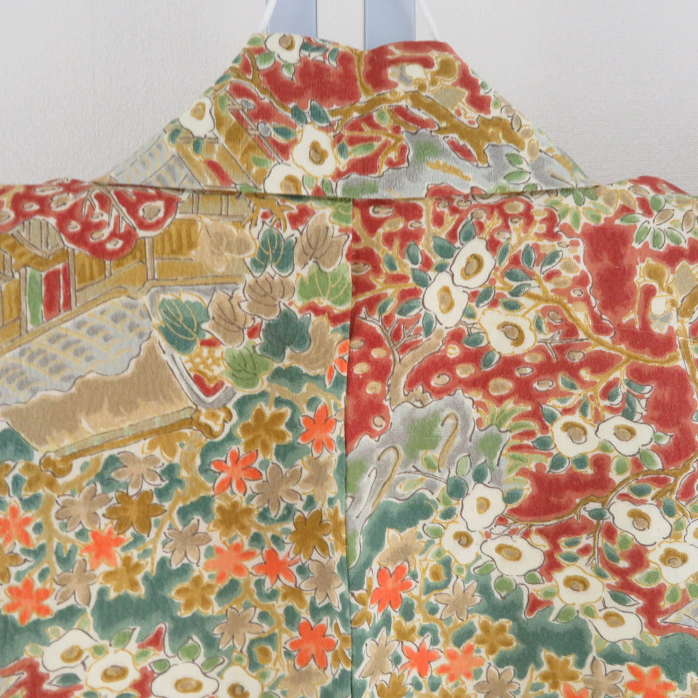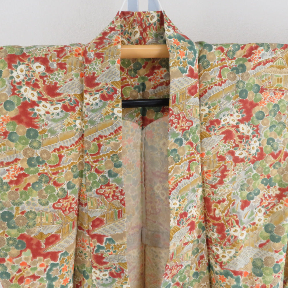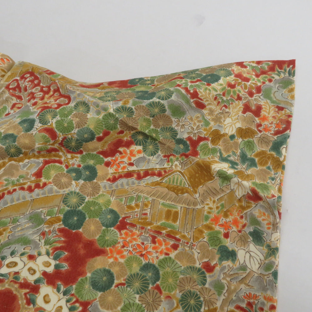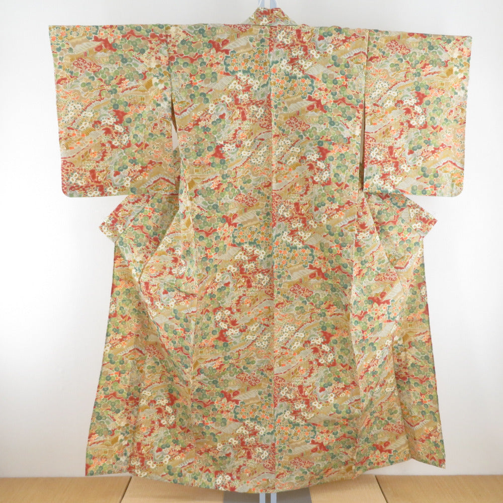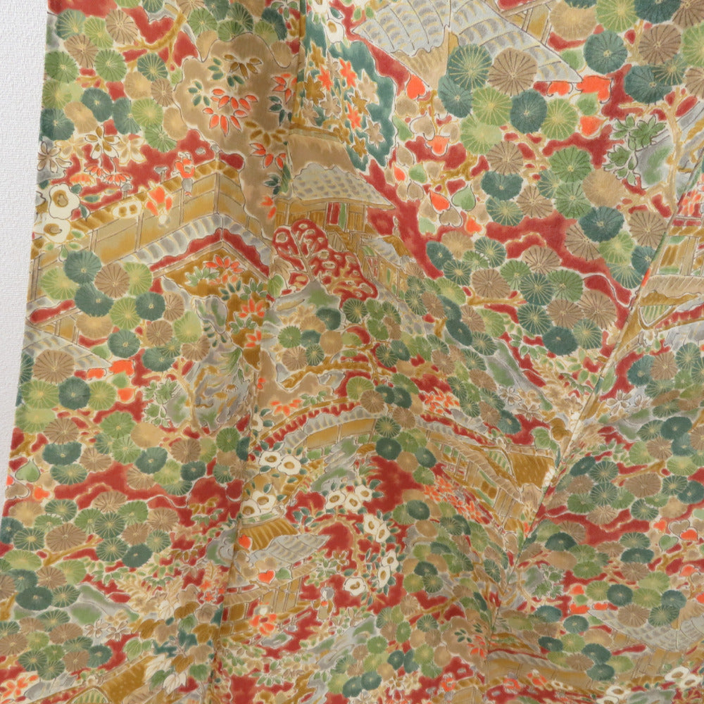 小紋 紬地 花に家屋文様 単衣 バチ衿 茶黄色 正絹 仕立て上がり カジュアル着物 身丈153cm