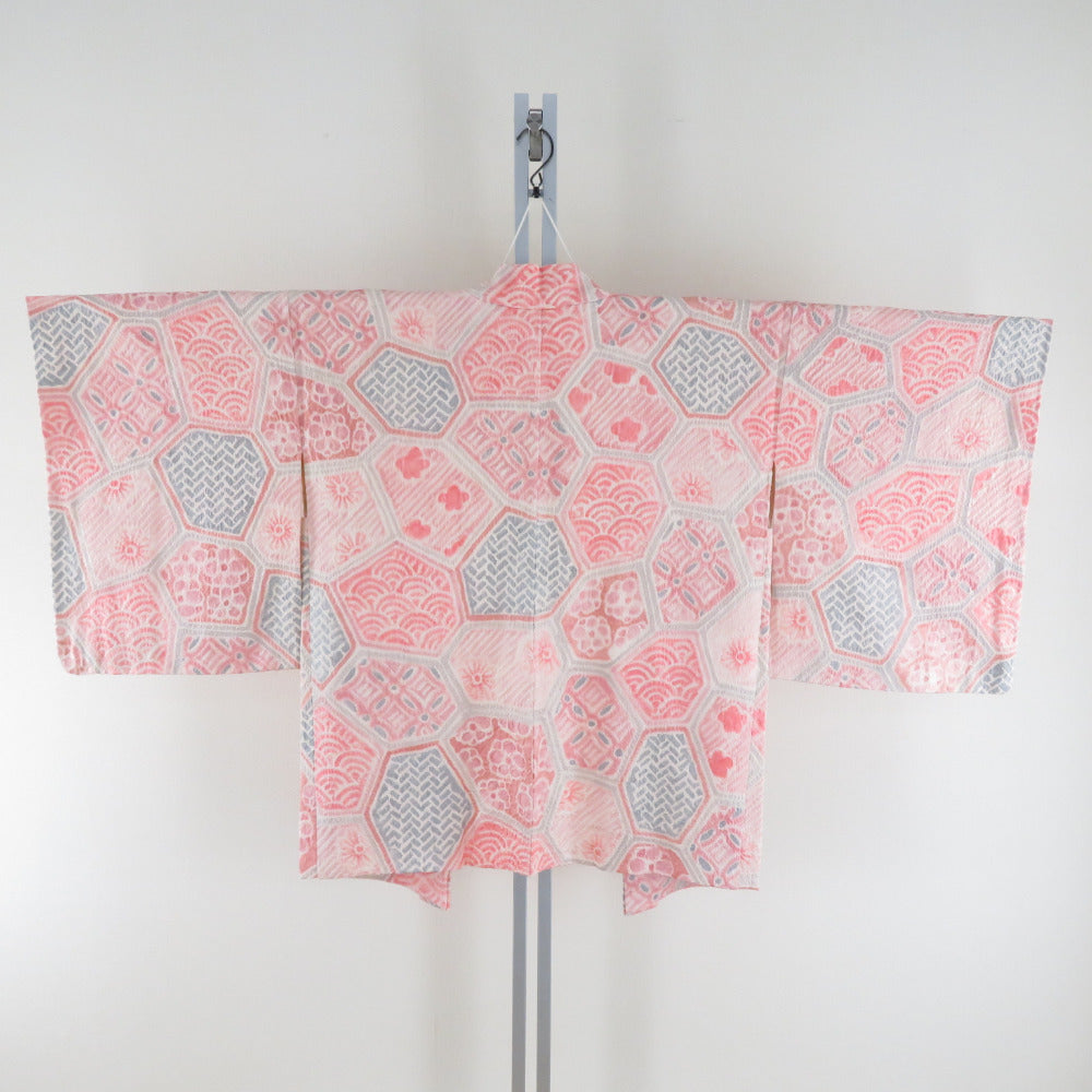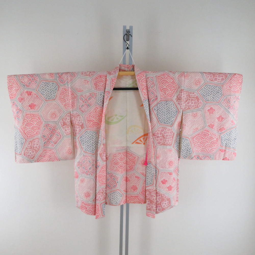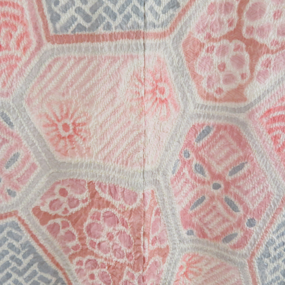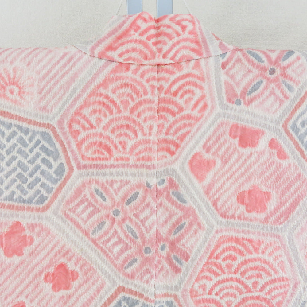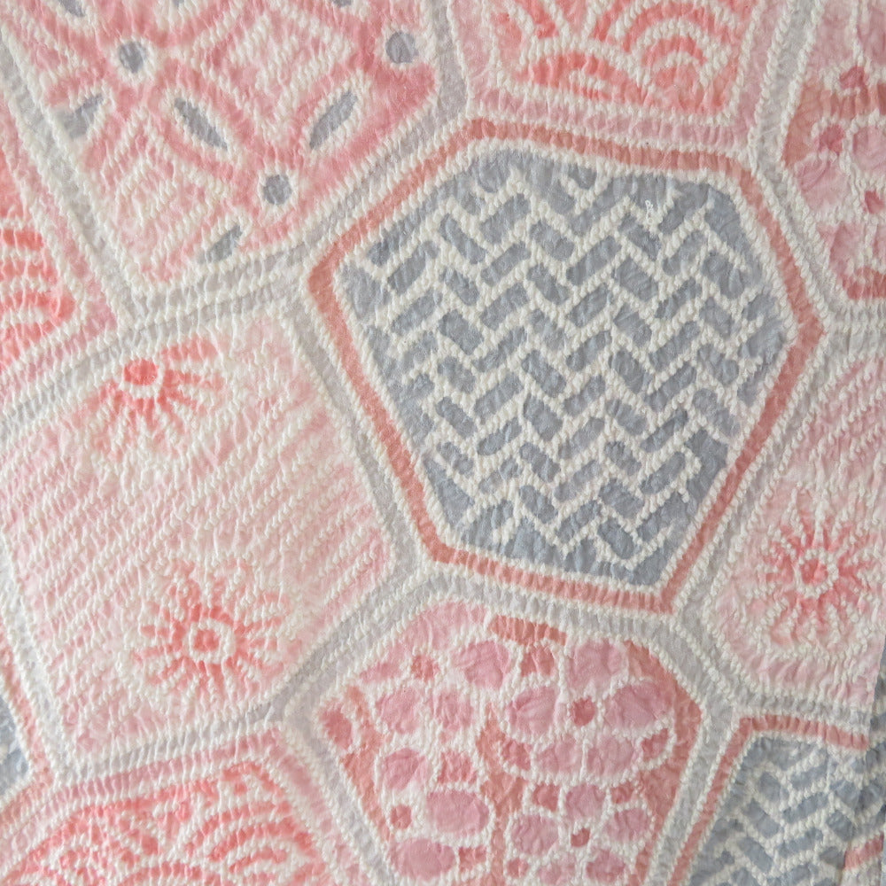 羽織 正絹 絞り 白色xピンク色x灰色 亀甲に花模様 着物コート 着物用 ちりよけ 防寒 上着 リメイク シルク 身丈78cm