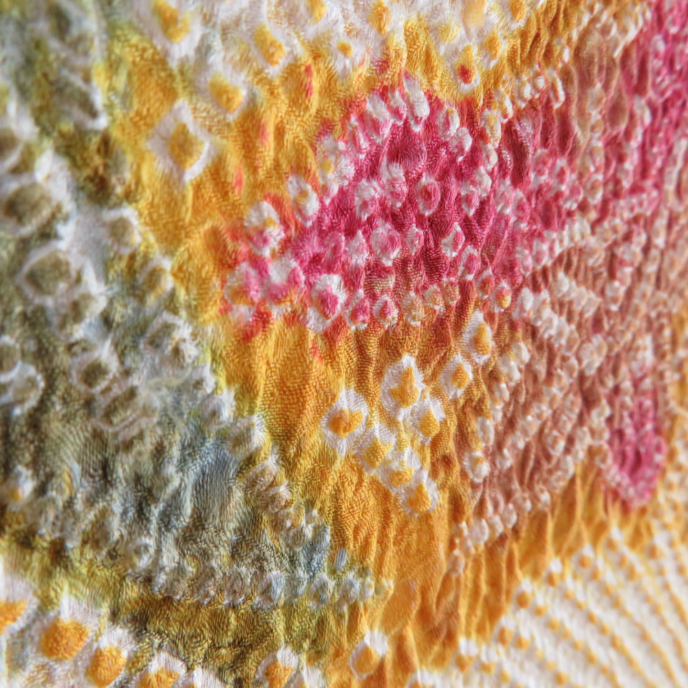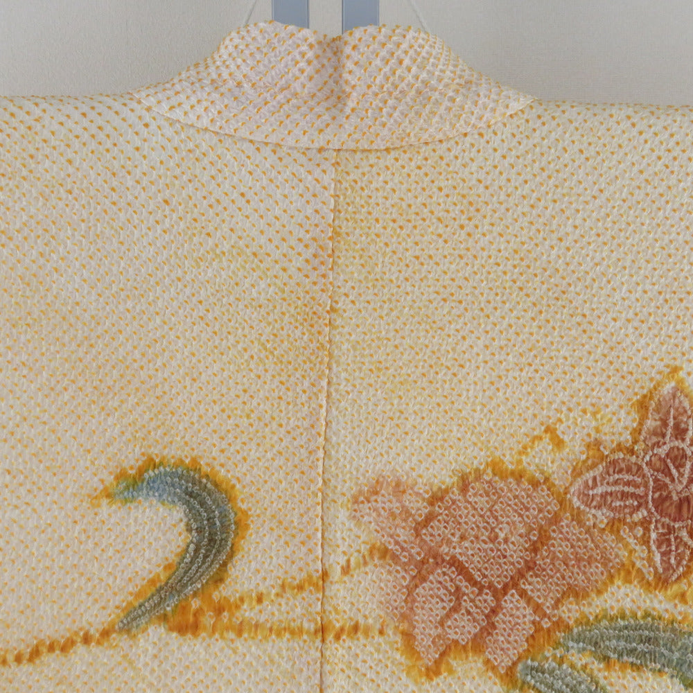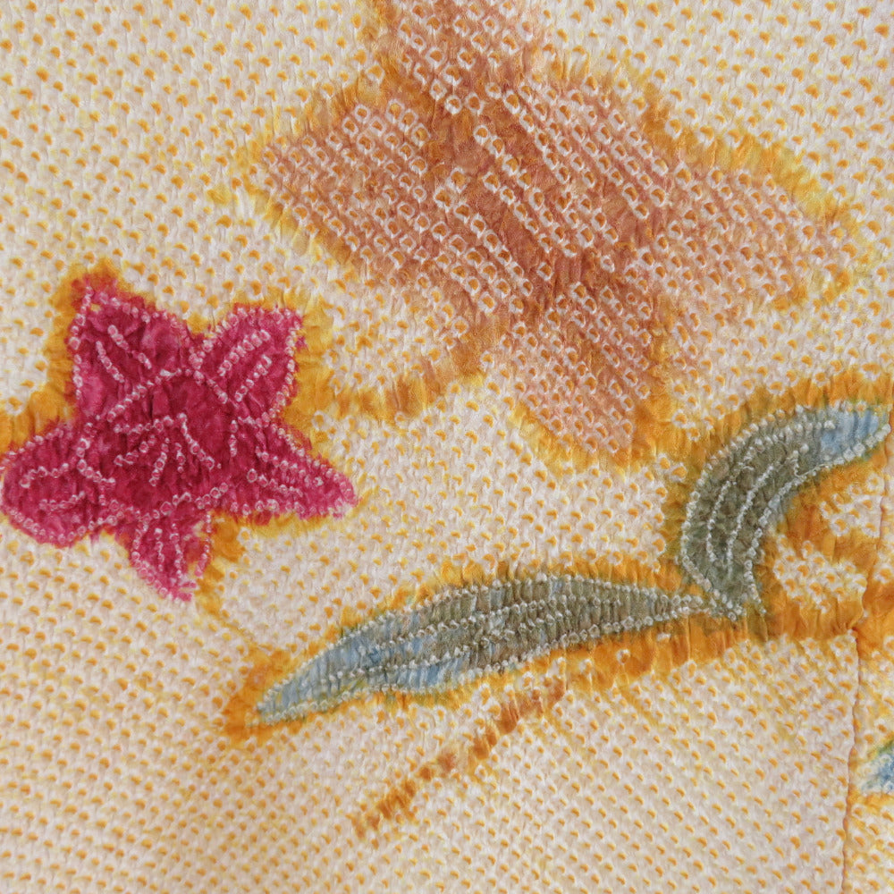 羽織 正絹 絞り 黄色x緑色x赤色x多色 カラフル 花柄 着物コート 着物用 ちりよけ 防寒 上着 リメイク シルク 身丈77cm