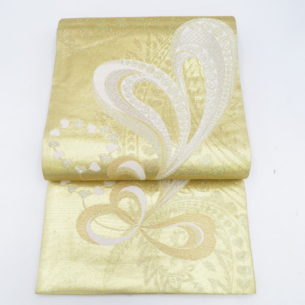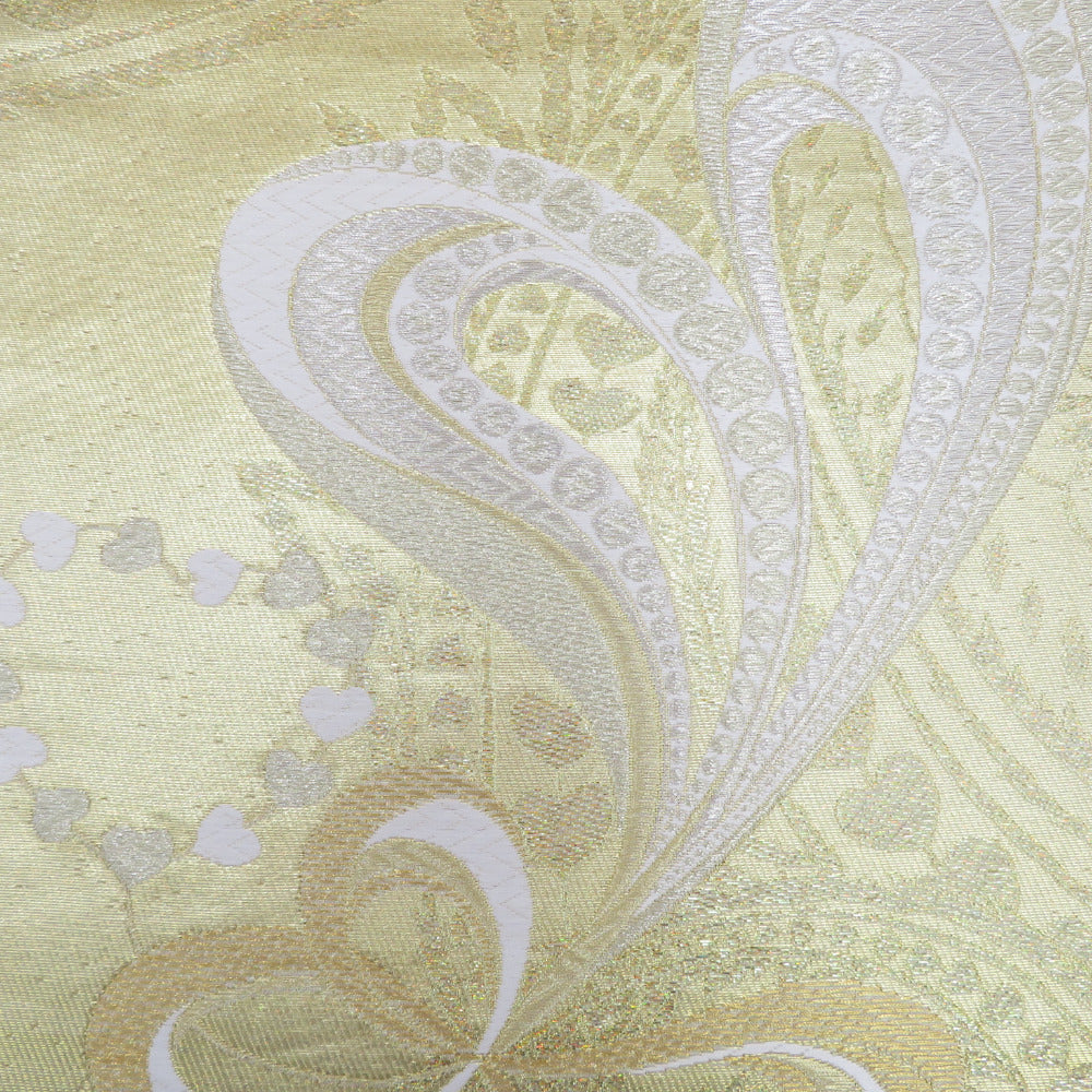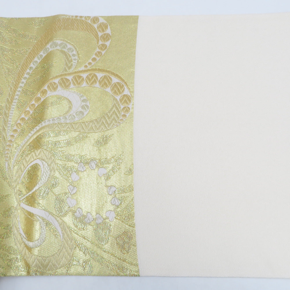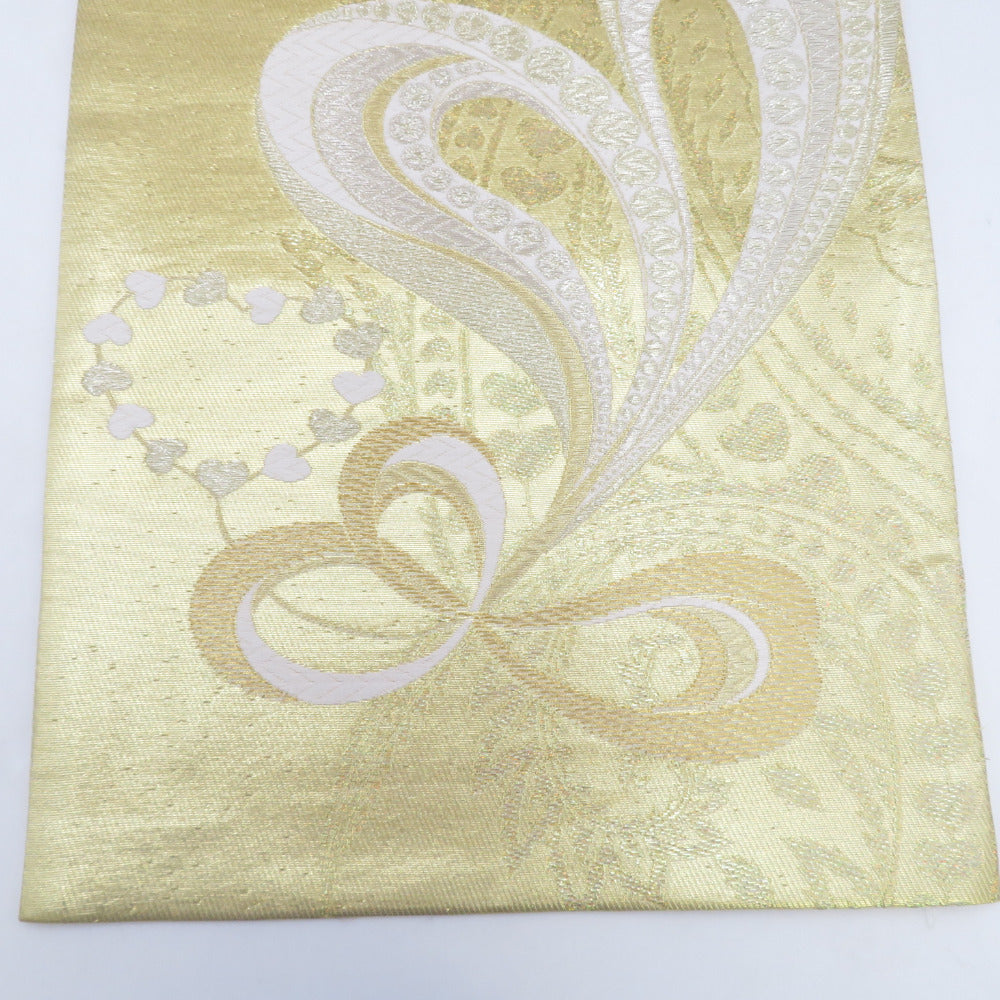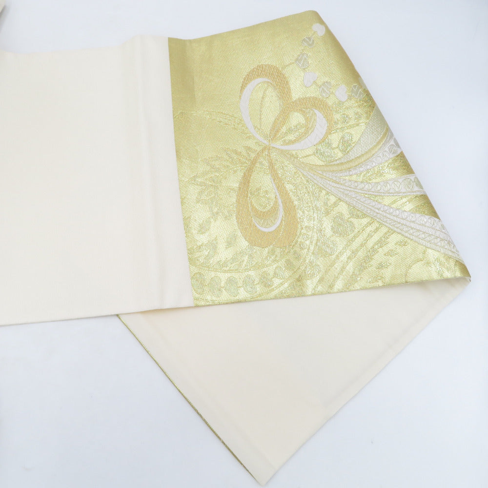 袋帯 振袖用 金糸銀糸 リボン紋様 金色x白色x銀色 六通柄 正絹 仕立て上がり 着物帯 長さ464cm