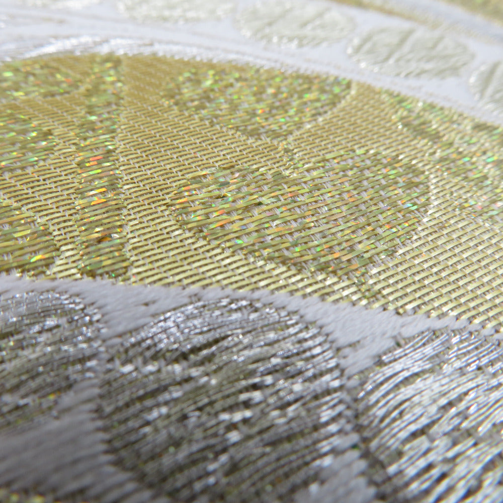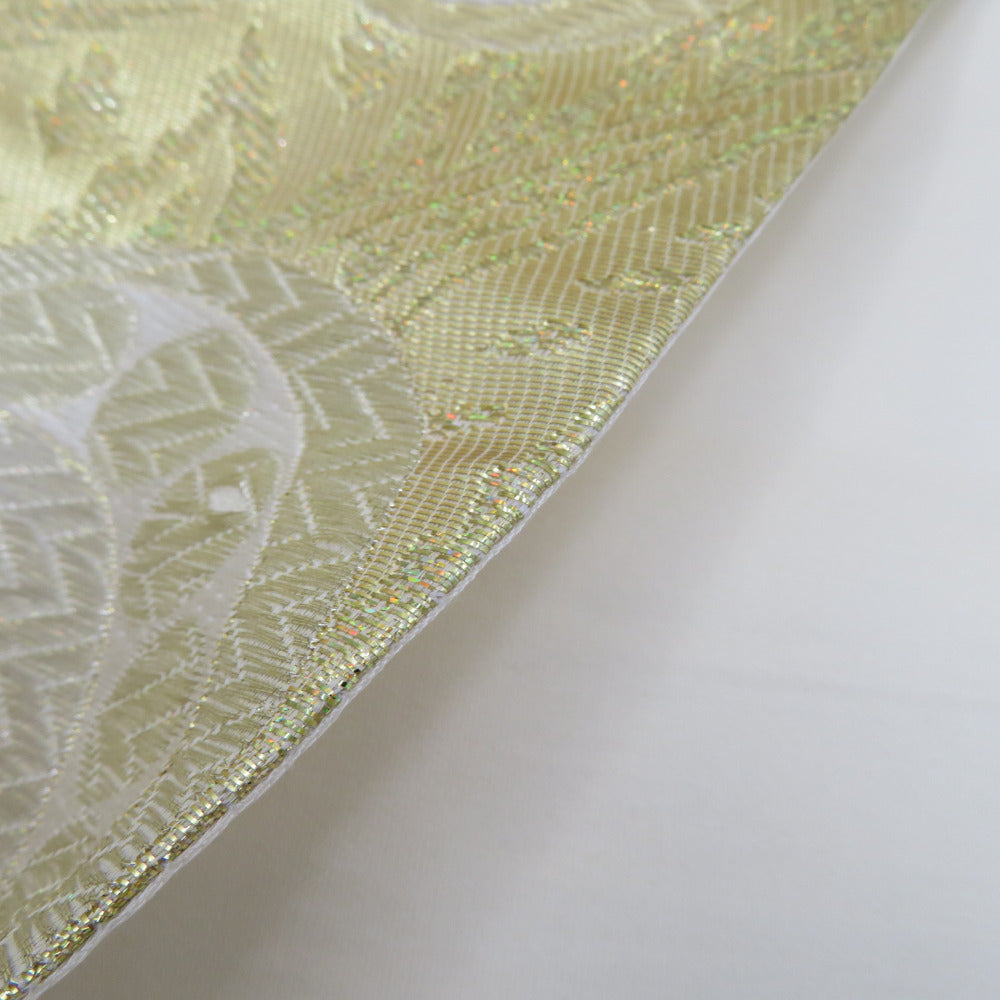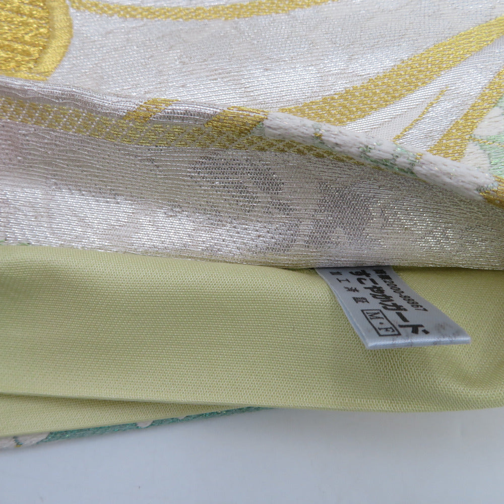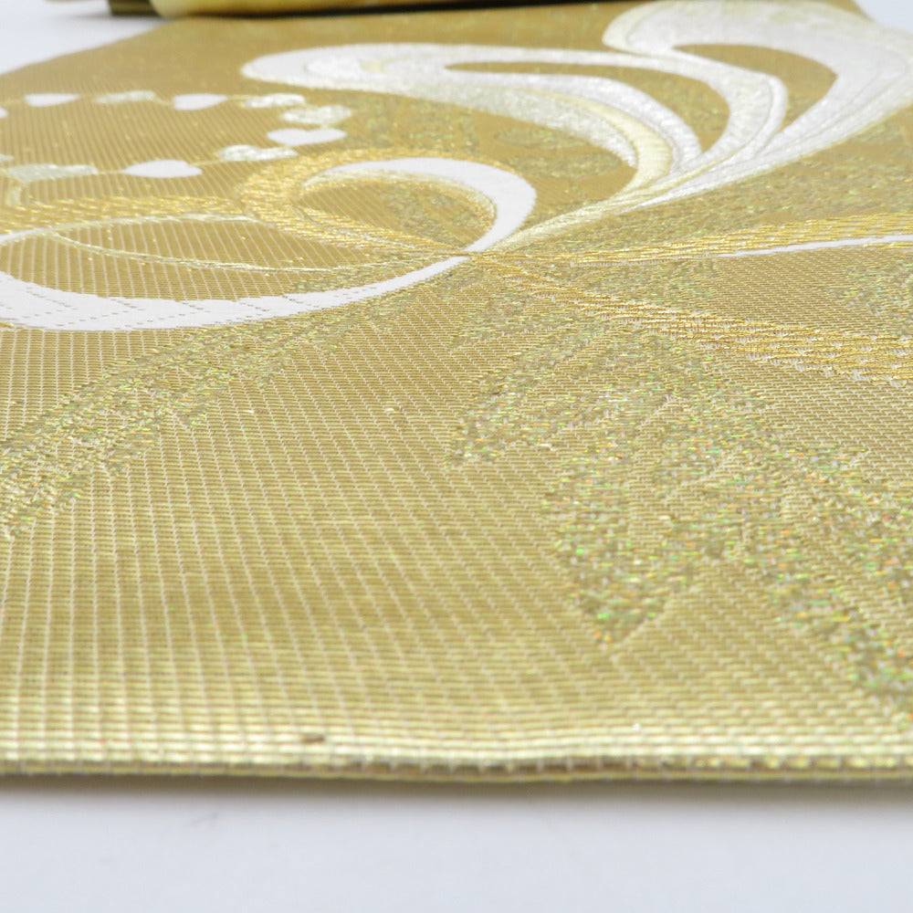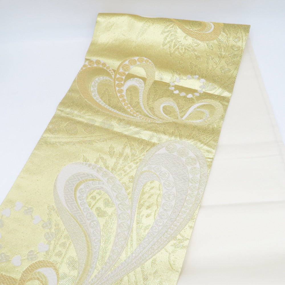 袋帯 振袖用 金糸銀糸 リボン紋様 金色x白色x銀色 六通柄 正絹 仕立て上がり 着物帯 長さ464cm