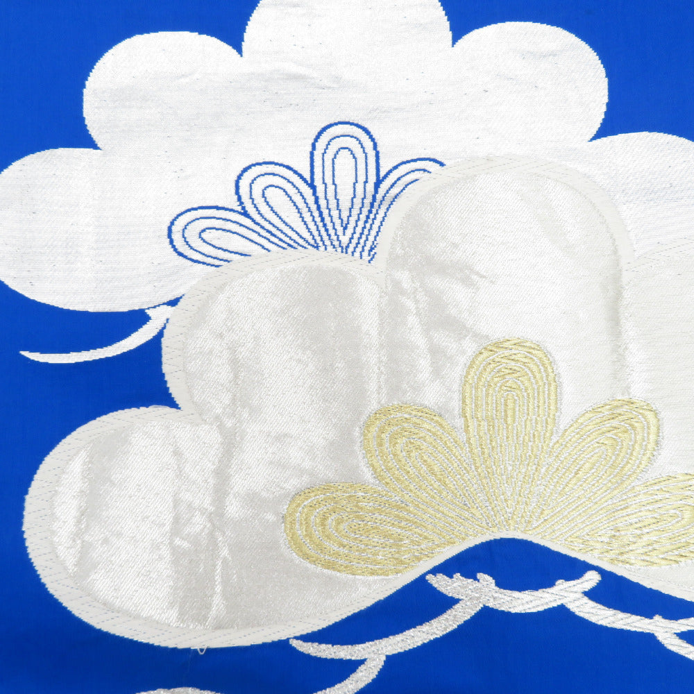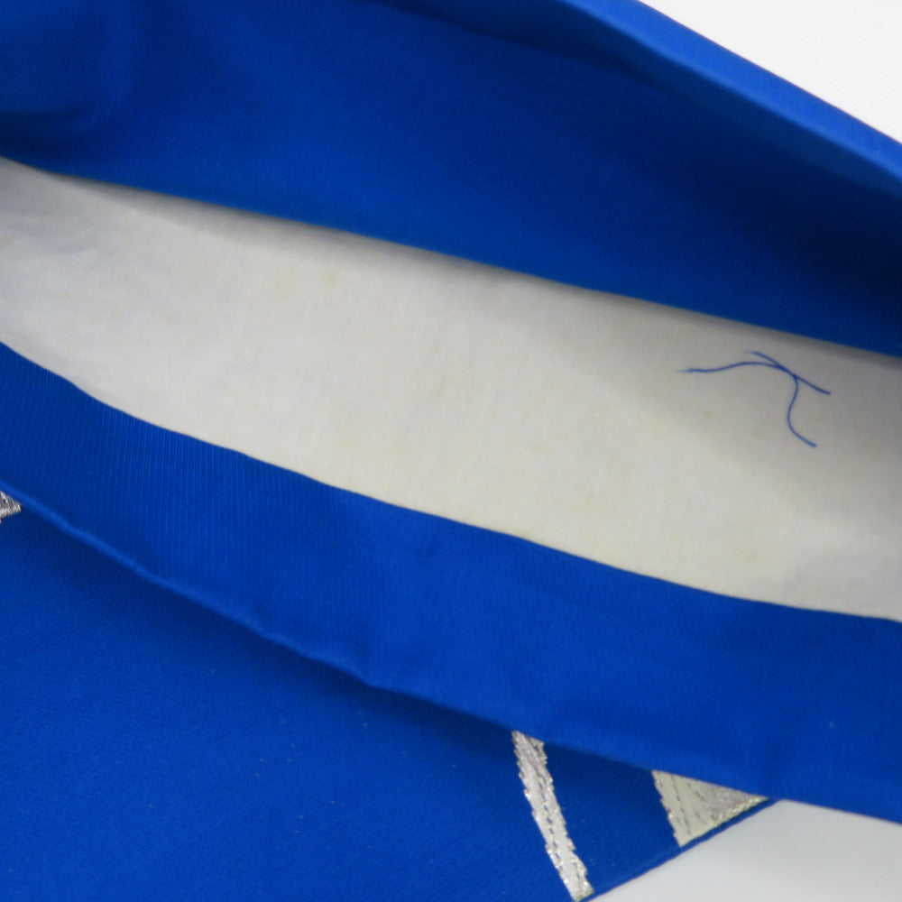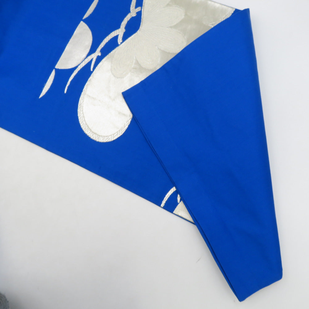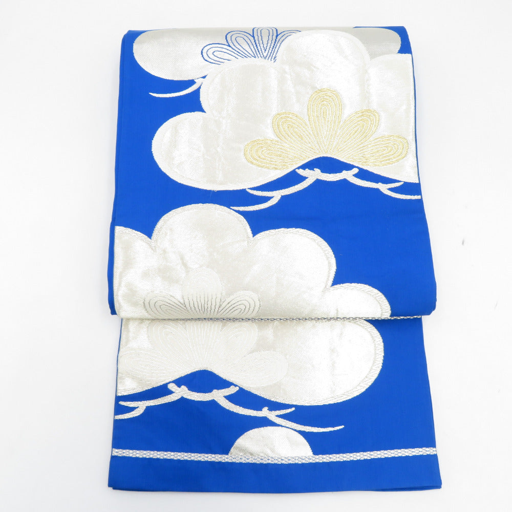 袋帯 振袖用 ブルー系 青色x銀色 松紋様 六通柄 正絹 仕立ての糸とじ無し 着物帯 長さ424cm