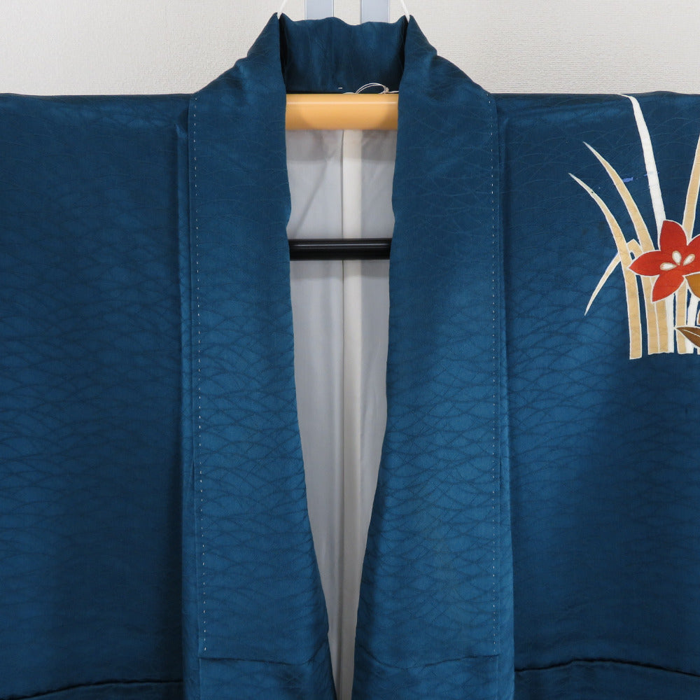 付下げ 袷 ターコイズブルーx朱色x多色 草花紋様 広衿 正絹 仕立て上がり着物 身丈159cm