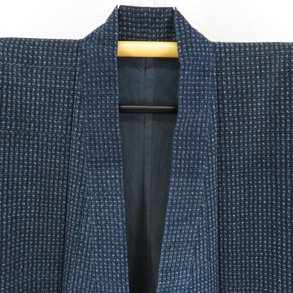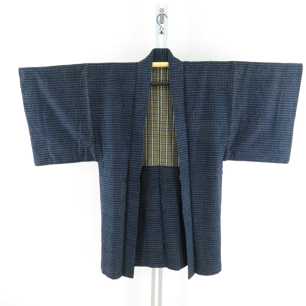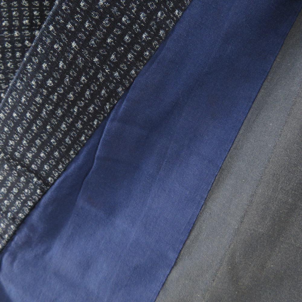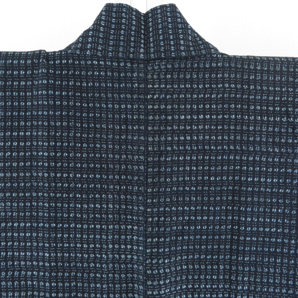 男着物 アンティーク 木綿 アンサンブル 書生絣 紺色x青色x灰色 袷 カジュアル着物 羽織 着流し 身丈133cm