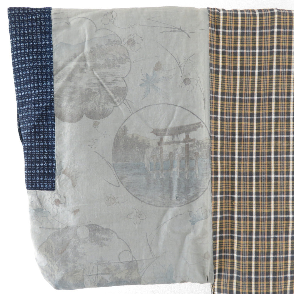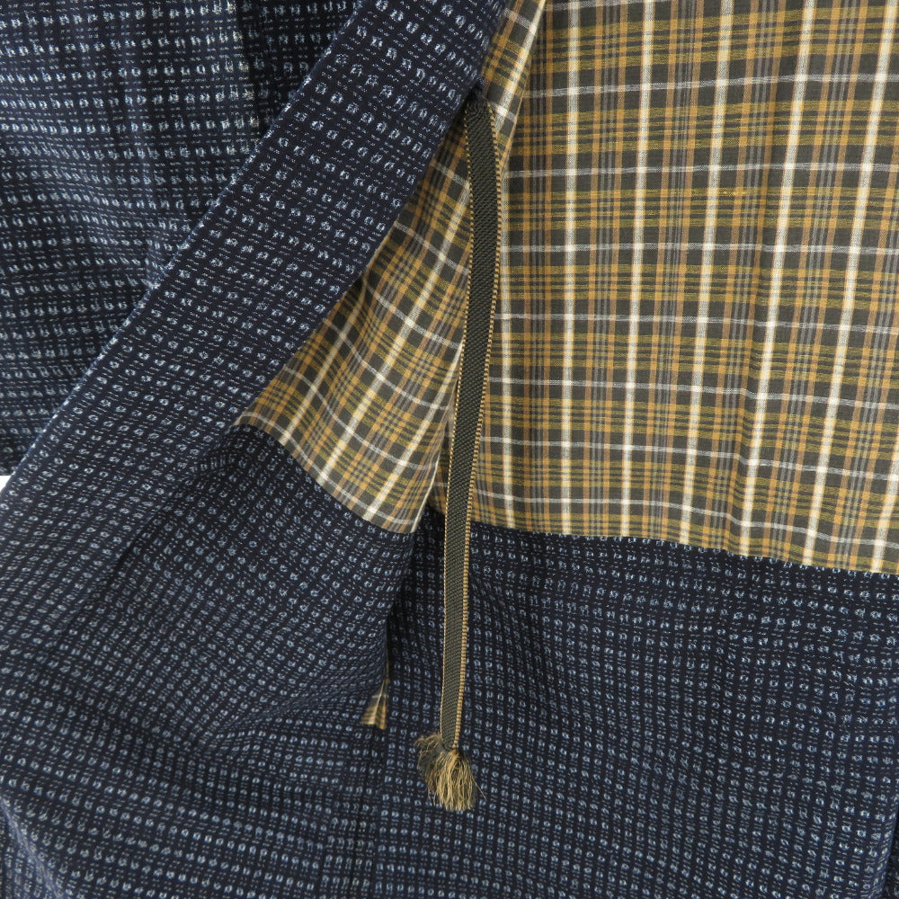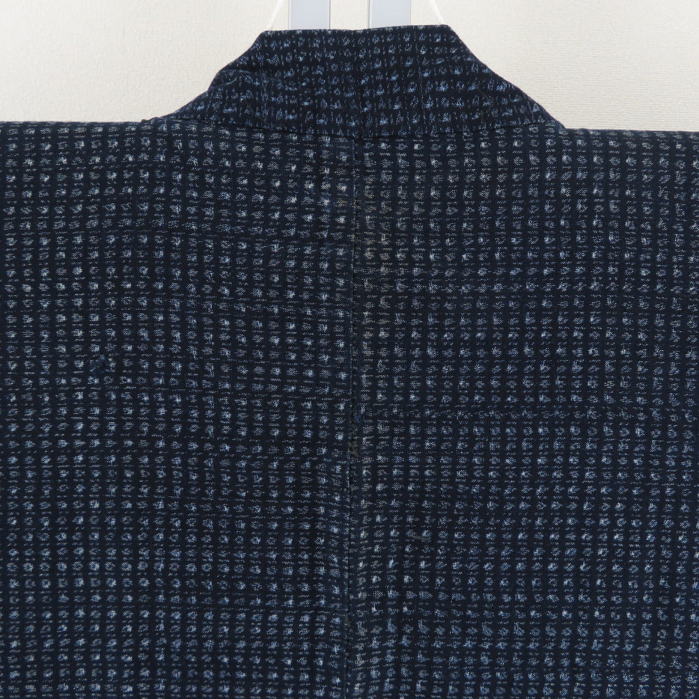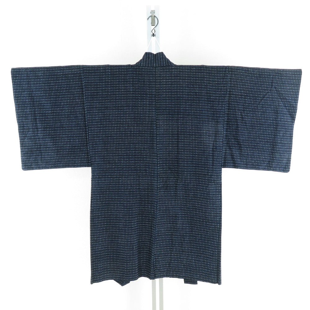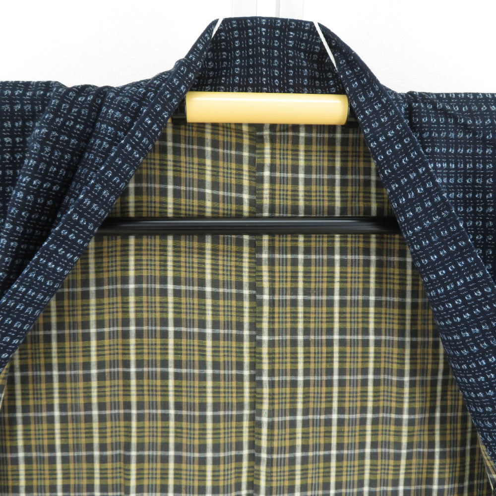 男着物 アンティーク 木綿 アンサンブル 書生絣 紺色x青色x灰色 袷 カジュアル着物 羽織 着流し 身丈133cm