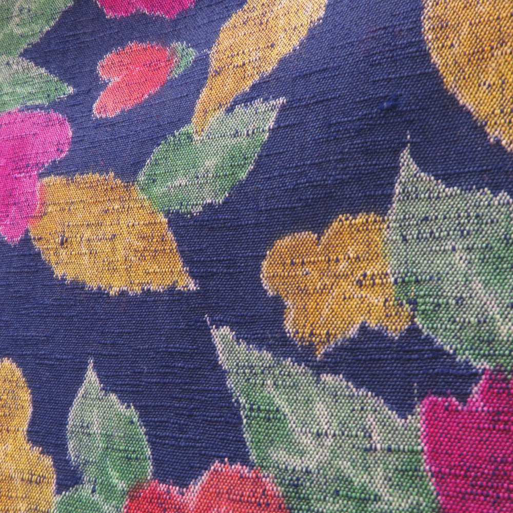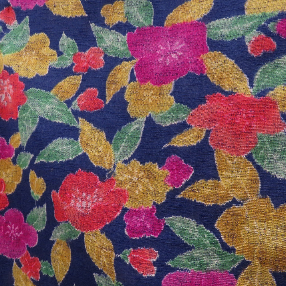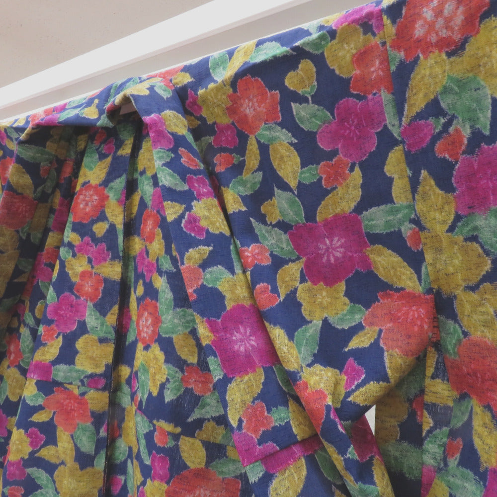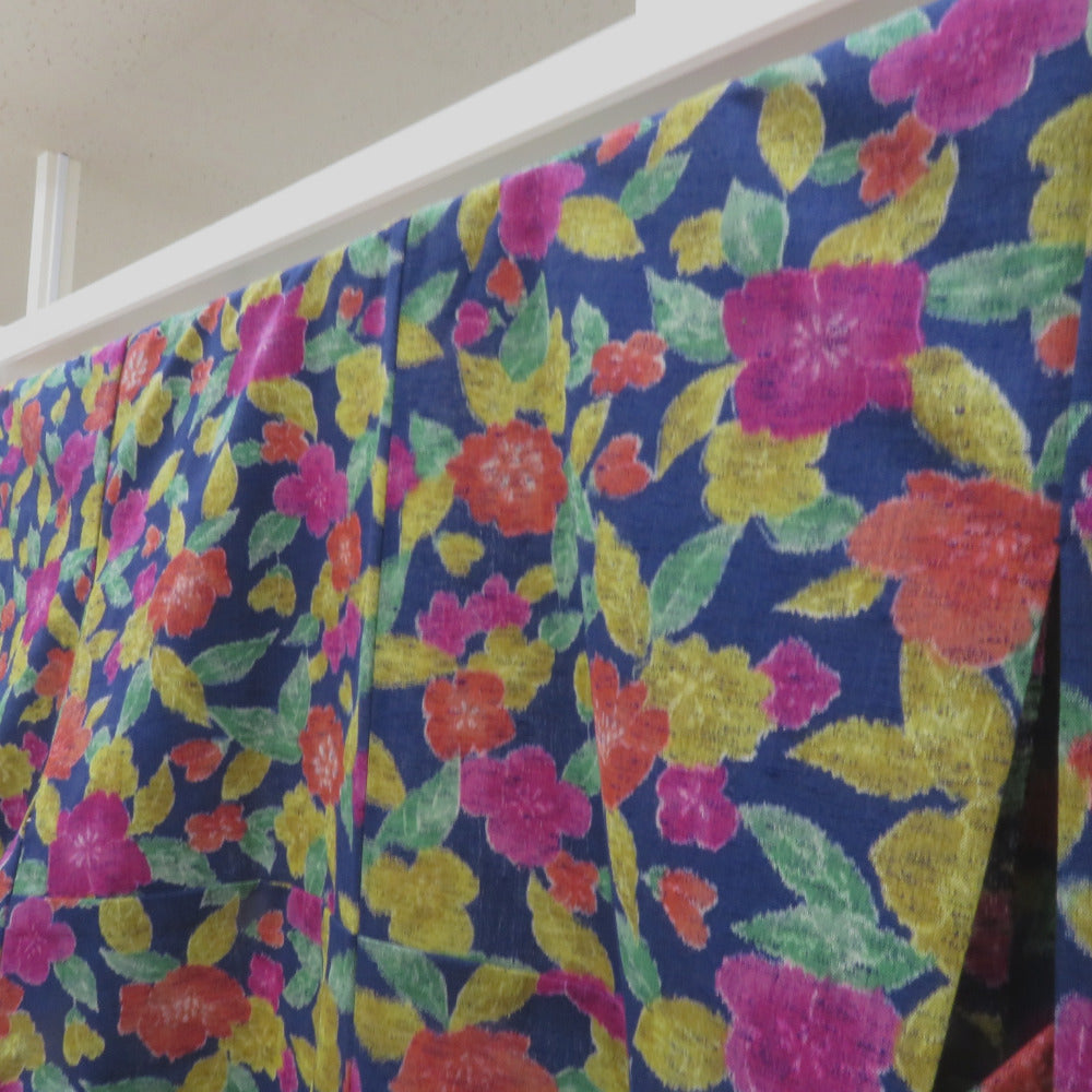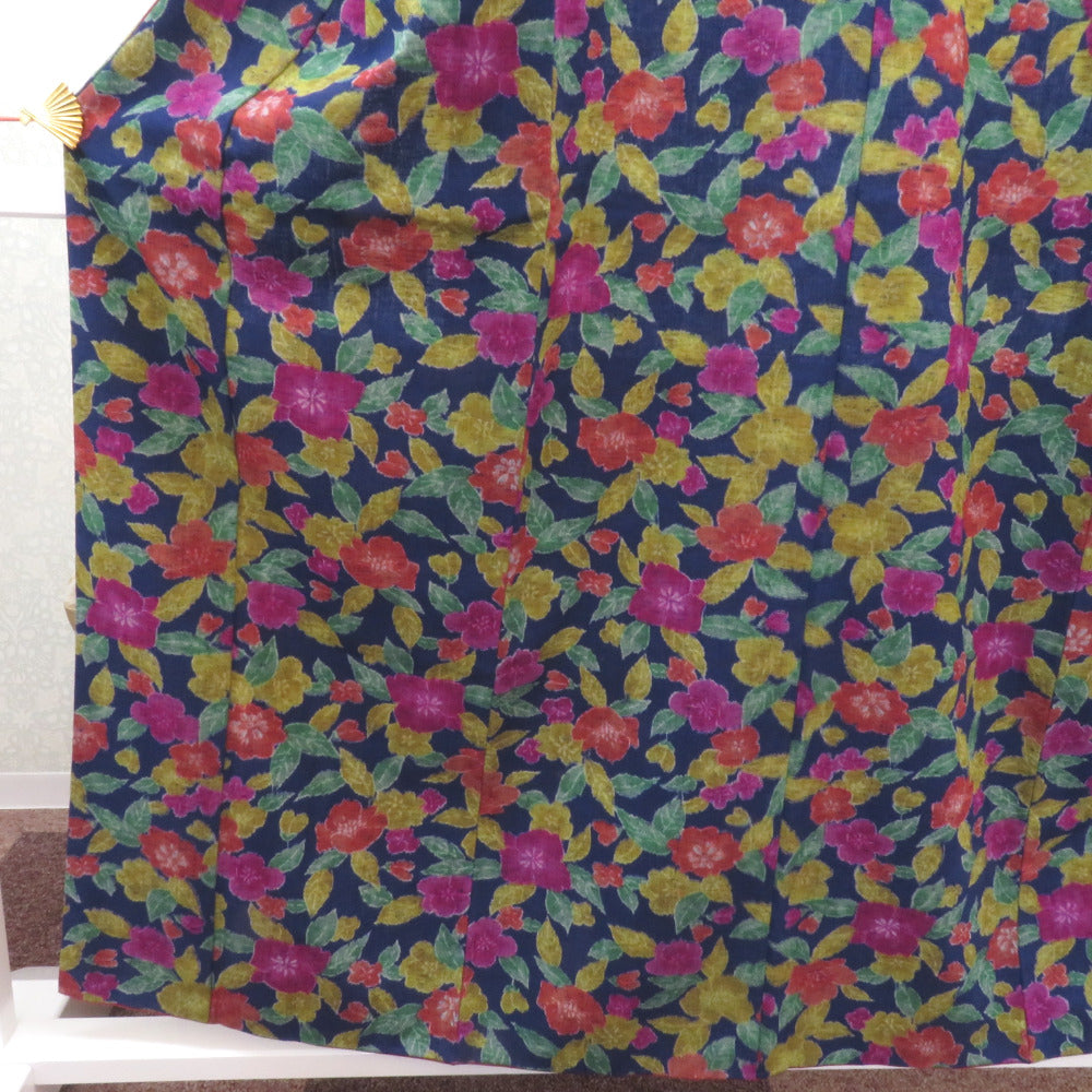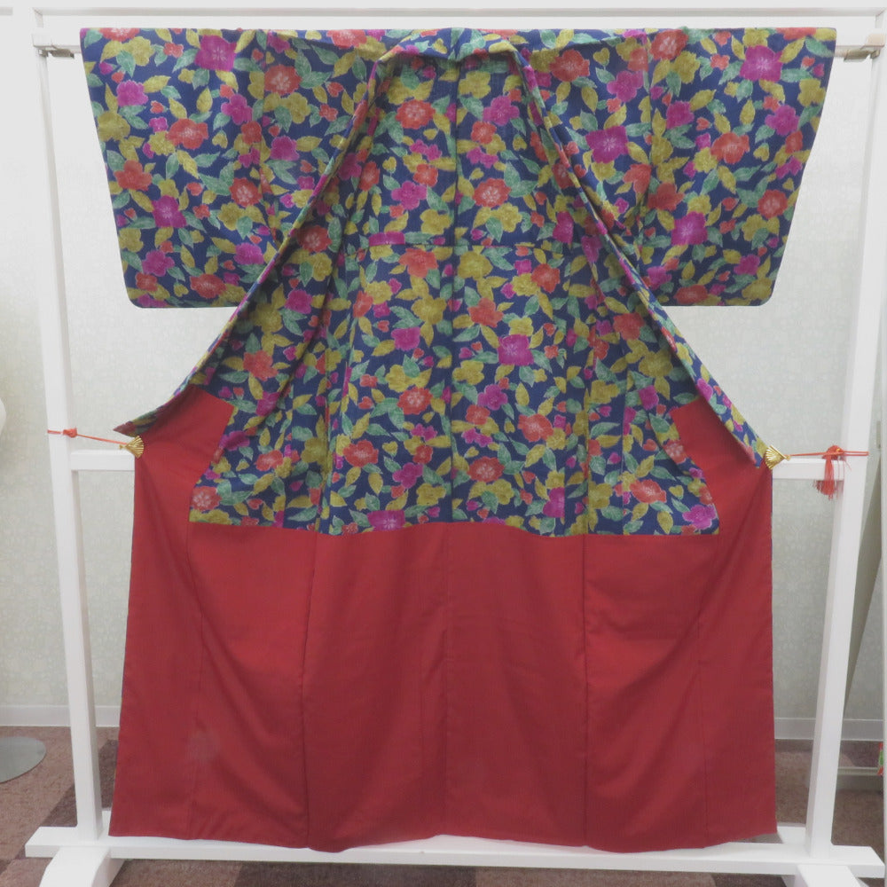 ウール着物 袷仕立て 紺×ピンク×オレンジ×黄色×黄緑 花柄 バチ衿 カジュアルきもの 普段着物 仕立て上がり ウールきもの 和洋ミックス 身丈159.7cm