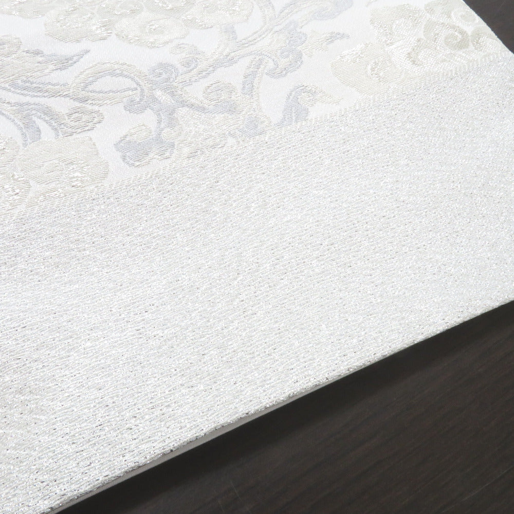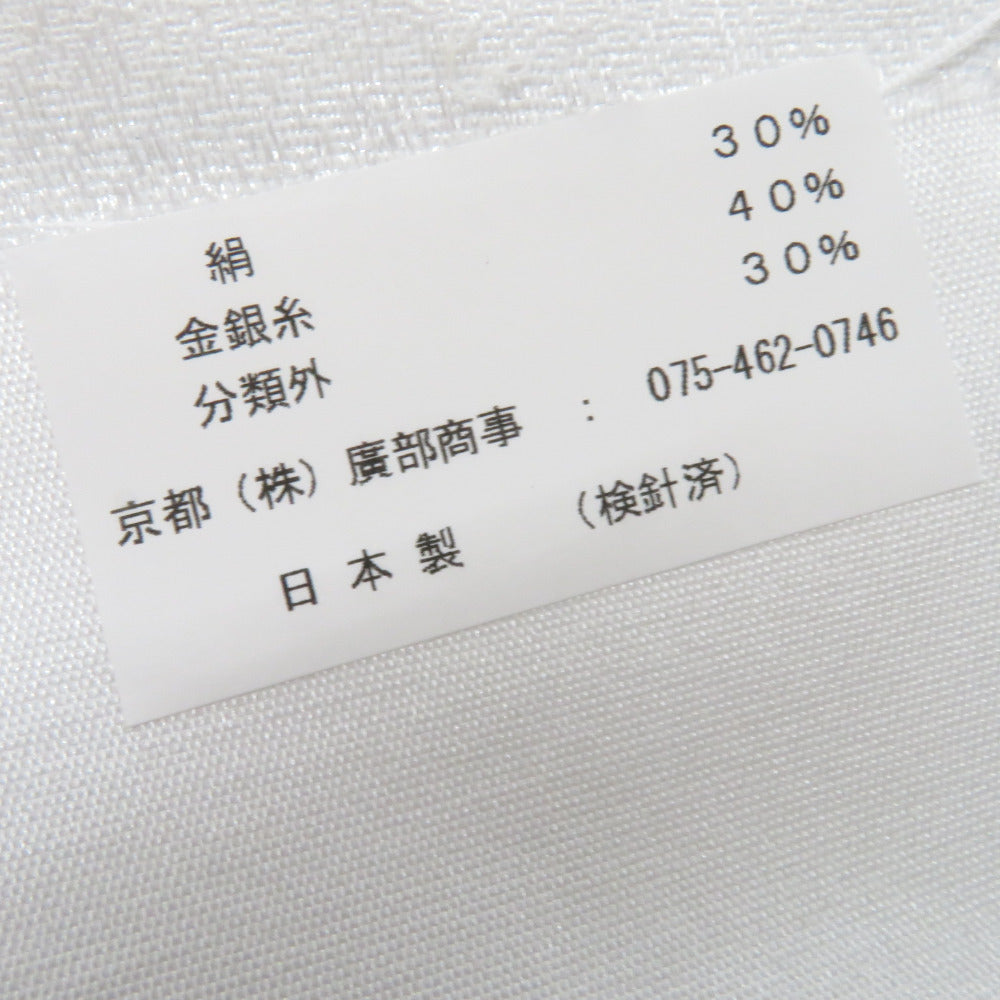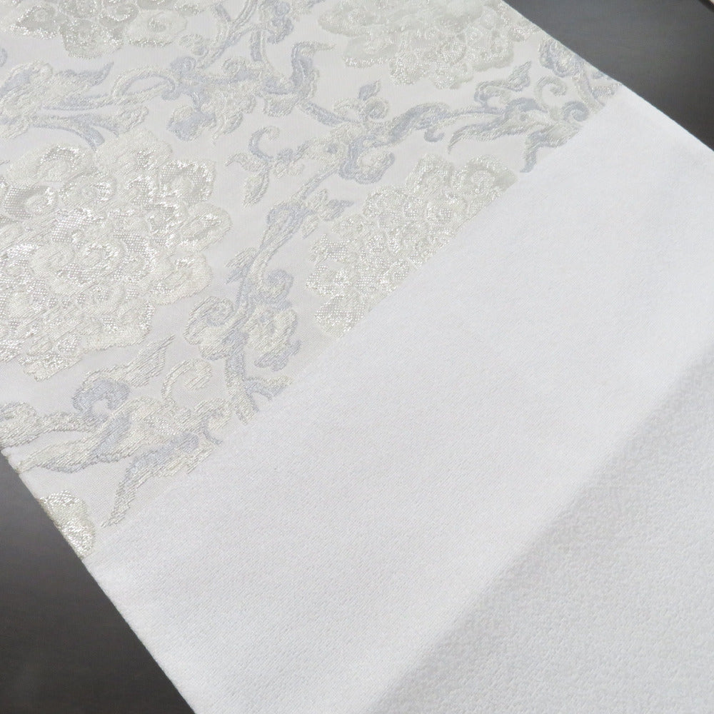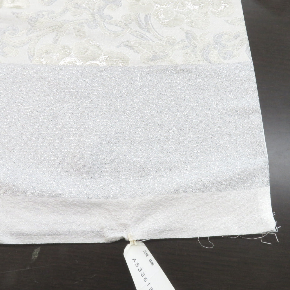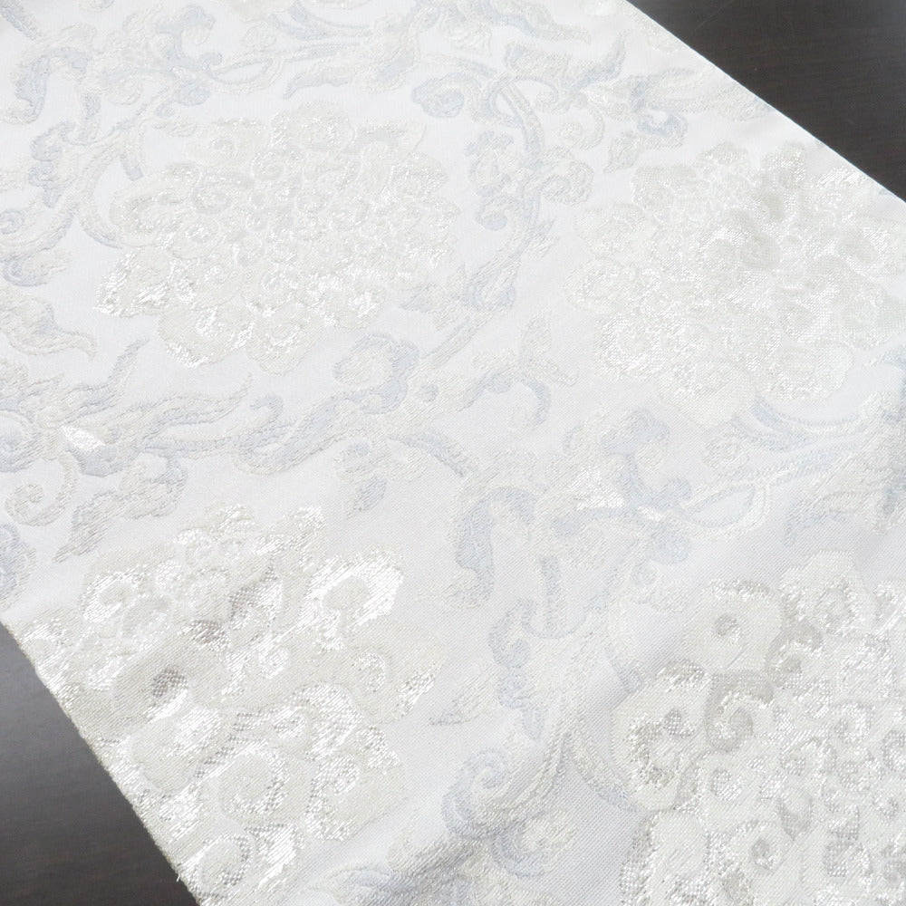 袋帯 振袖用 白×銀×ブルー系 唐花柄 六通柄 未仕立て 着物帯 フォーマル 日本製 長さ447cm