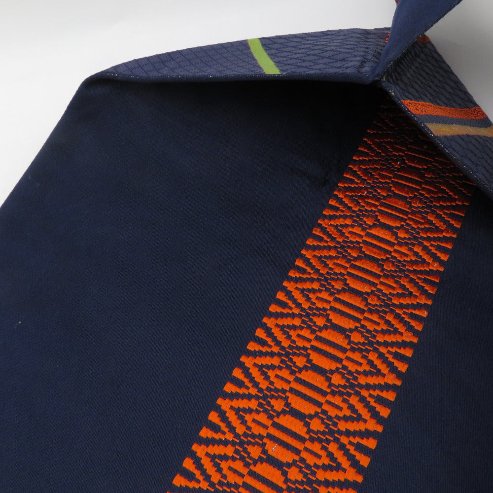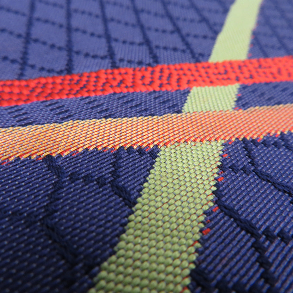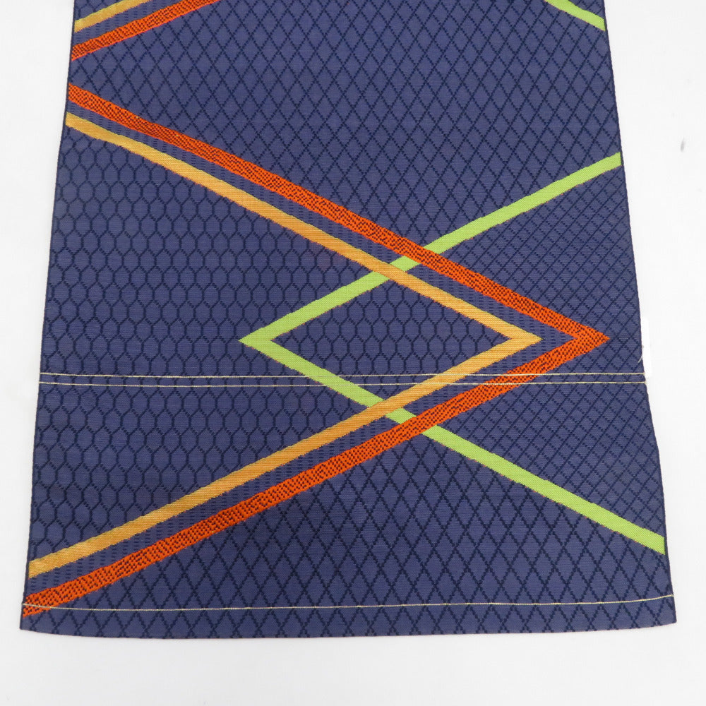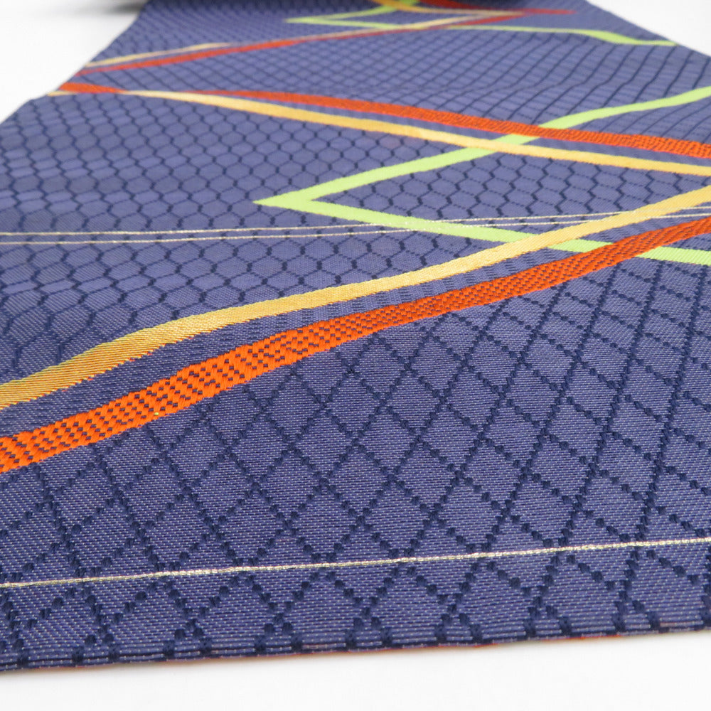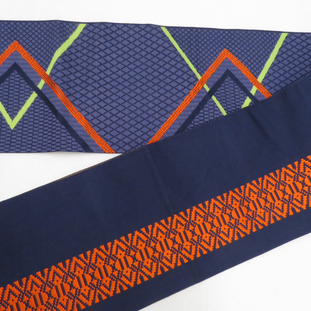 名古屋帯 正絹 八寸帯 紺色xオレンジ色x黄緑色 ジグザグ模様 献上柄 名古屋仕立て 全通柄 仕立て上がり 着物帯