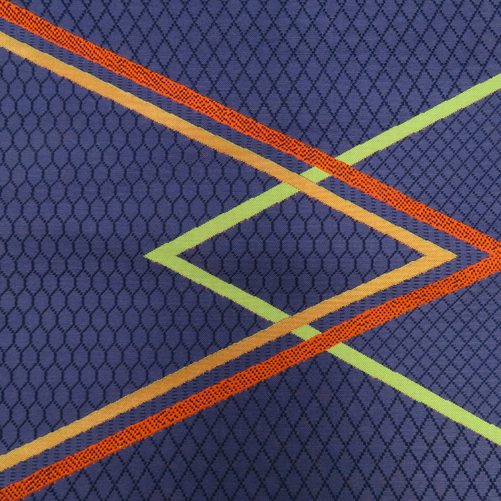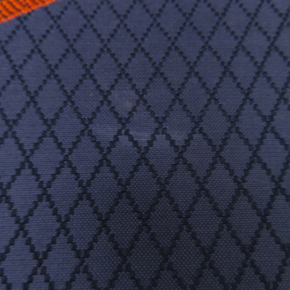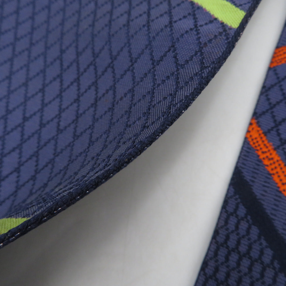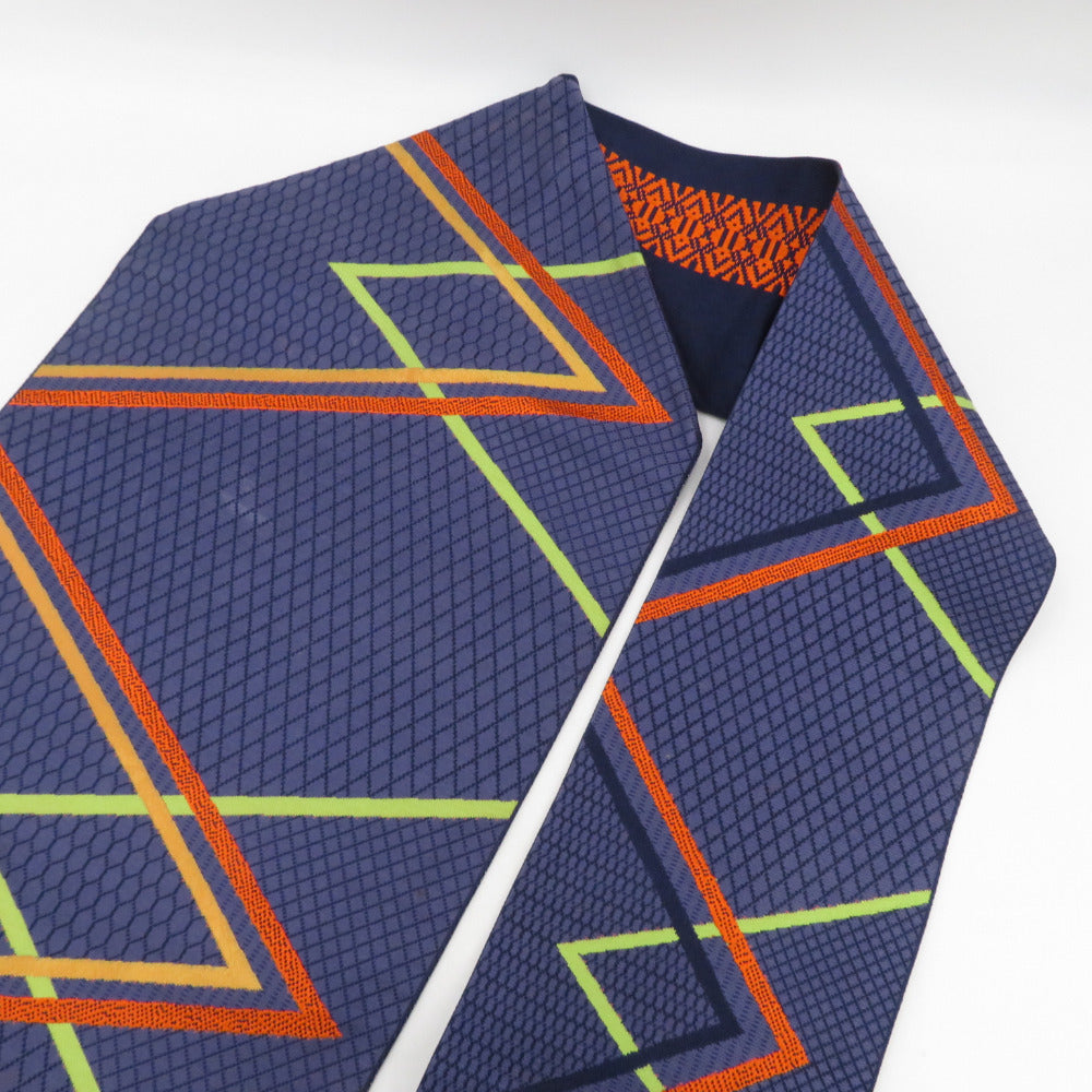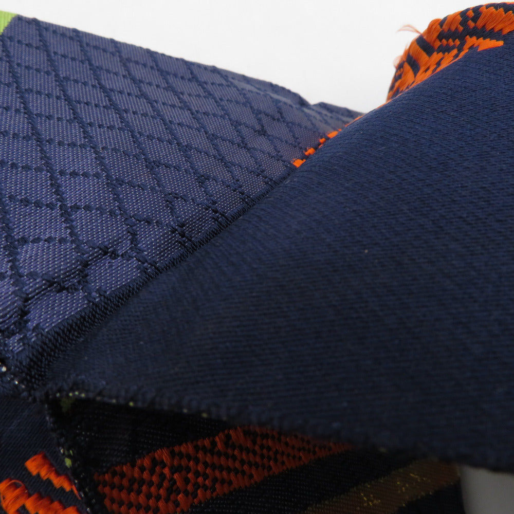 名古屋帯 正絹 八寸帯 紺色xオレンジ色x黄緑色 ジグザグ模様 献上柄 名古屋仕立て 全通柄 仕立て上がり 着物帯