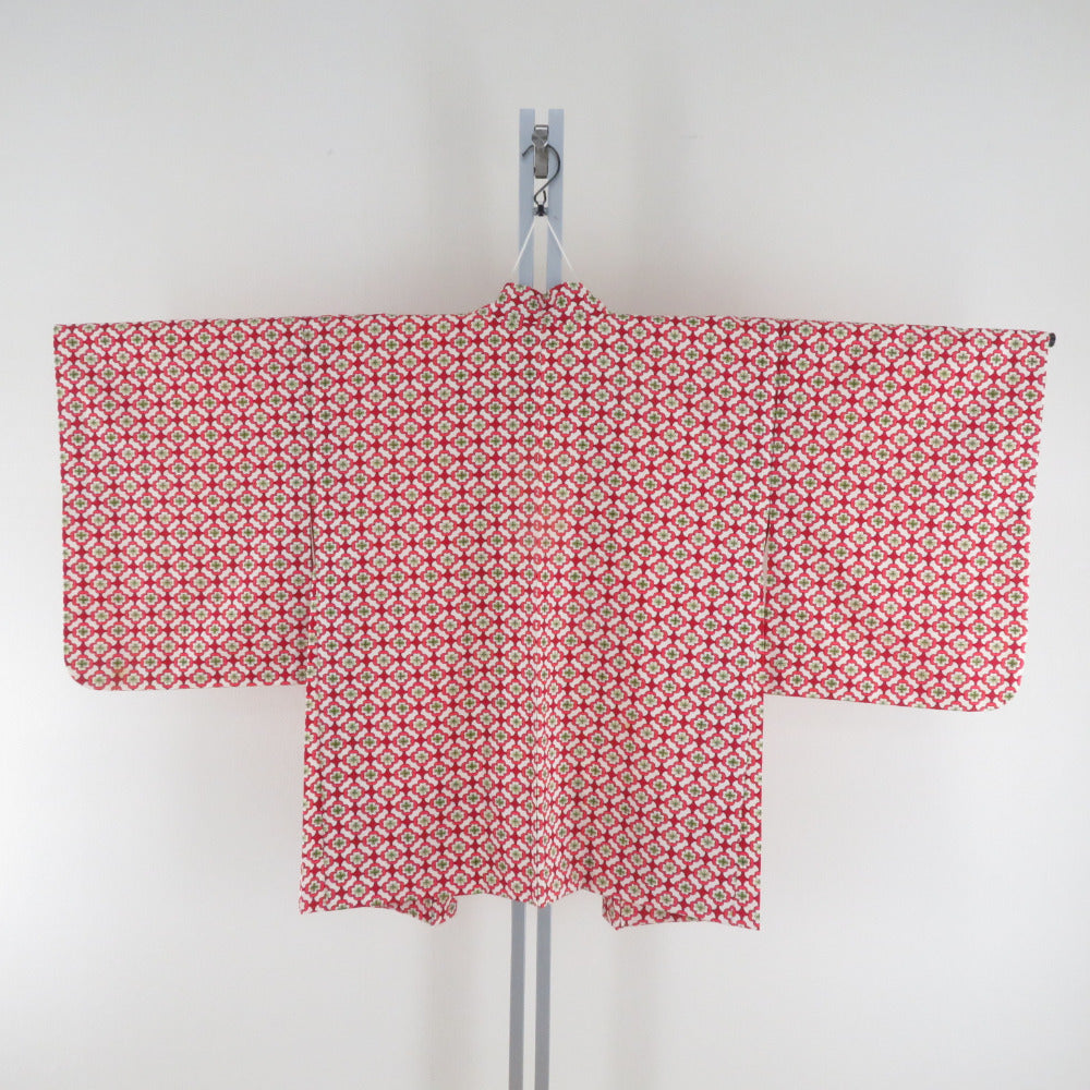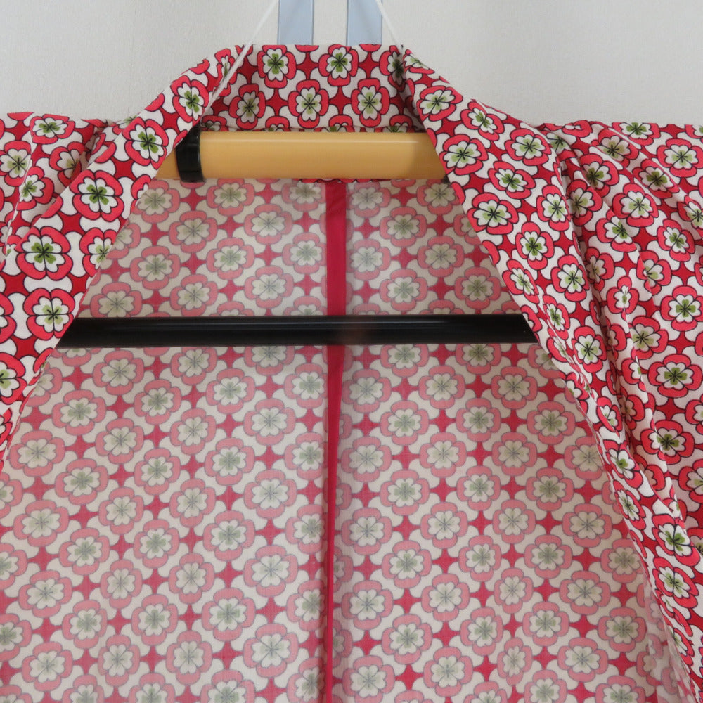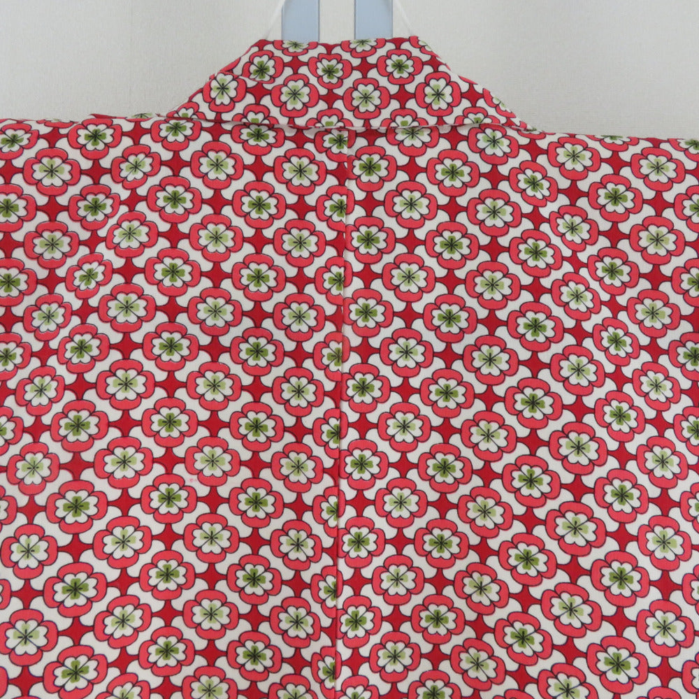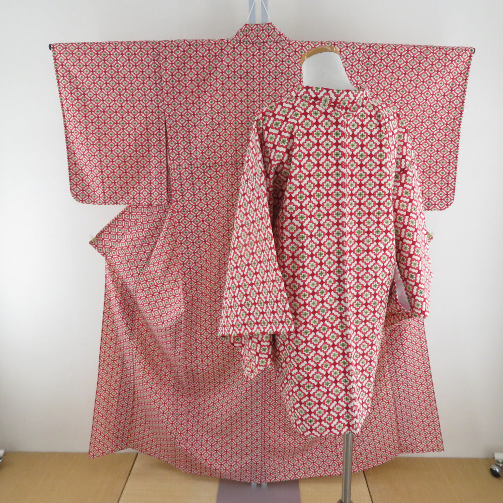 ウール着物 アンサンブル 着物と羽織2点セット 単衣 赤色x白色x黄緑 小花模様 バチ衿 カジュアルきもの 普段着物 仕立て上がり 身丈156cm