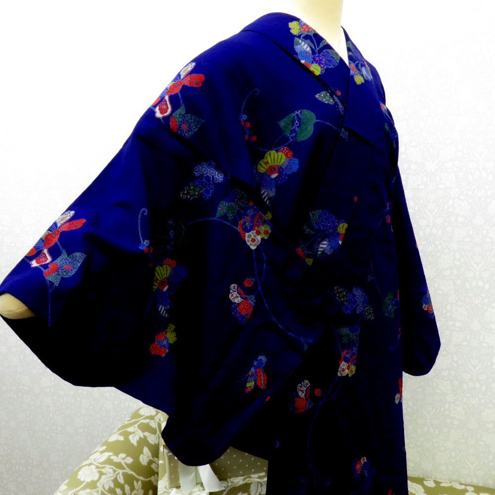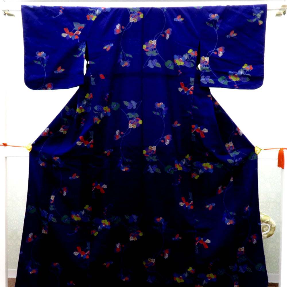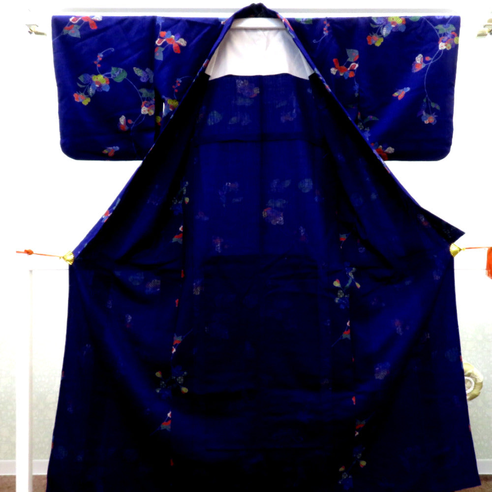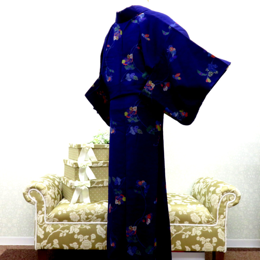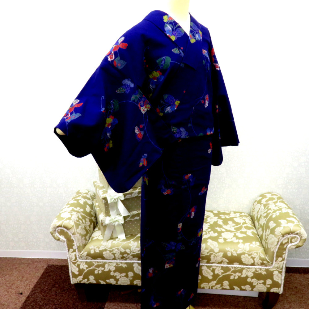 ウール着物 単衣 紺×多色 花蝶柄 バチ衿 カジュアルきもの 普段着物 ウールきもの 仕立て上がり 和洋ミックス 身丈155cm