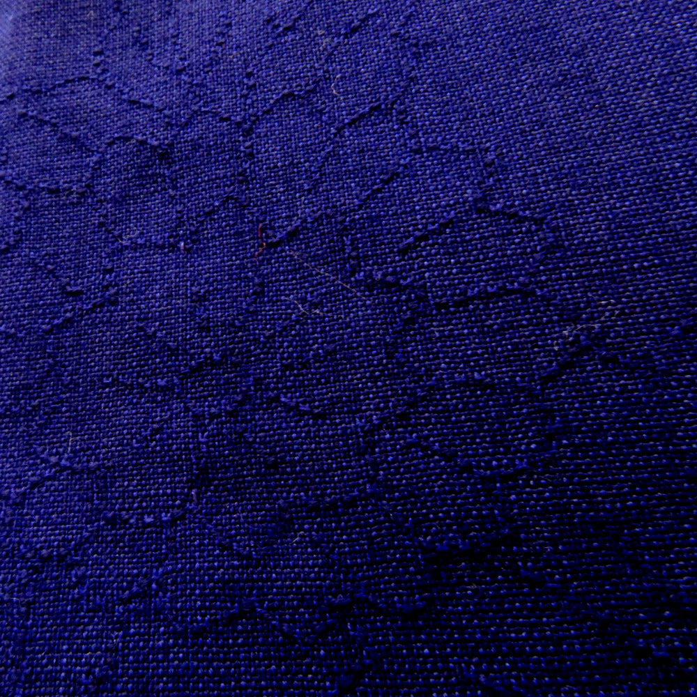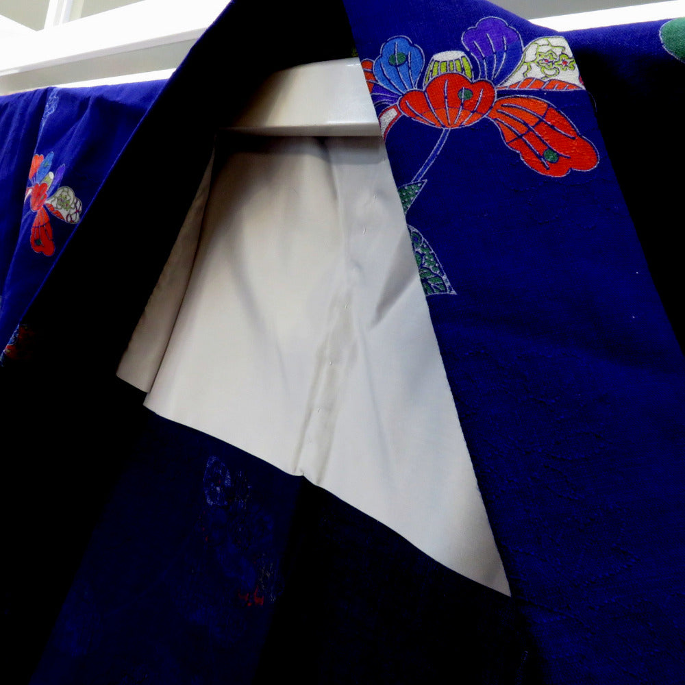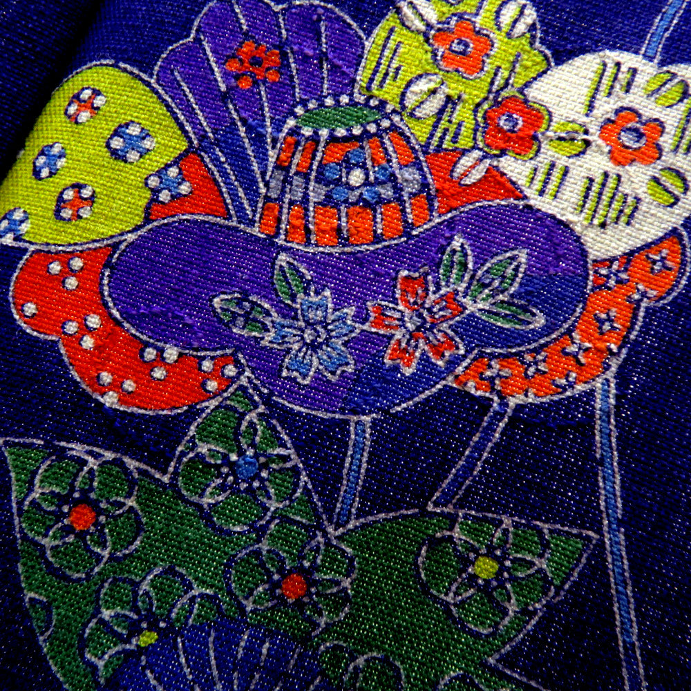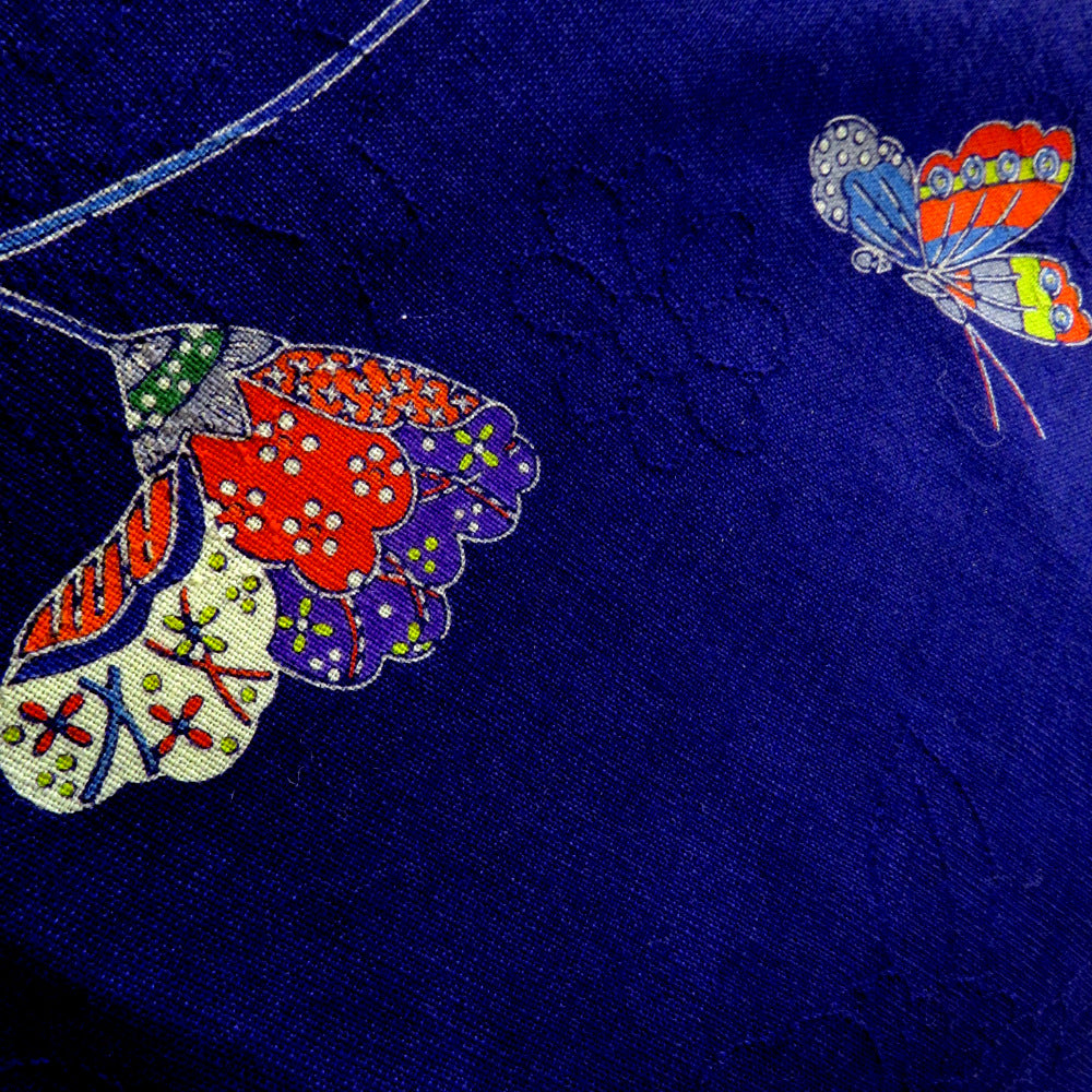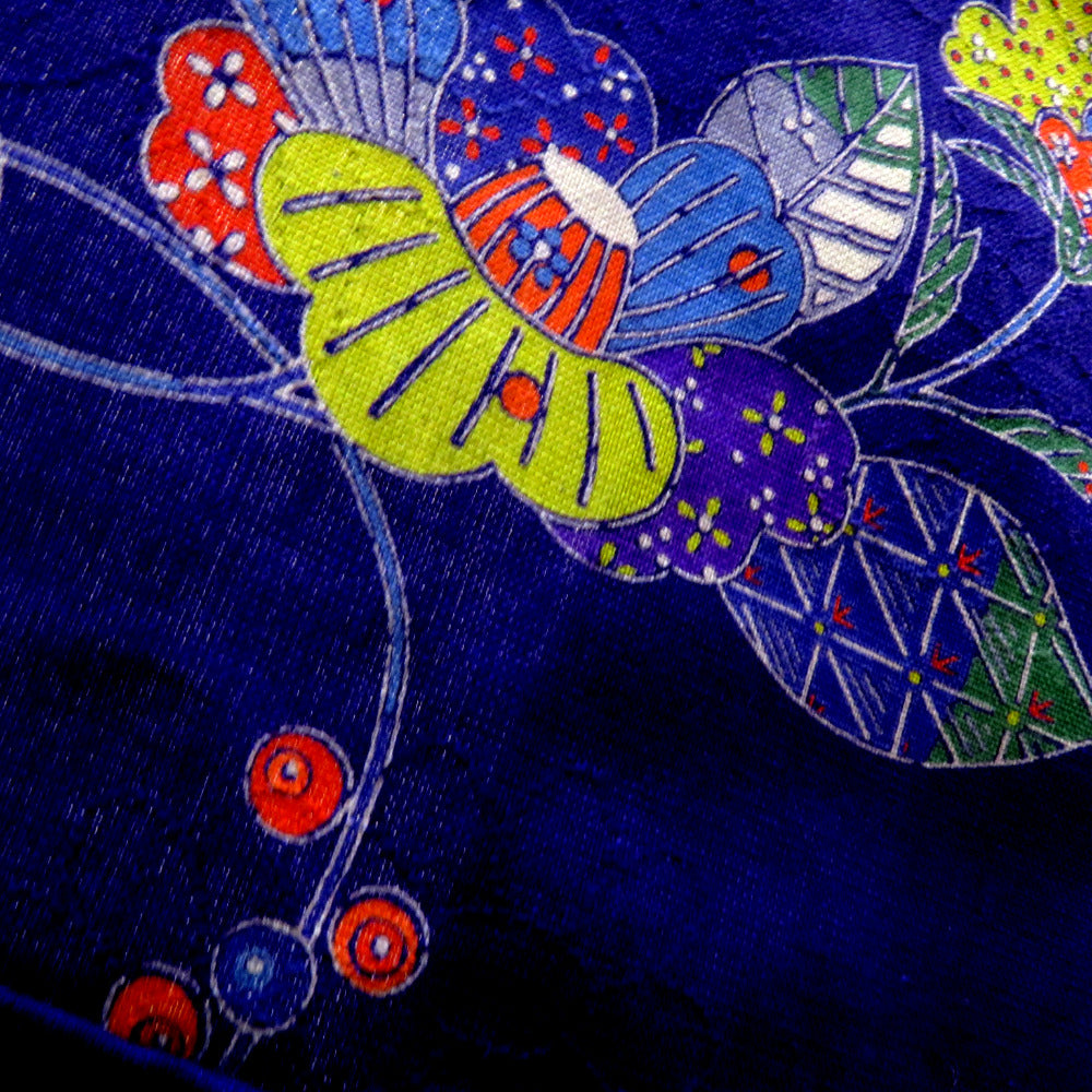 落ち着いた紺地に、多色使いの花や蝶が配置されステキ。生地に花の地模様織りあり。