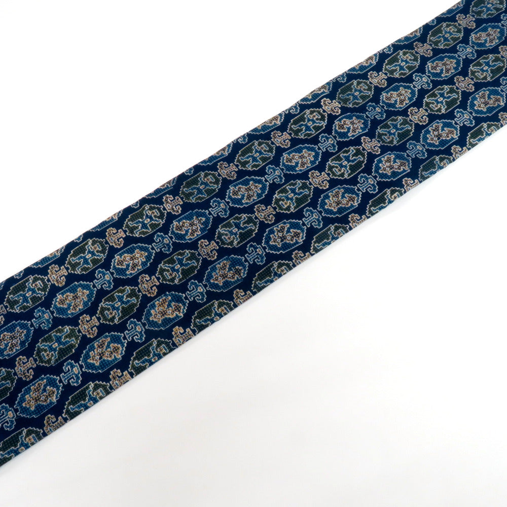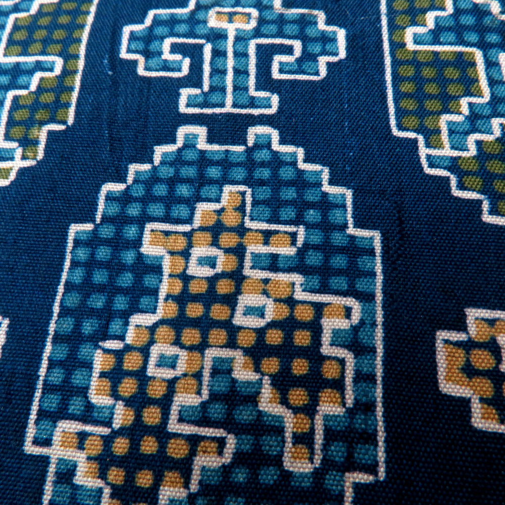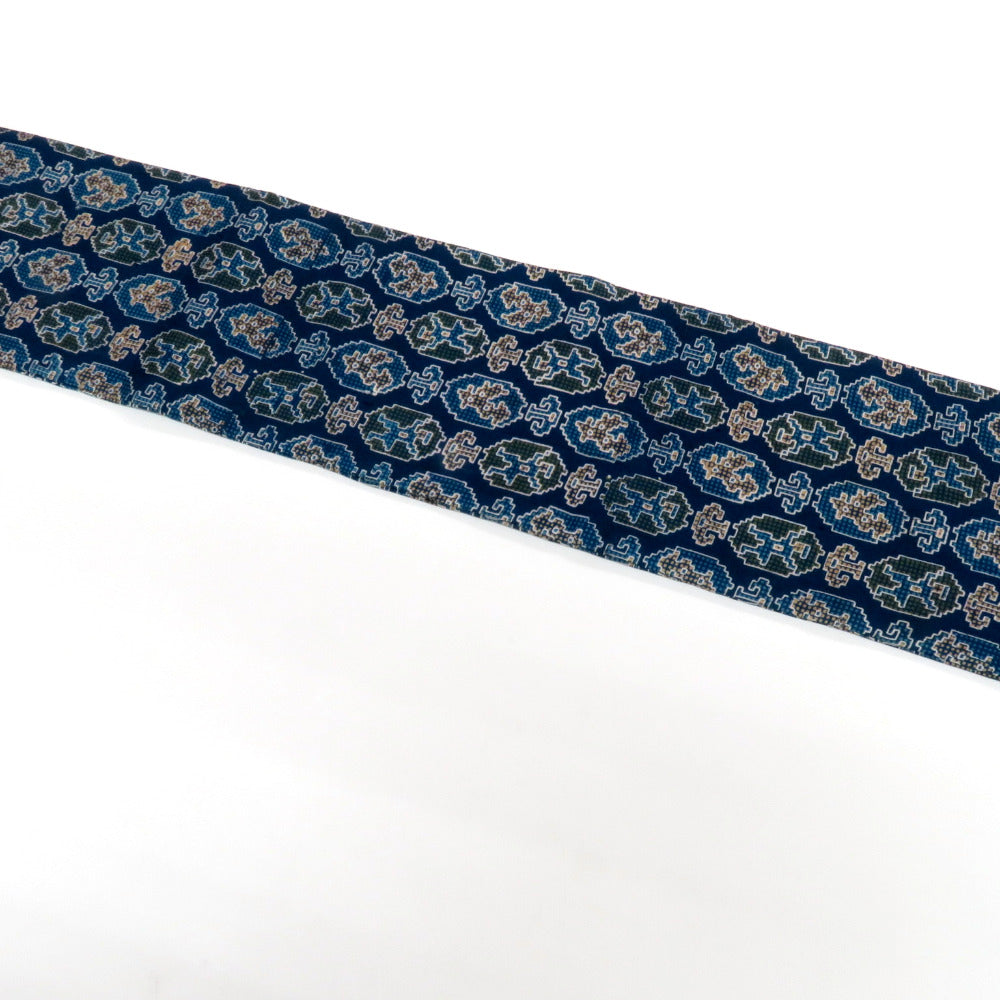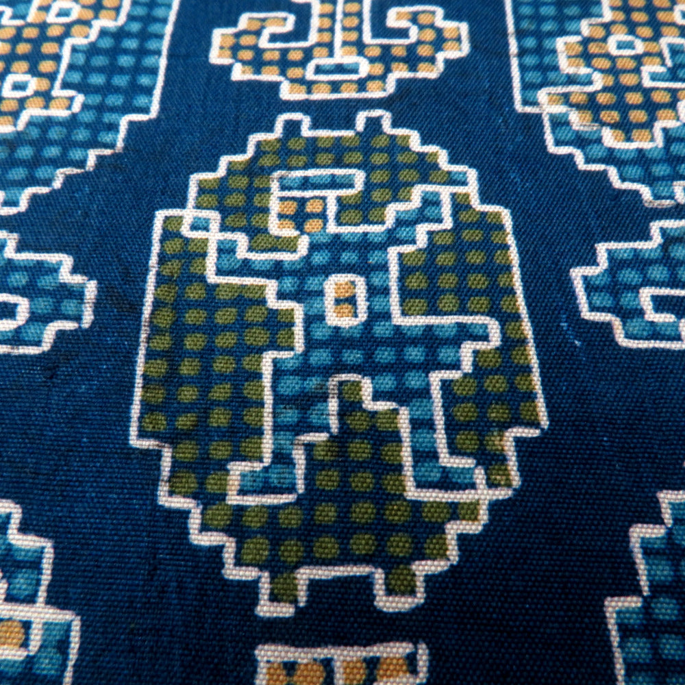 名古屋帯 アンティーク帯 昔名古屋帯 紺×ベージュ緑白青 人・幾何学調 ドット 昔帯 レトロモダン 明治・大正ロマン 正絹 裏面繻子 長さ342.2cm