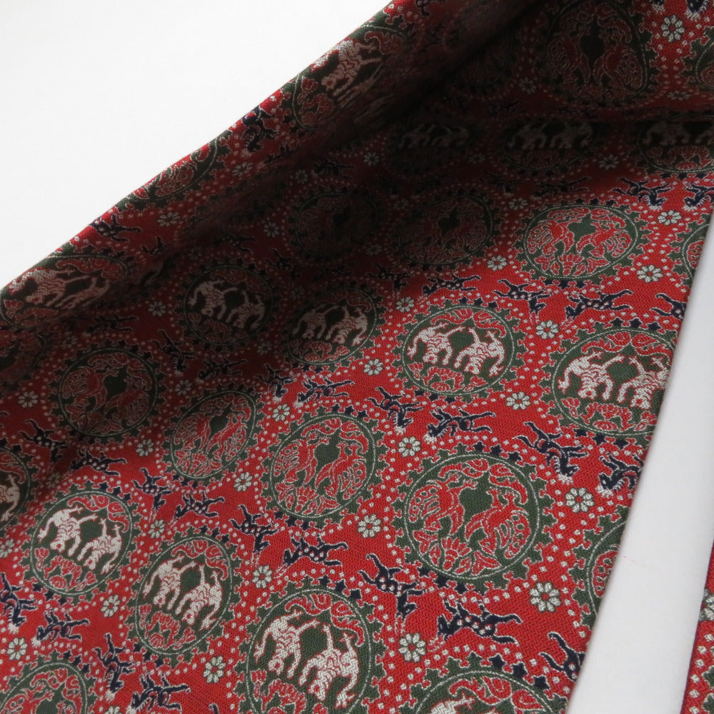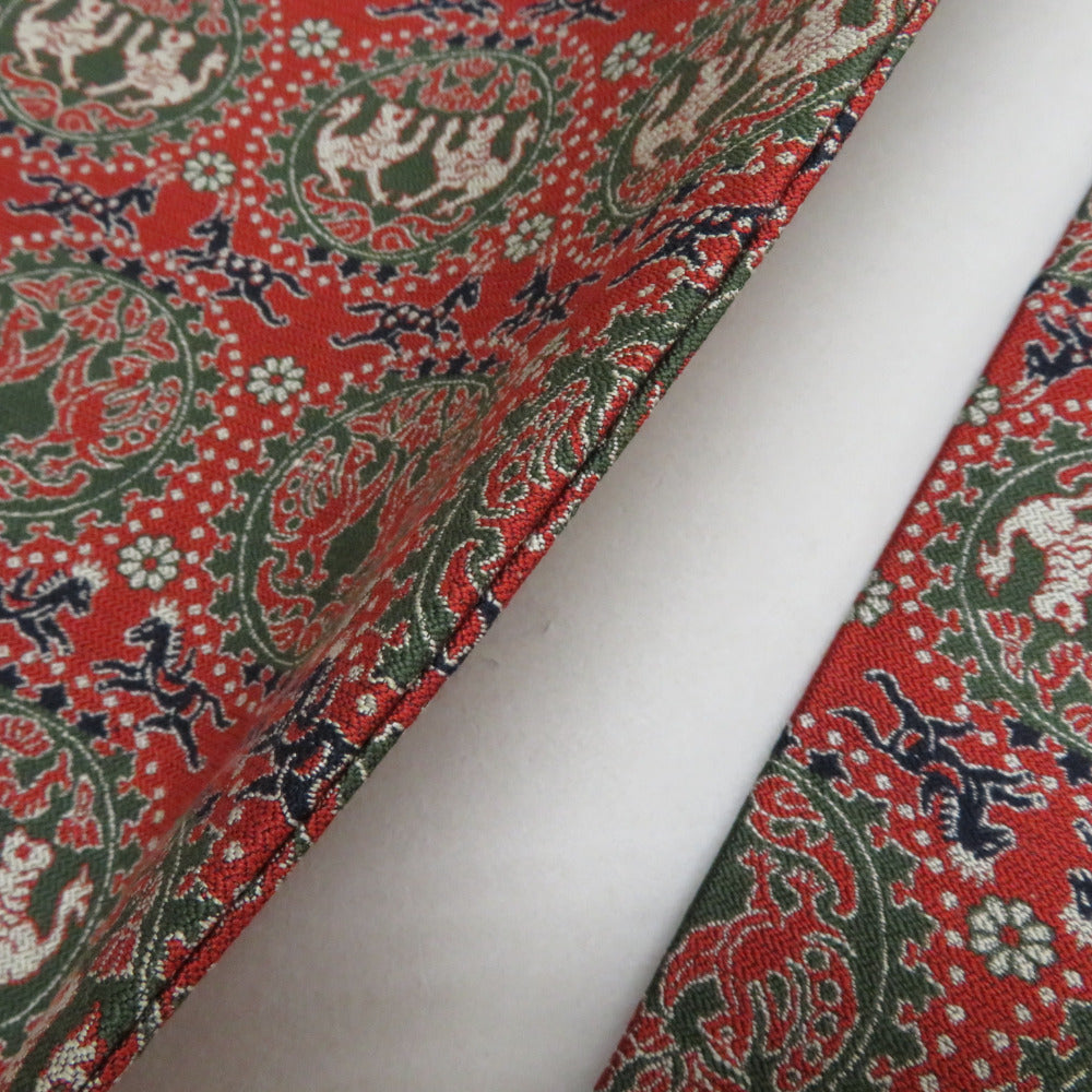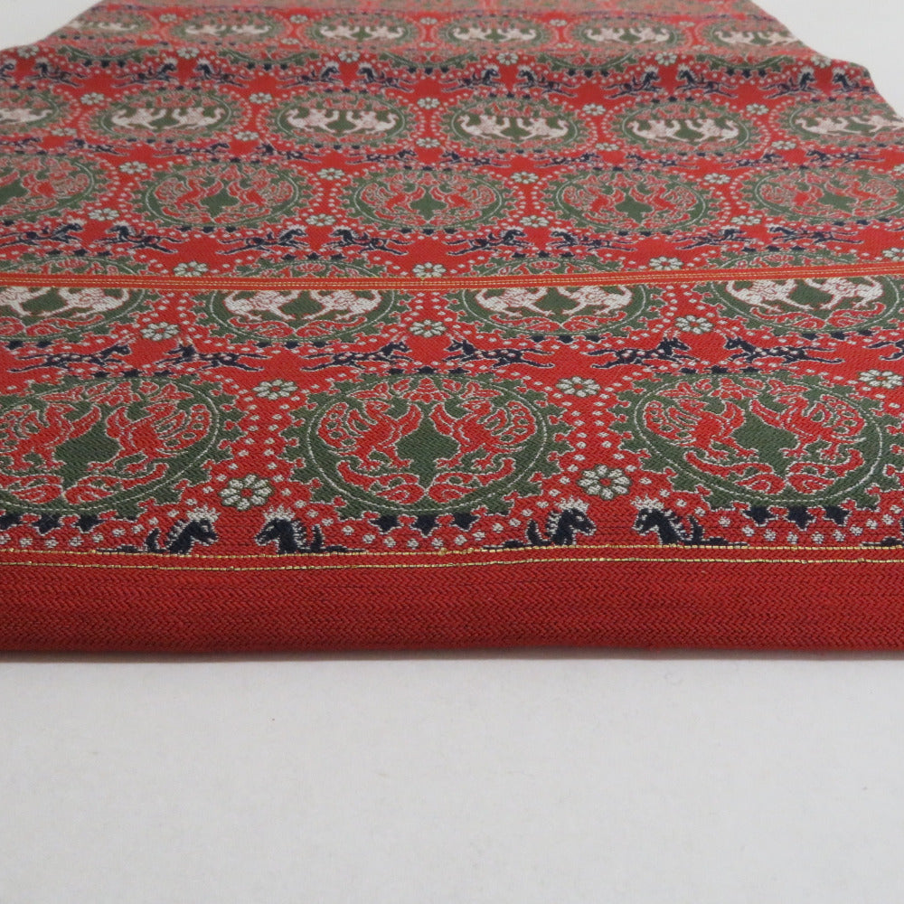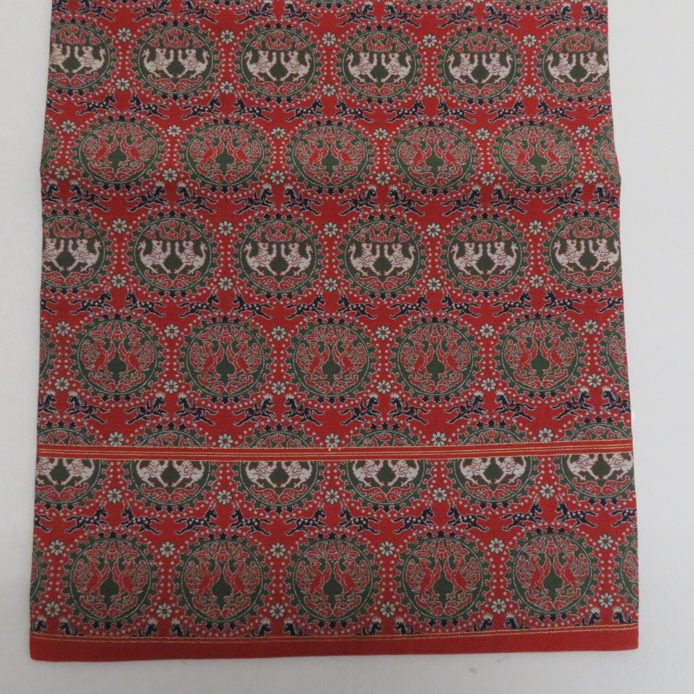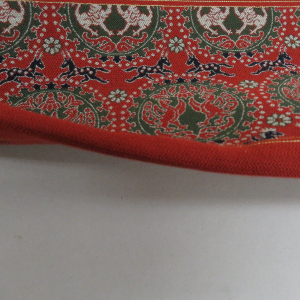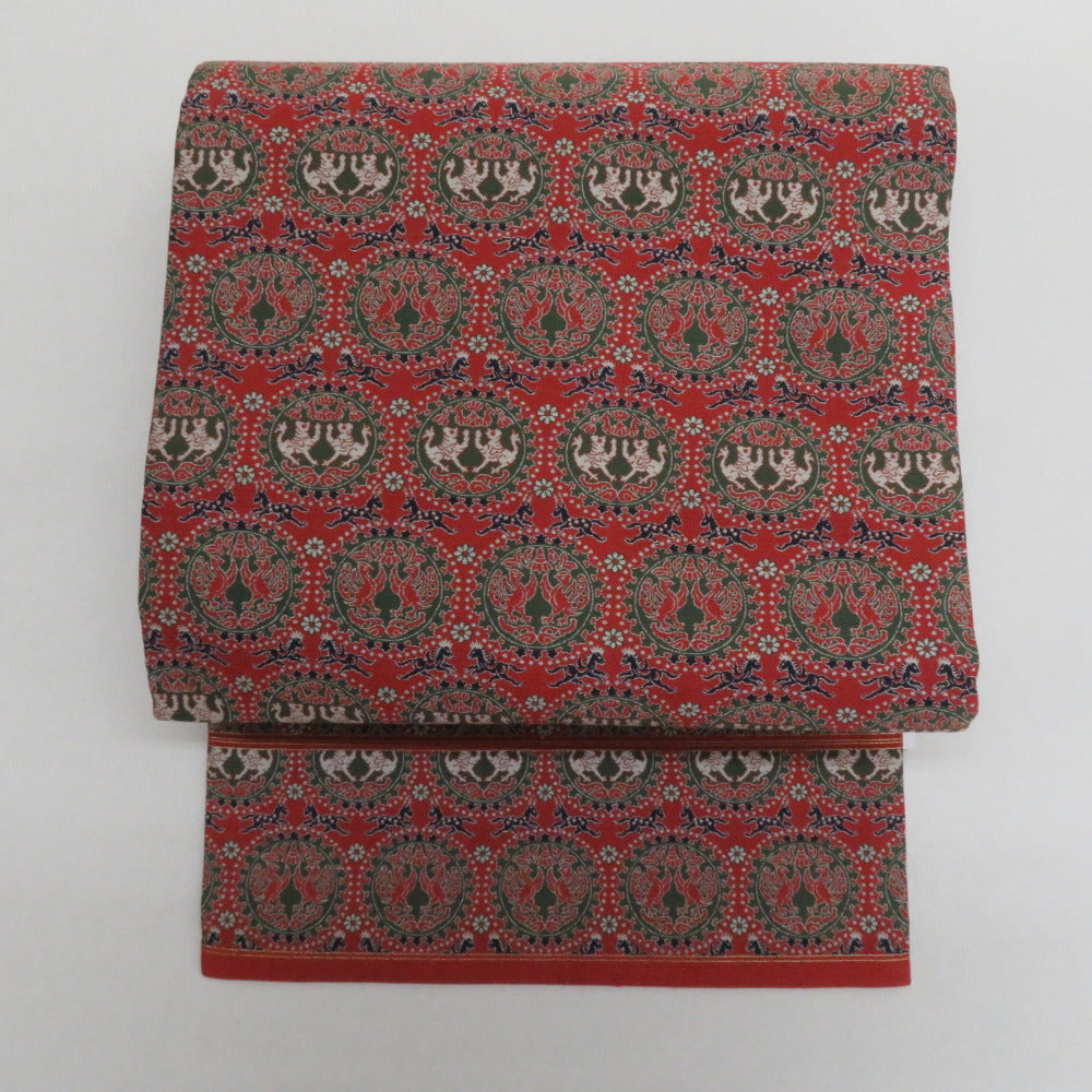 名古屋帯 朱色x緑色x紺色 正倉院模様 馬に丸文に白虎と朱雀 全通柄 正絹 カジュアル 仕立て上がり 着物帯 長さ334cm