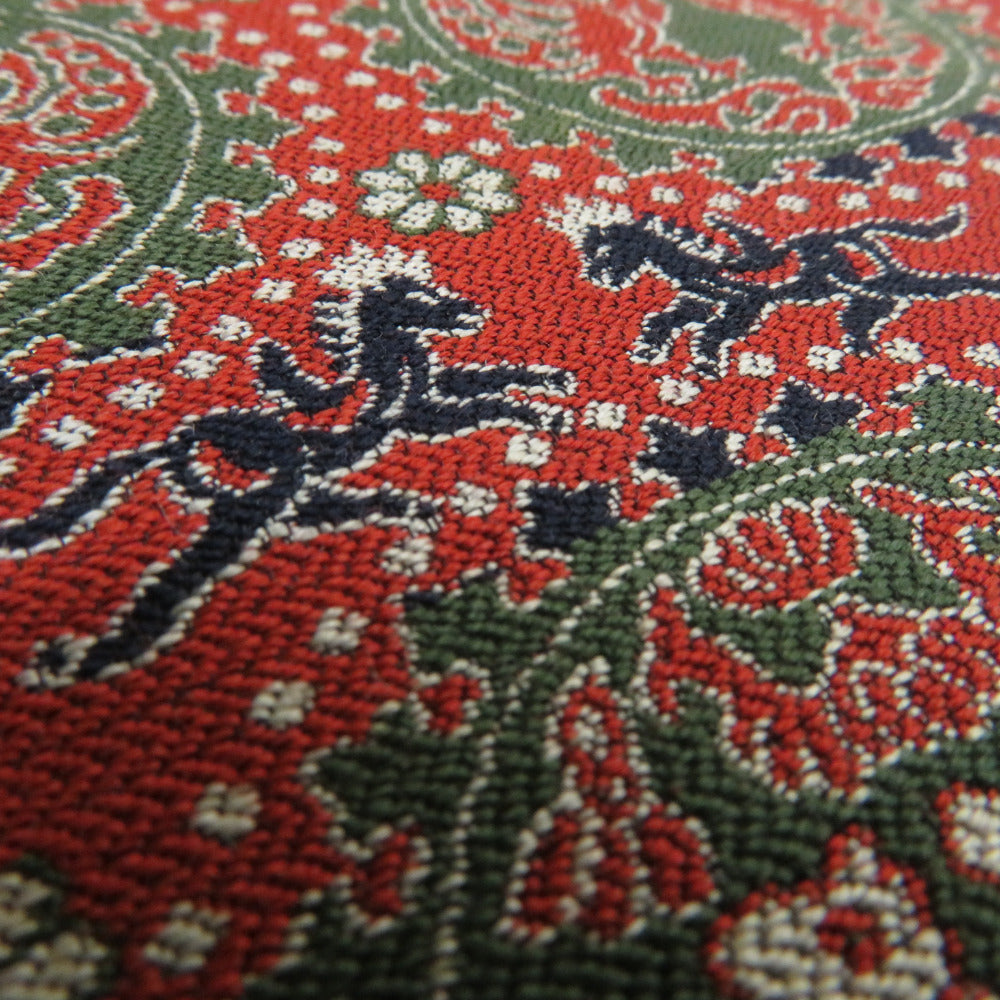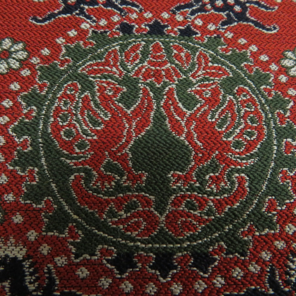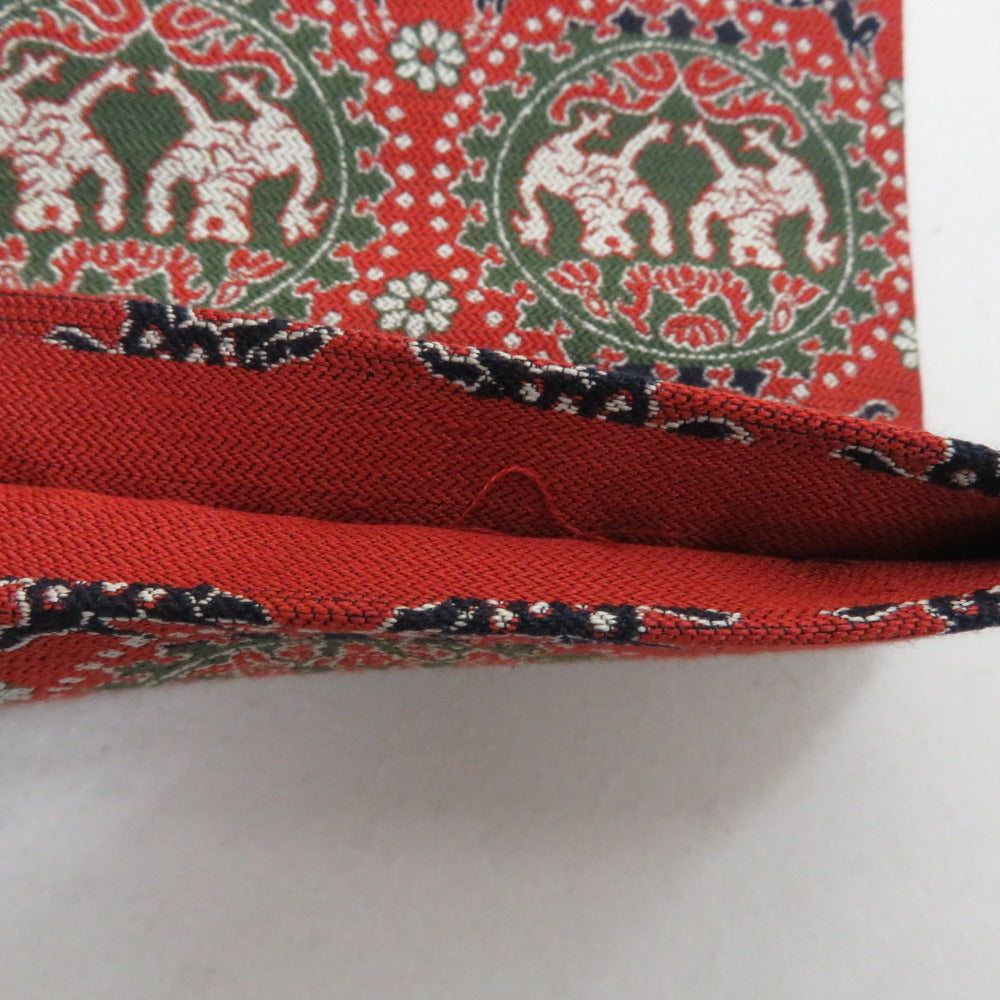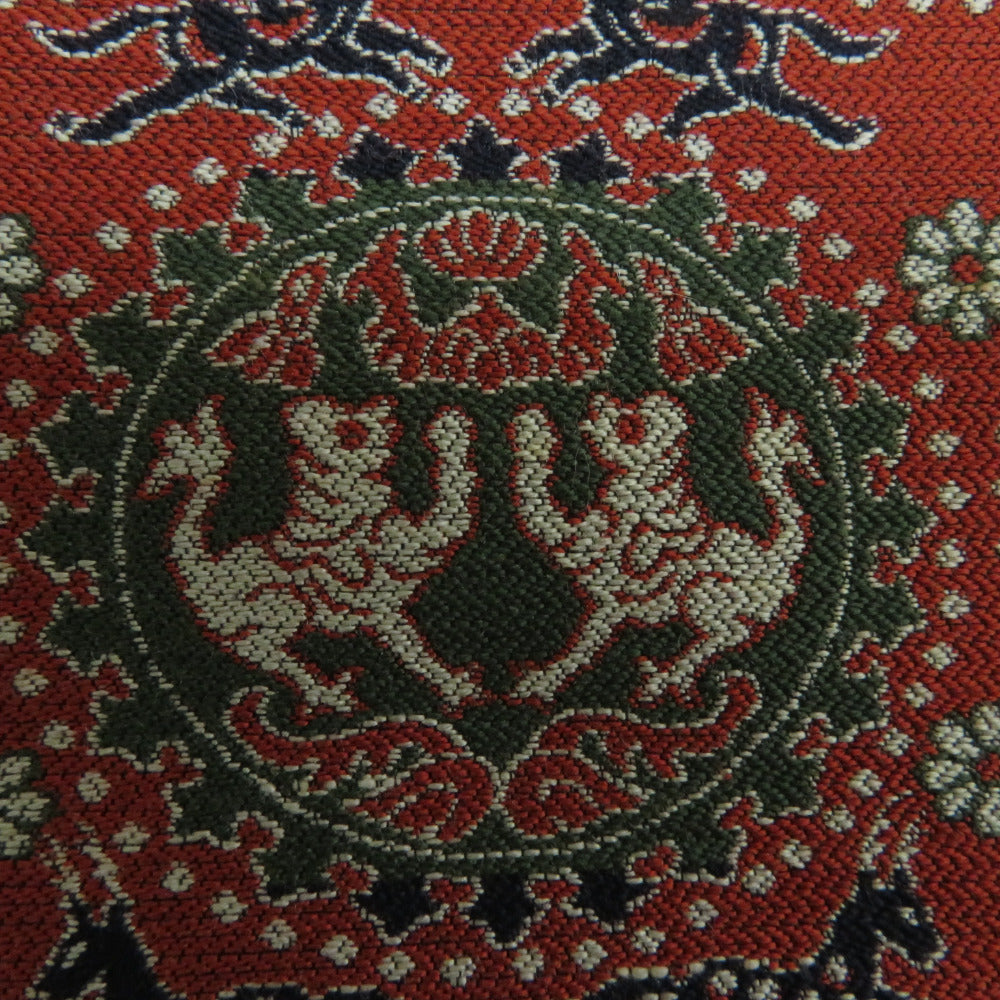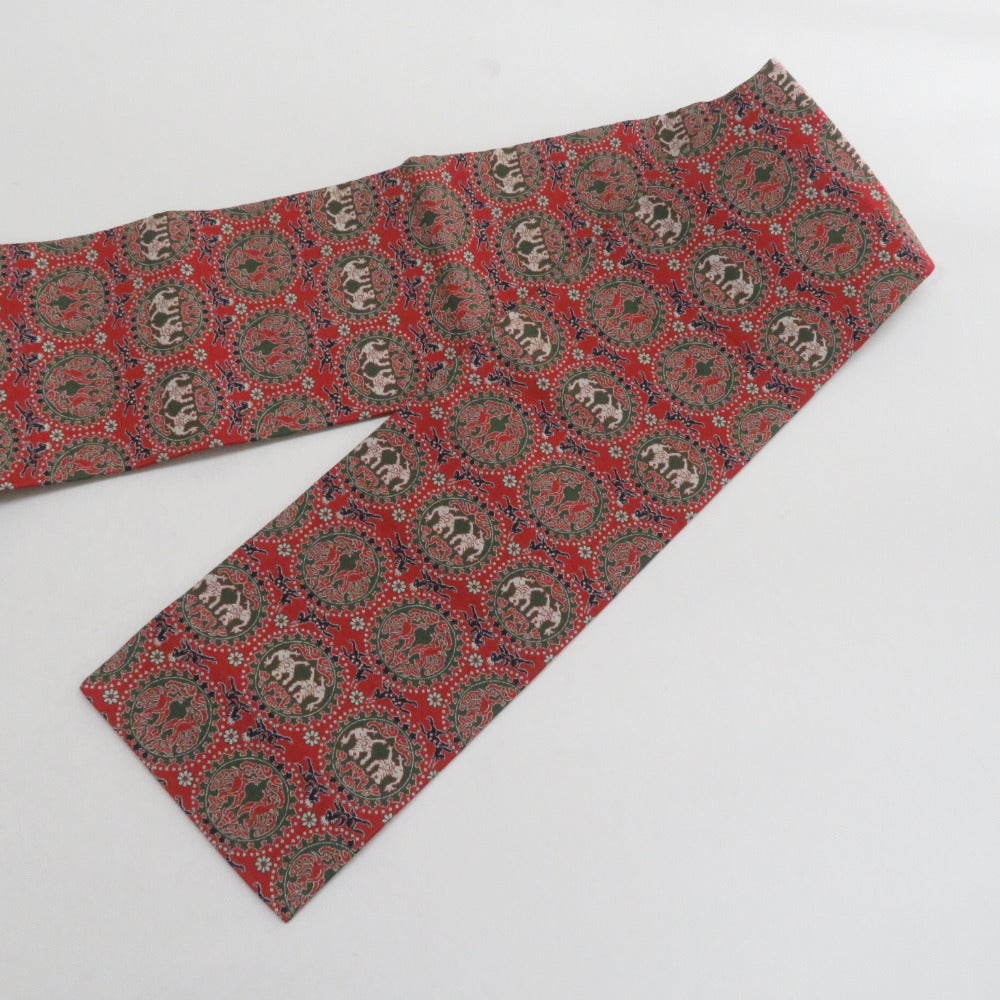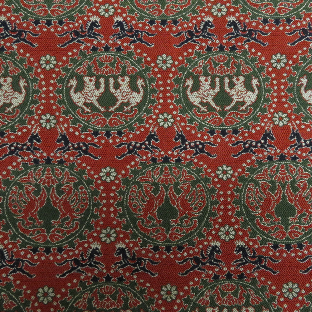 名古屋帯 朱色x緑色x紺色 正倉院模様 馬に丸文に白虎と朱雀 全通柄 正絹 カジュアル 仕立て上がり 着物帯 長さ334cm