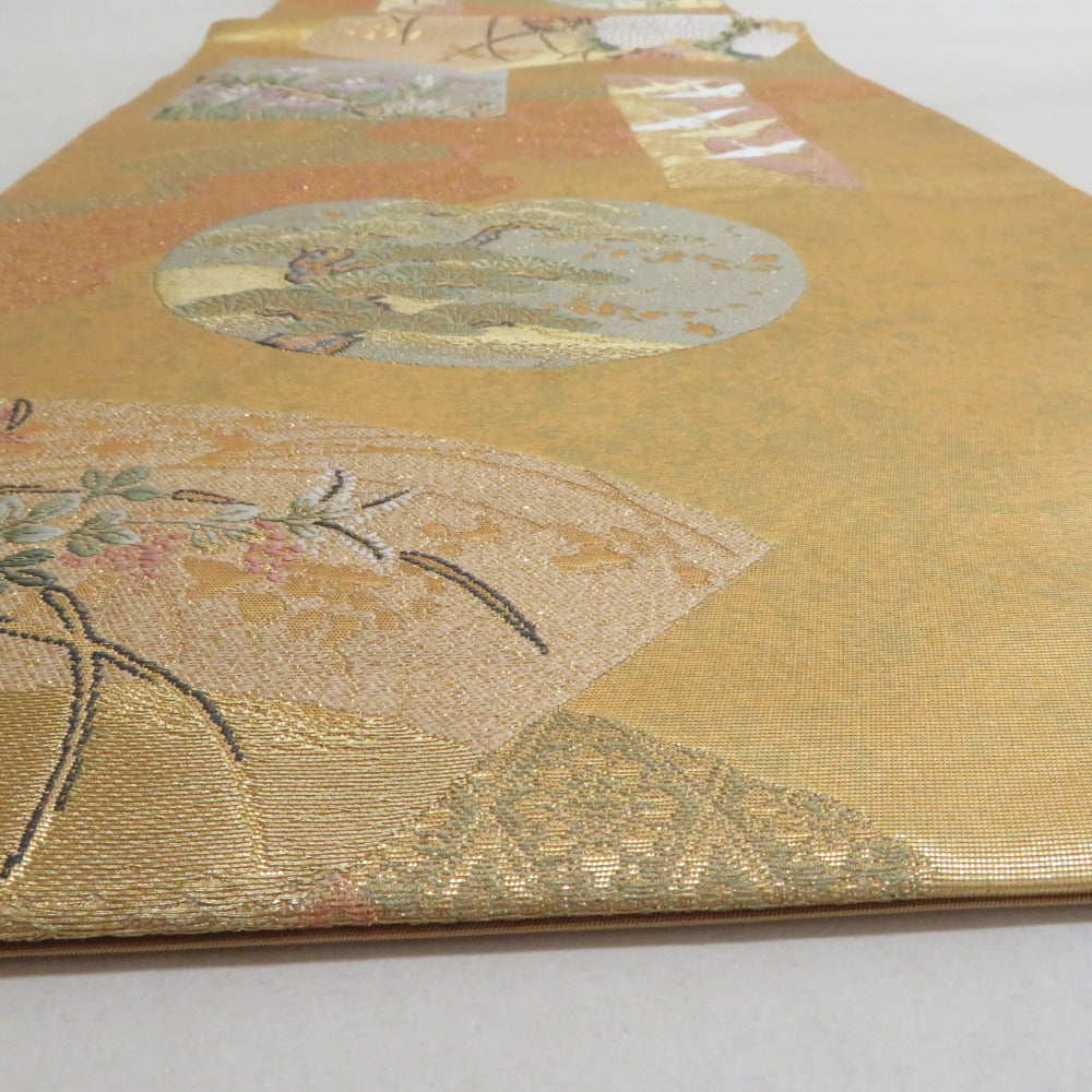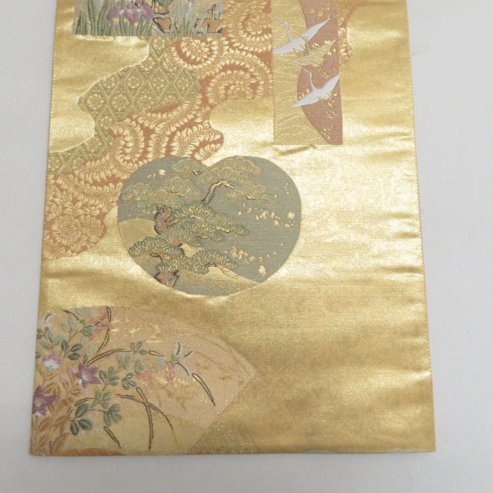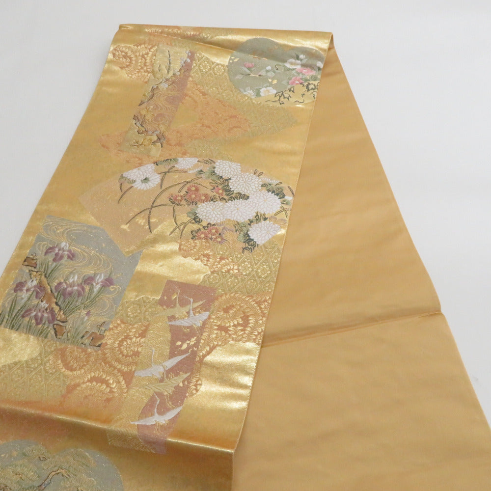 袋帯 正絹 ゴールド系 金色x多色 琳派文様 六通柄 フォーマル 仕立て上がり 着物帯 長さ440cm