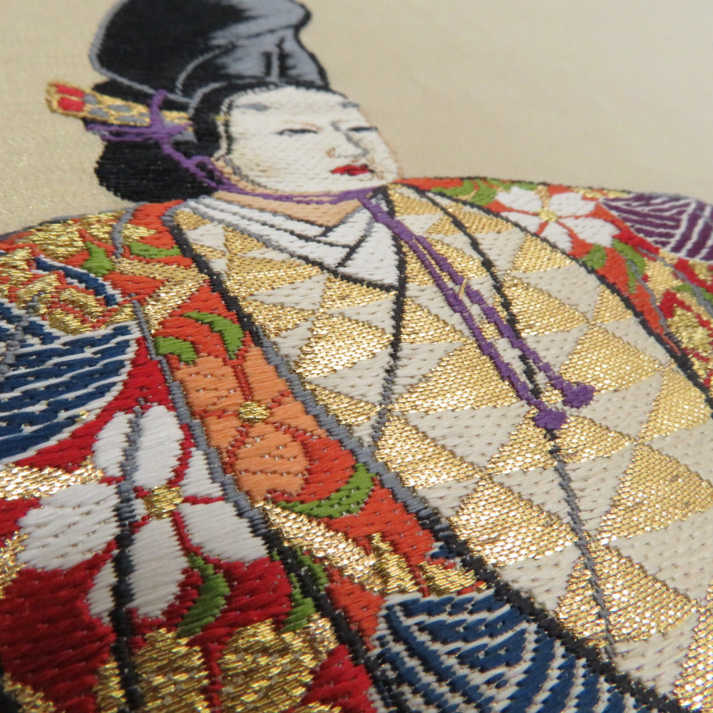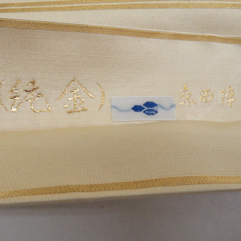 袋帯 正絹 京西陣手織唐織 五天謹織 唐錦 ベージュ色x金色x多色 能柄 お太鼓柄 仕立て上がり 着物帯 長さ440cm