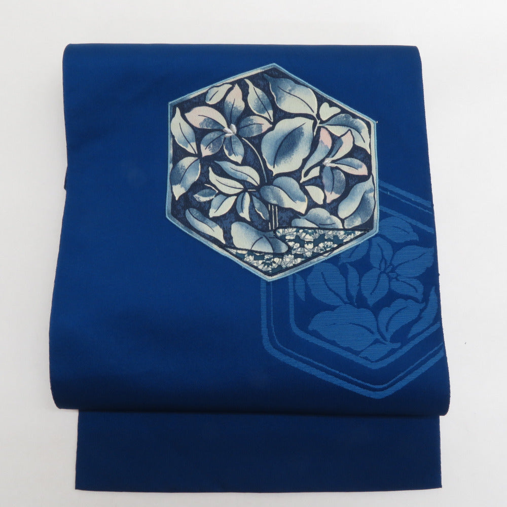 名古屋帯 ポリエステル 青色x白色 お太鼓柄 六角形に花文様 カジュアル 仕立て上がり 着物帯 長さ352cm