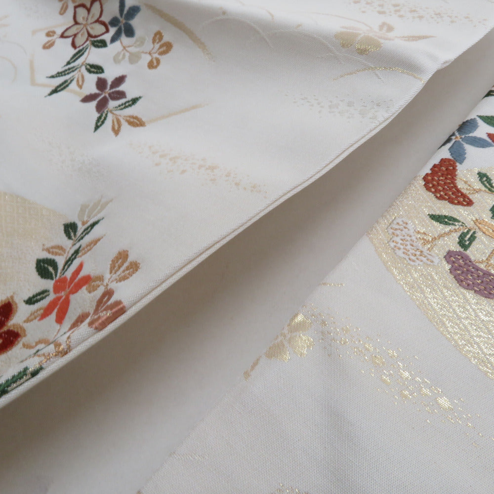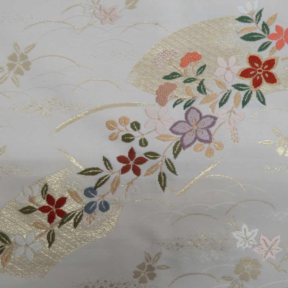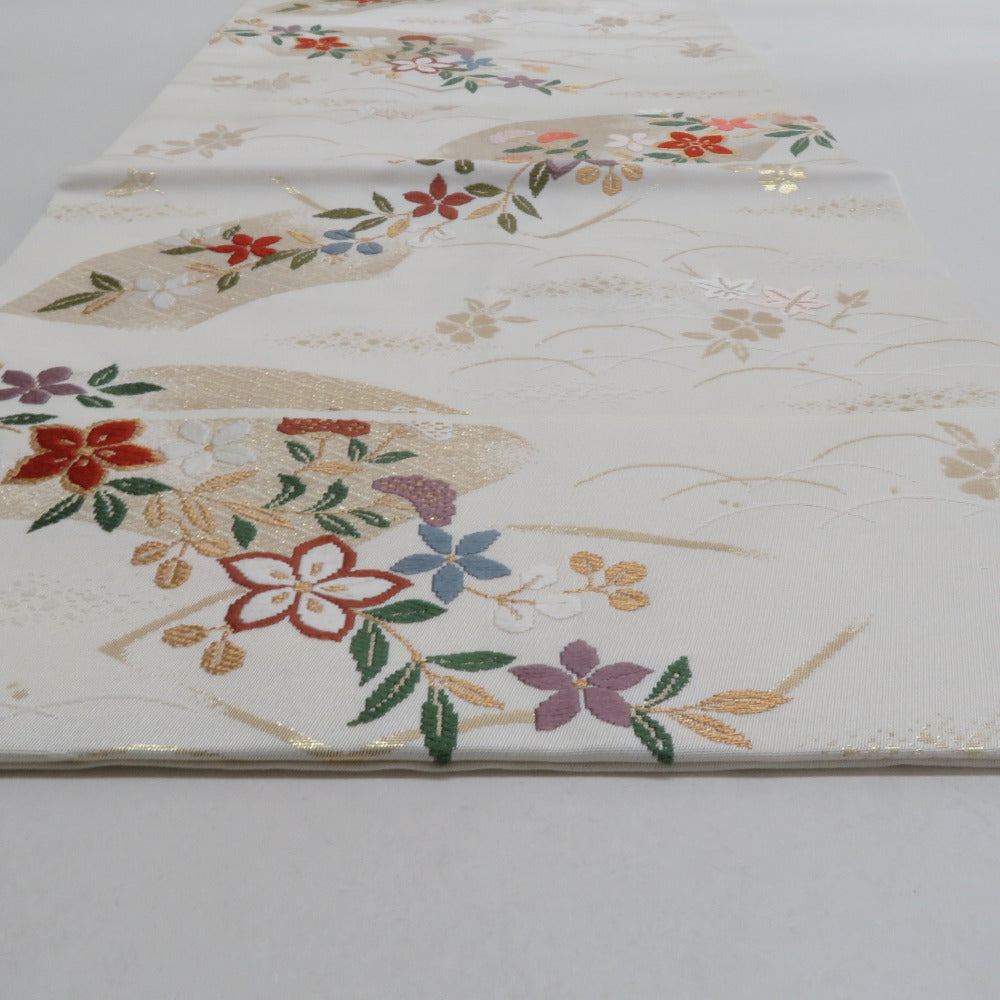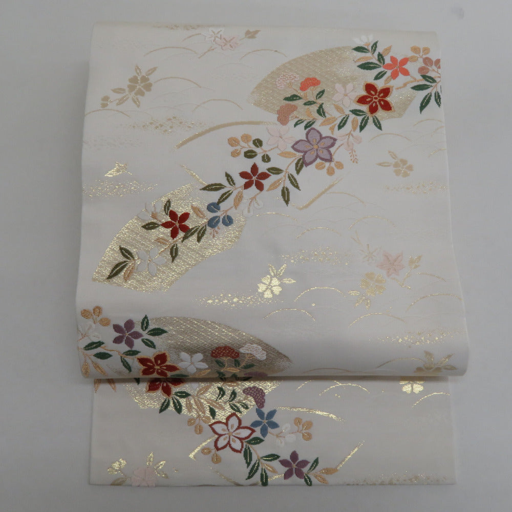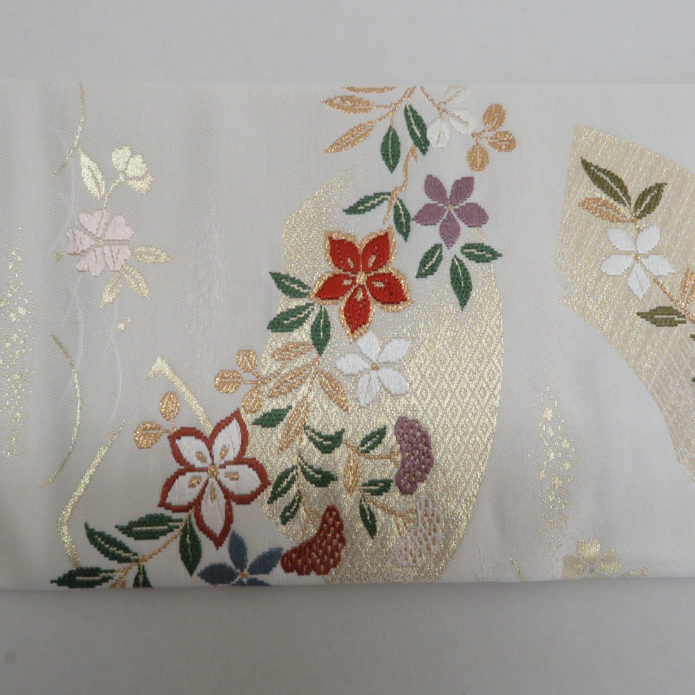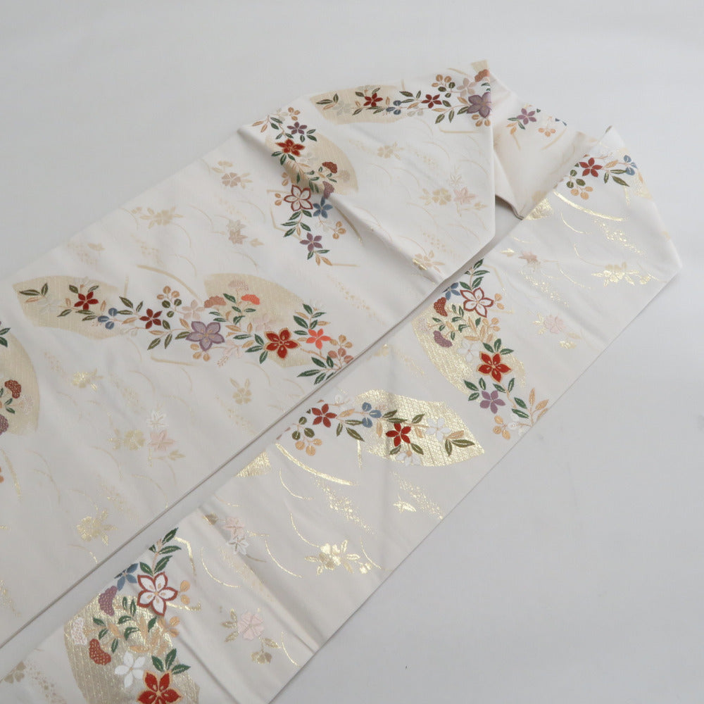 Title Japanese Kimono Nagoya Obi Silk Small floral pattern on a folding fan White