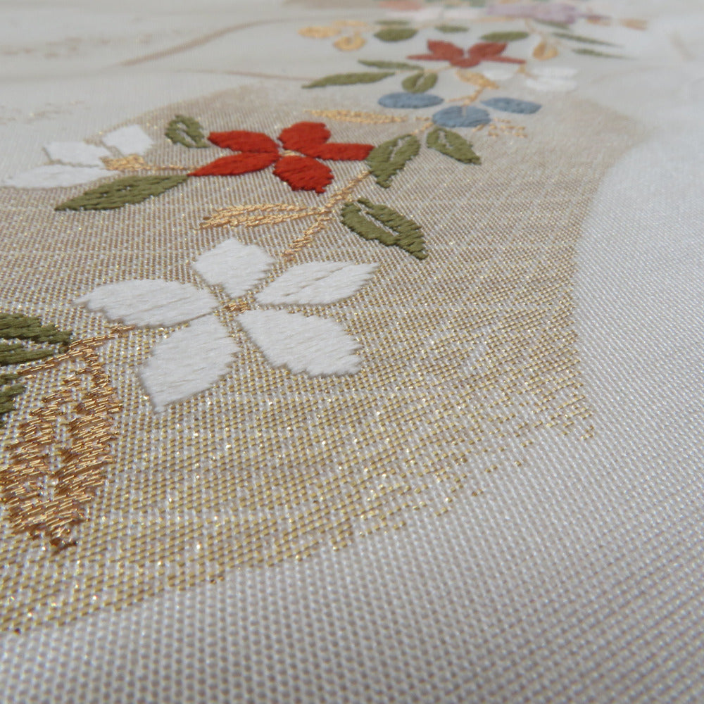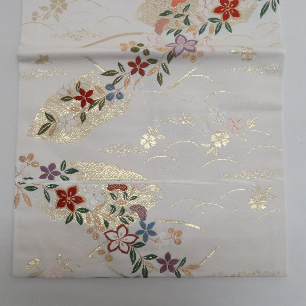 名古屋帯 正絹 白色x金色 金糸 地紙文に小花文様 六通柄 仕立て上がり 着物帯 長さ354cm