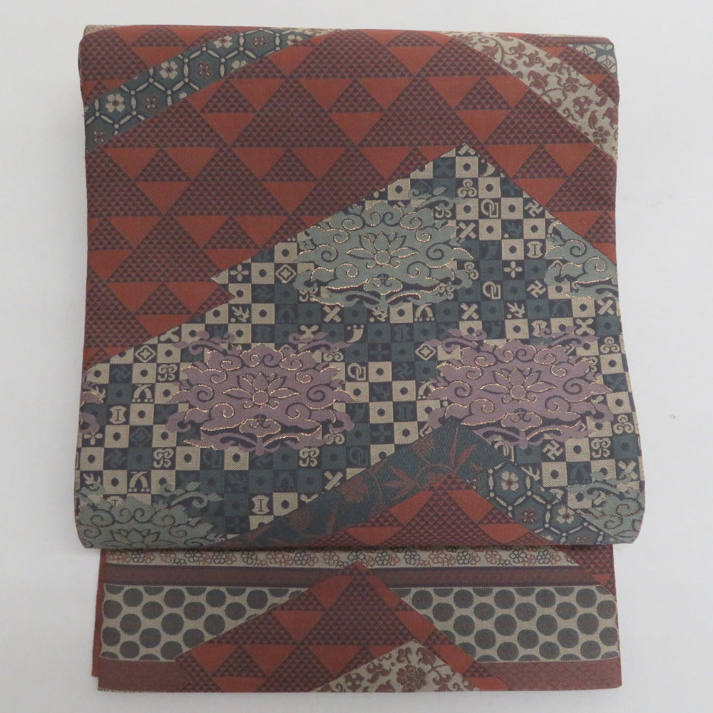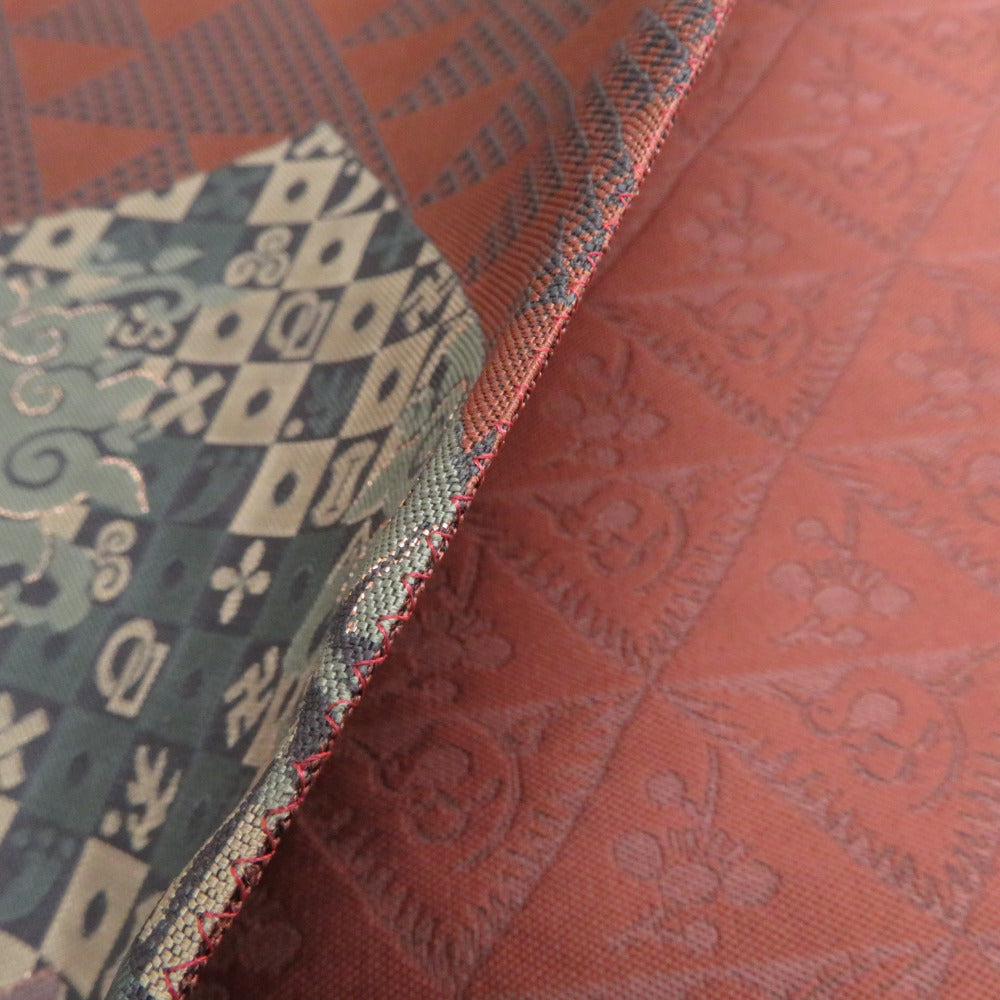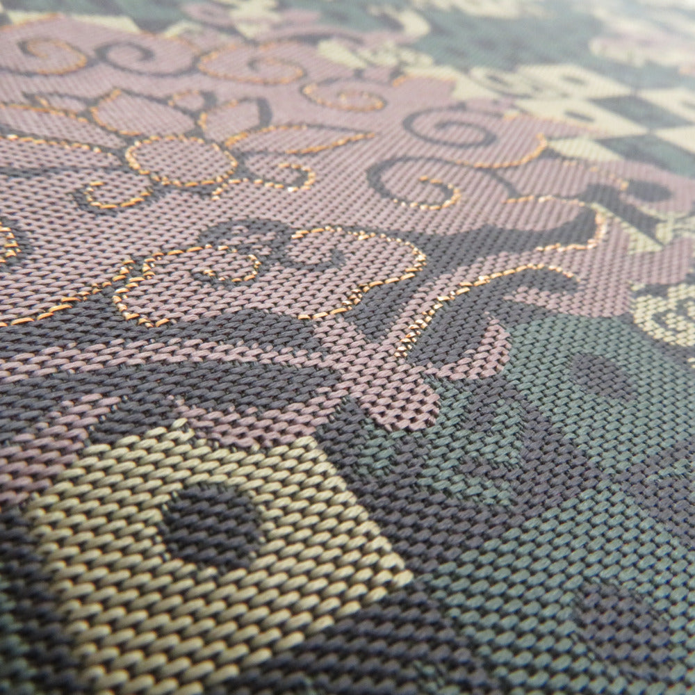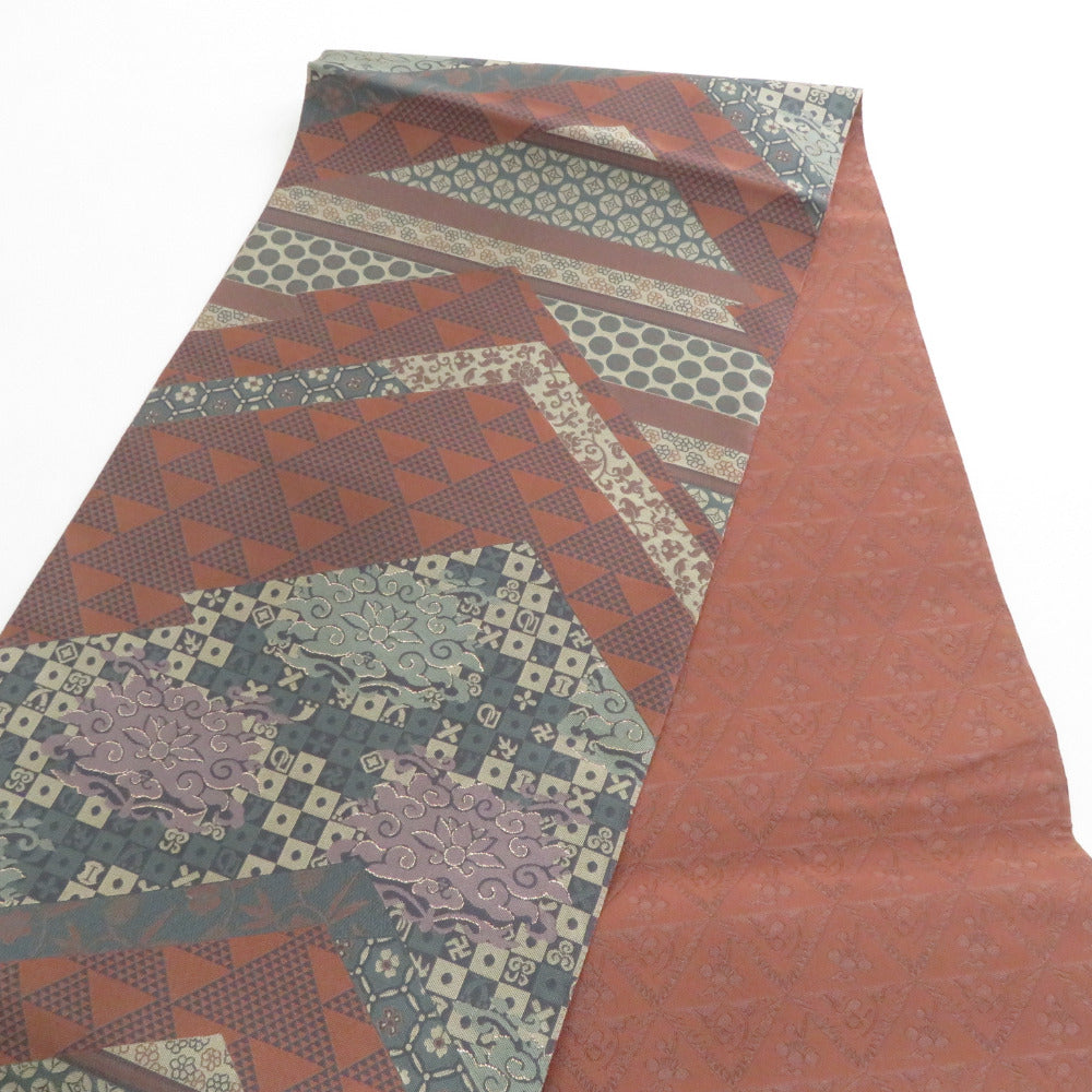 袋帯 洒落袋帯 紹巴織 正絹 金糸 名物裂紋様 茶色x薄紫色x緑色 全通柄 仕立て上がり 着物帯 長さ440cm