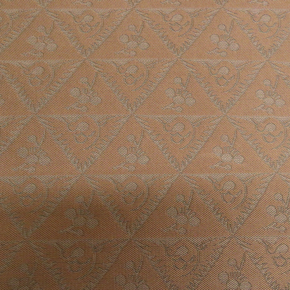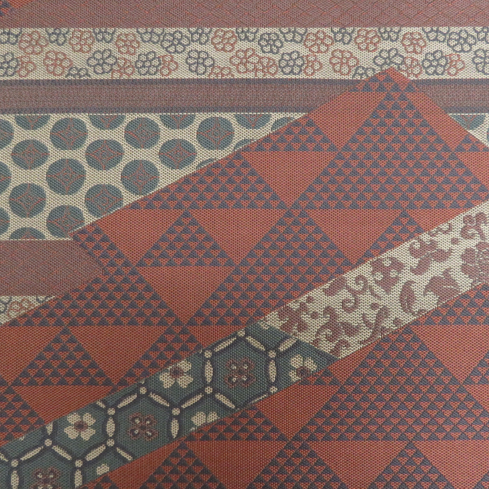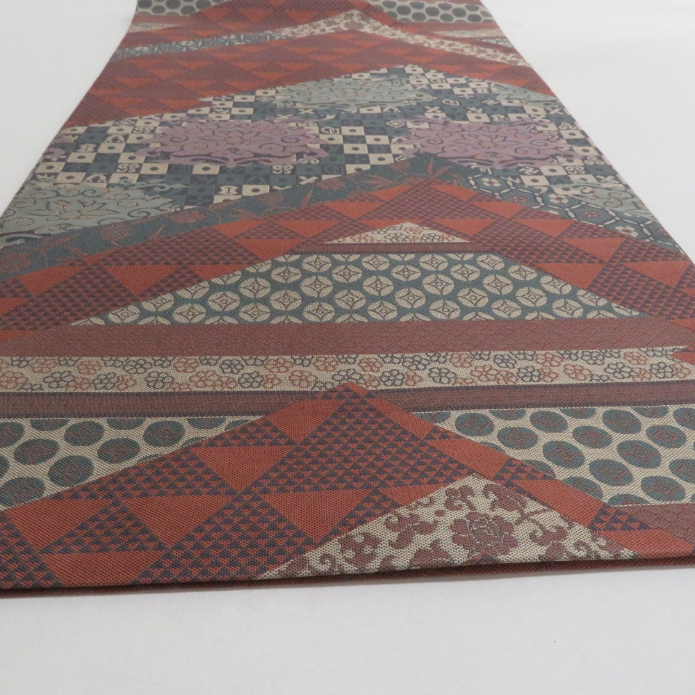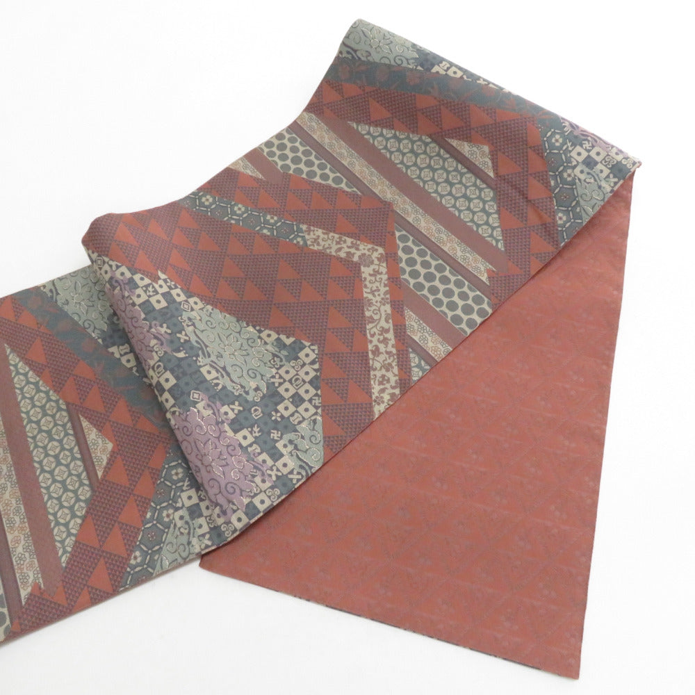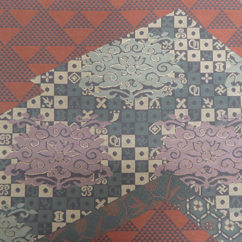 袋帯 洒落袋帯 紹巴織 正絹 金糸 名物裂紋様 茶色x薄紫色x緑色 全通柄 仕立て上がり 着物帯 長さ440cm