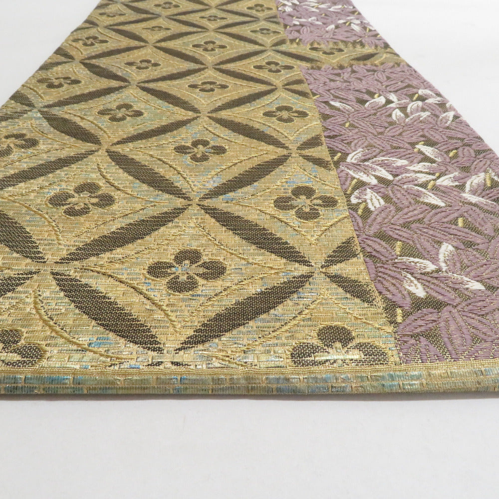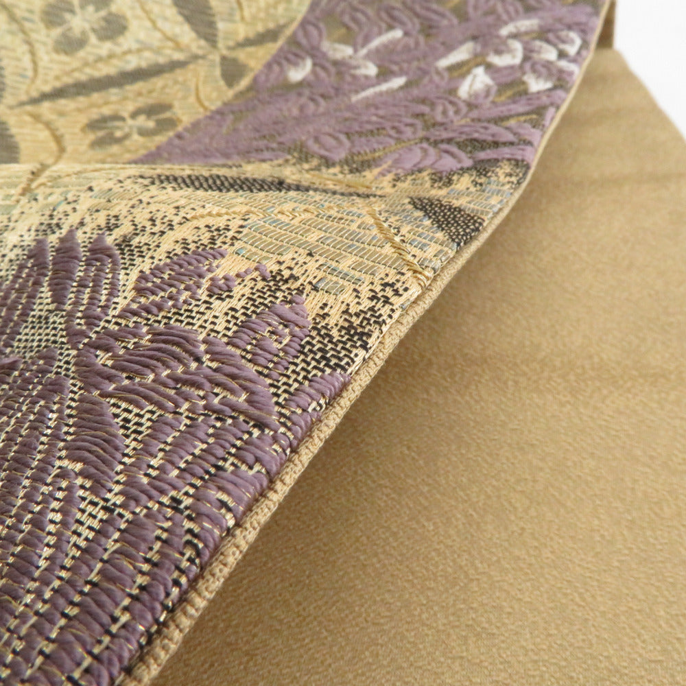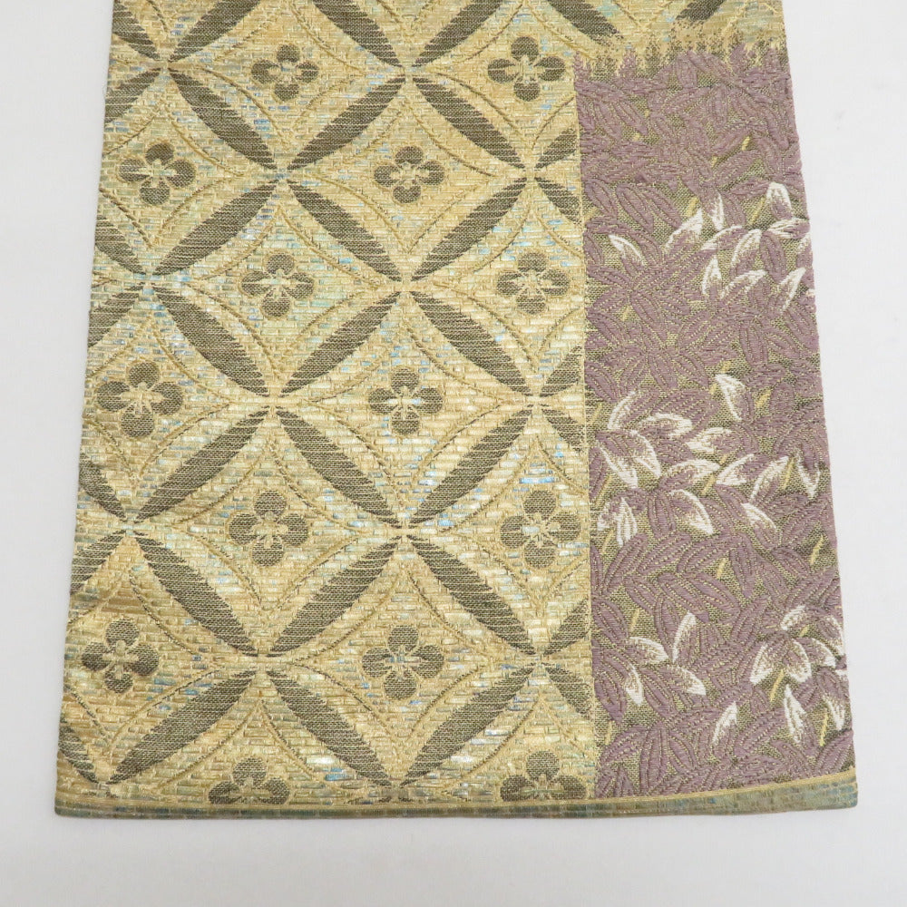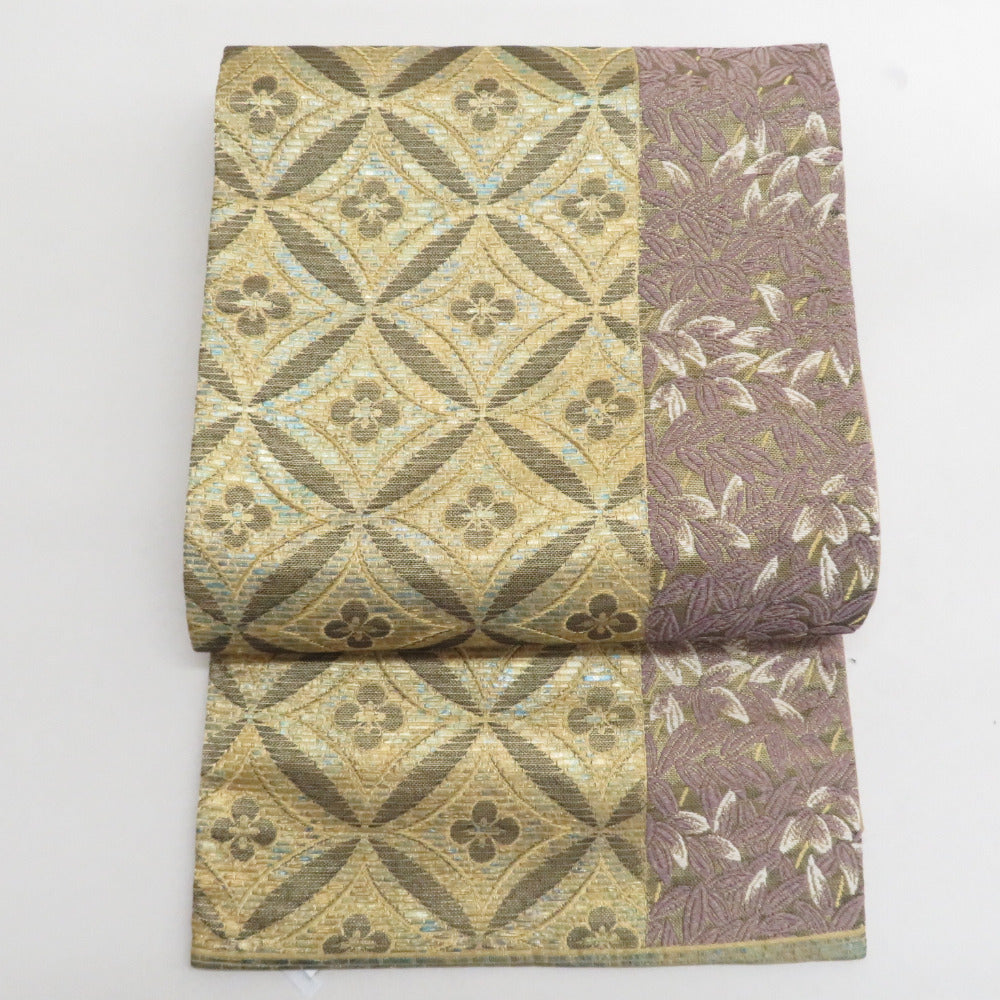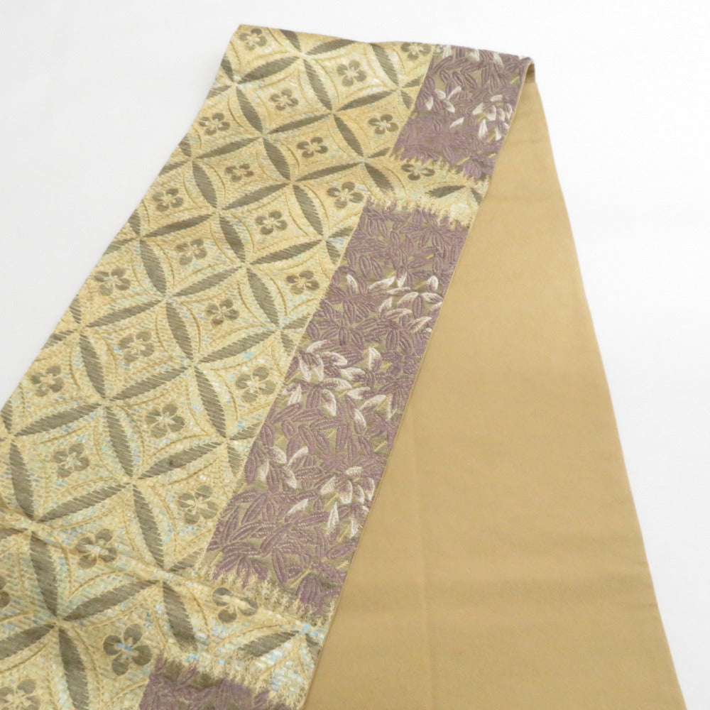 袋帯 金糸 ゴールド系 六通柄 七宝に植物紋様 金色x薄紫色 フォーマル向け 仕立て上がり 着物帯 長さ440cm