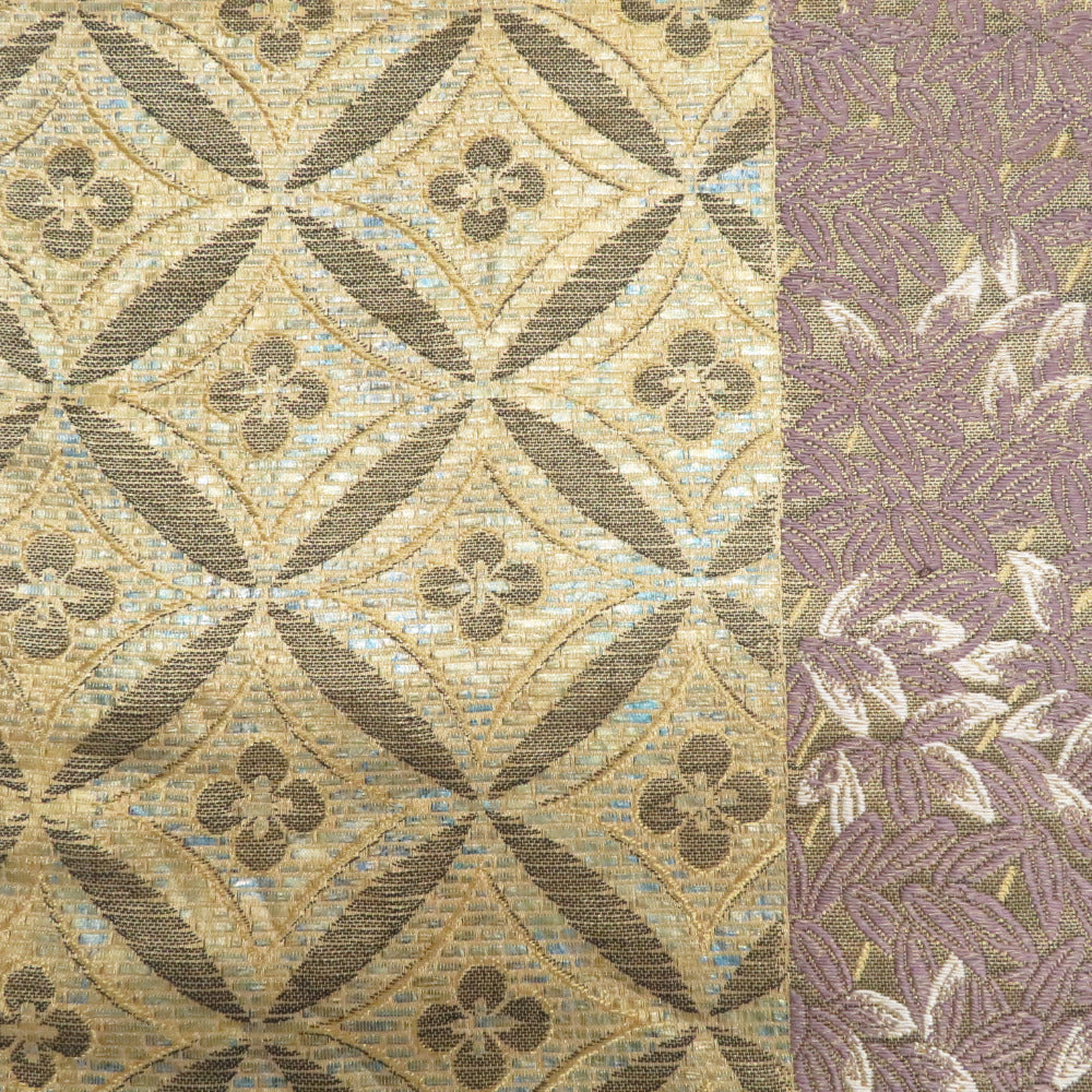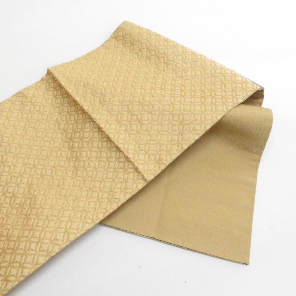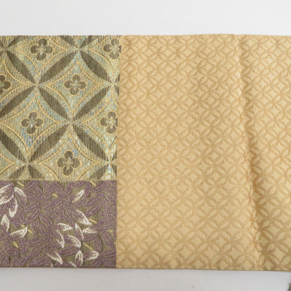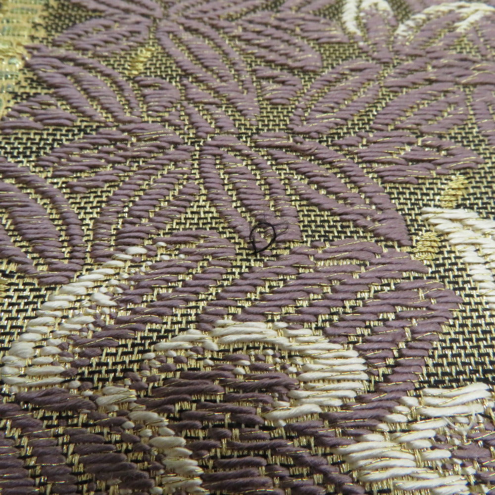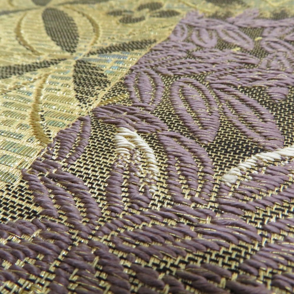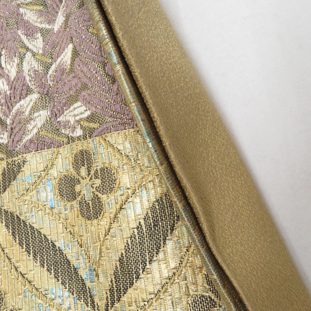 袋帯 金糸 ゴールド系 六通柄 七宝に植物紋様 金色x薄紫色 フォーマル向け 仕立て上がり 着物帯 長さ440cm