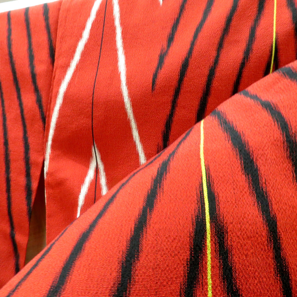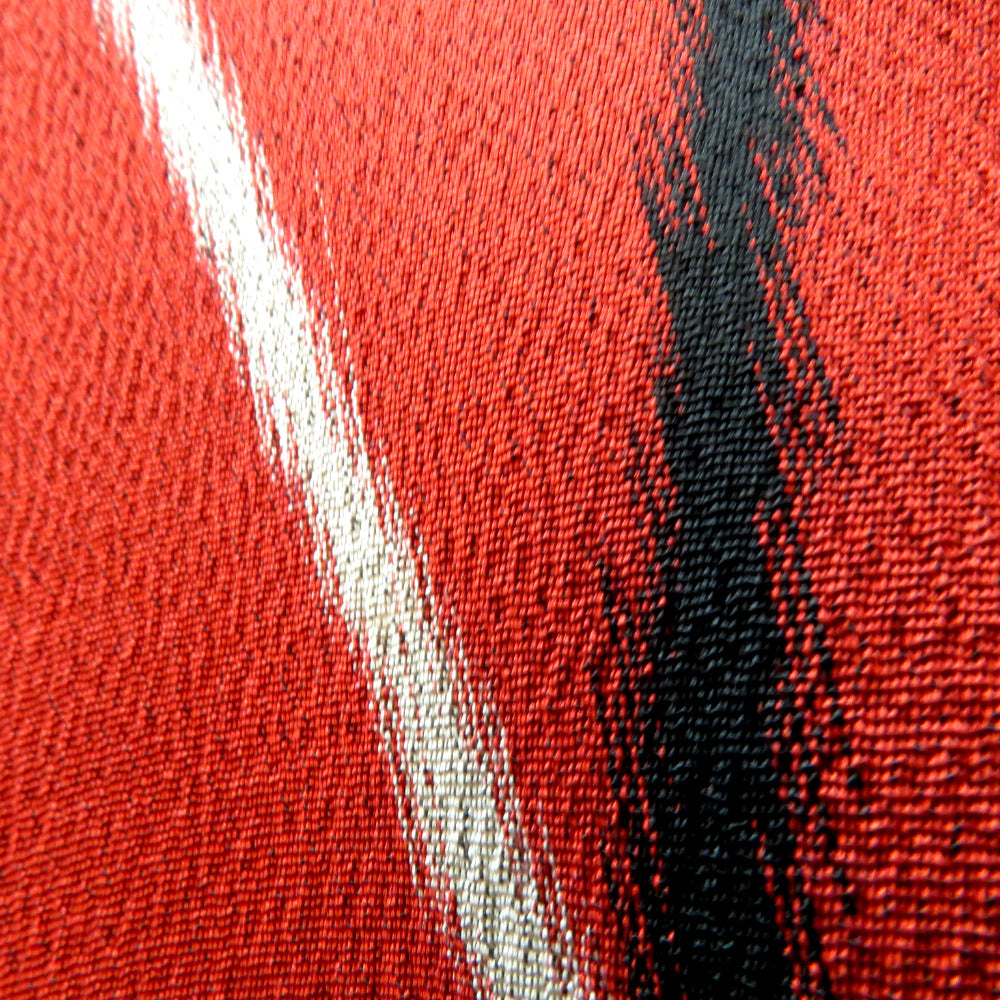 赤地で、黒・グレー・カラシ色で太細縞の幾何学文様入り。