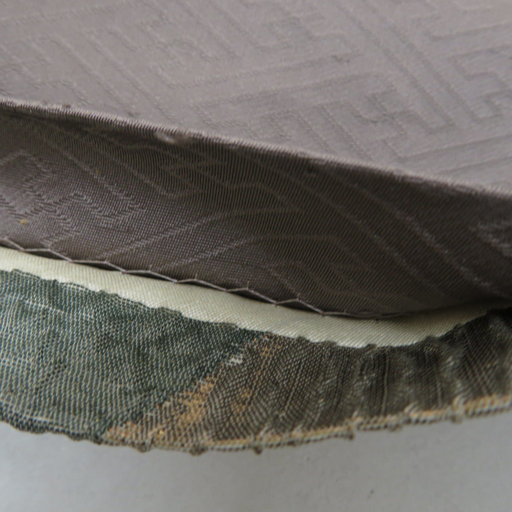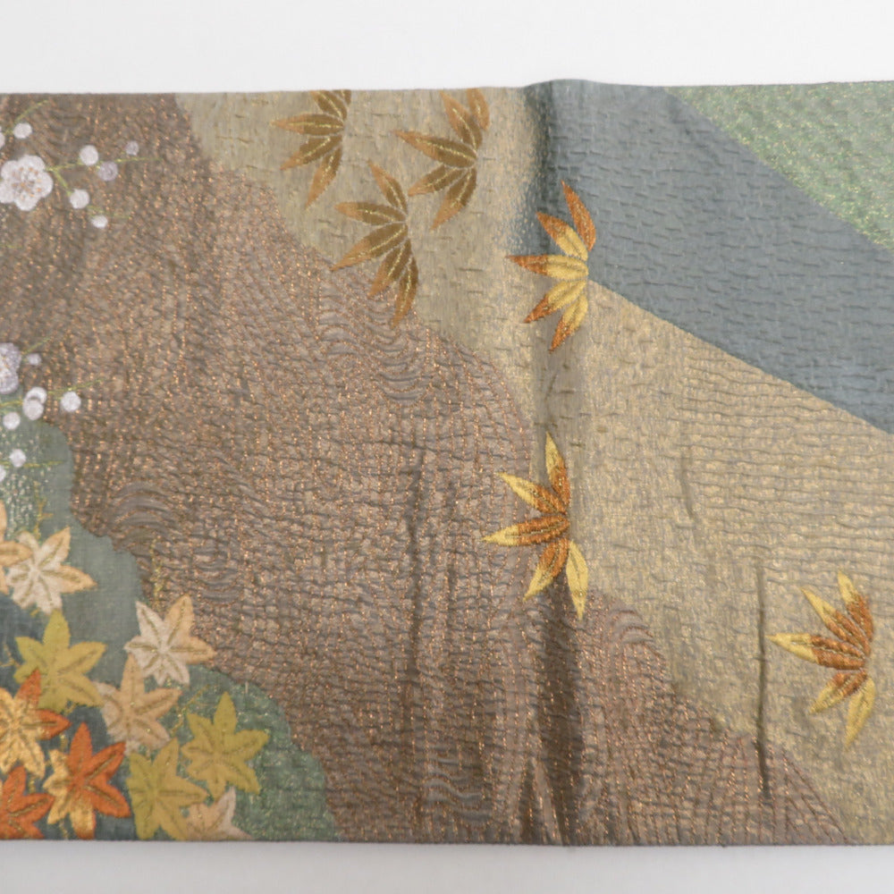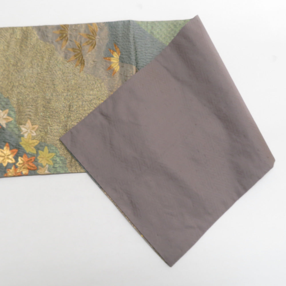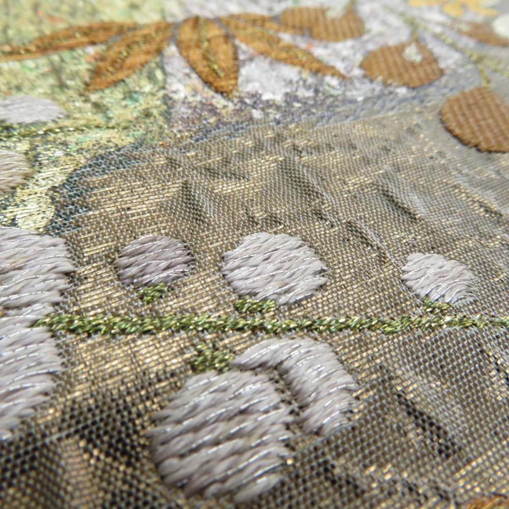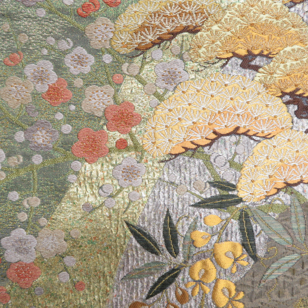 袋帯 正絹 纐纈 ふくれ織 金色x緑色x黄色x多色 四季紋様 お太鼓柄 仕立て上がり 着物帯 長さ440cm