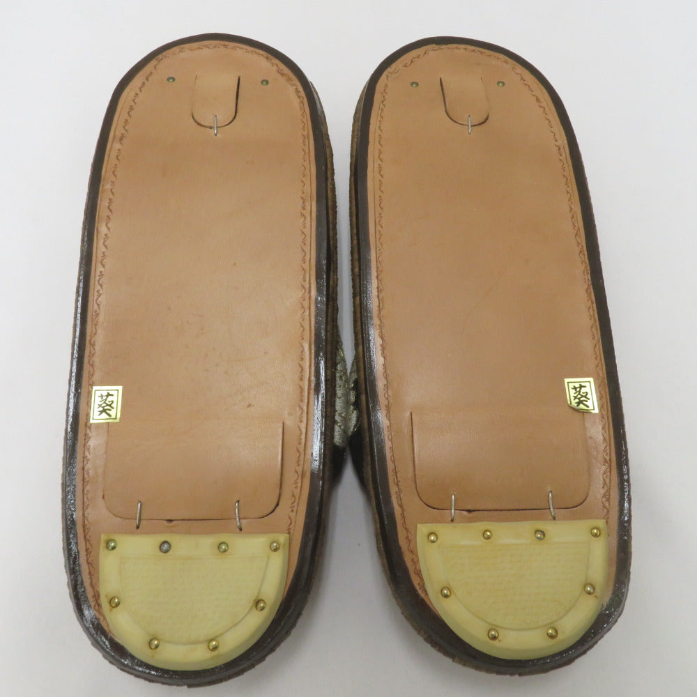 ダークブラウンの台にモノトーンの刺しゅうの鼻緒が落ち着いた雰囲気のお品です。
